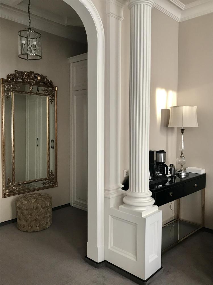 На первом ярусе располагаются диван, кресла, стол и стулья для столовой и гостевой санузел. Этот ярус оборудован телефоном, спутниковым телевидением, Wi-Fi доступом в интернет, мини-баром, сейфом, кофейным и чайным набором с чайником. На втором ярусе находятся большая спальня с двуспальной кроватью и балкон с видом на тихую улочку со старинными особняками, ванная комната с душем и сауной, фен и все необходимые аксессуары.