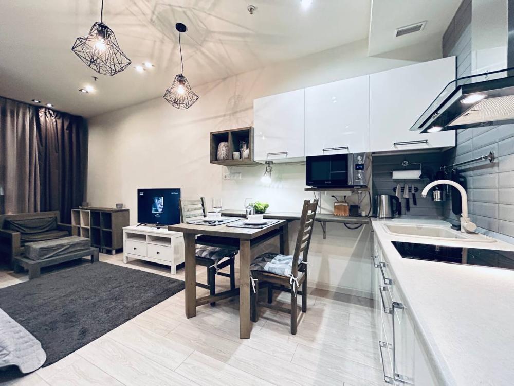 Апартаменты студия В ванной комнате есть фен, мыло, гель, зубная щетка и паста, полотенце для ног. В квартире двуспальная кровать, телевизор, оборудованная кухонная зона.
