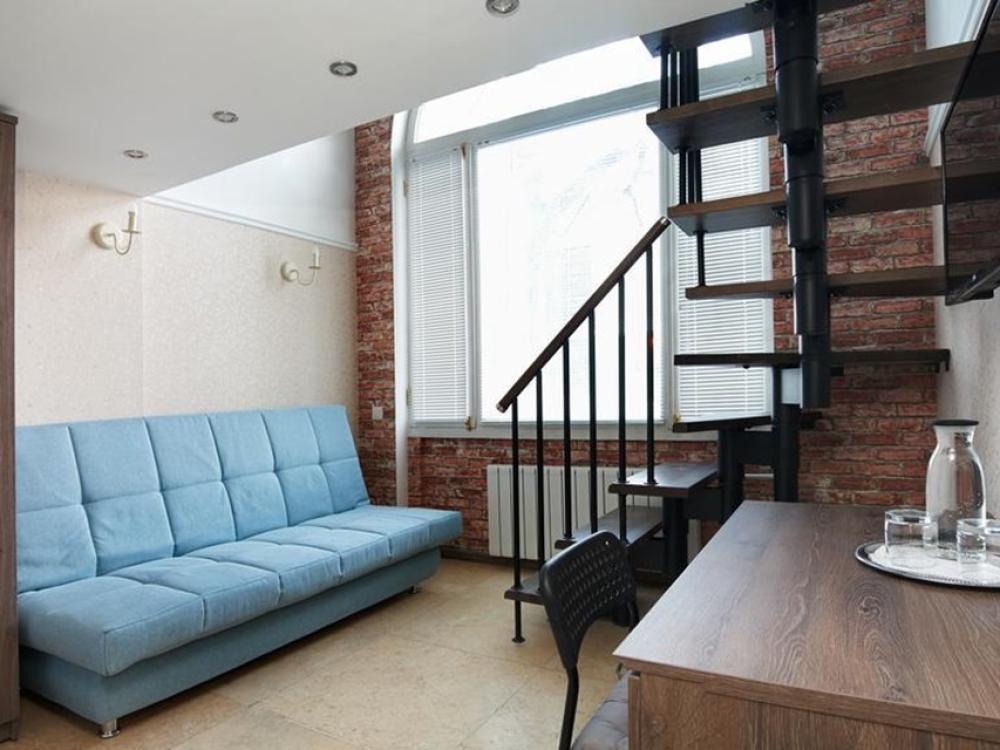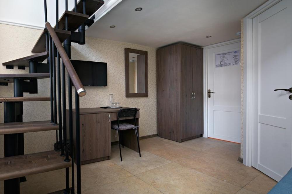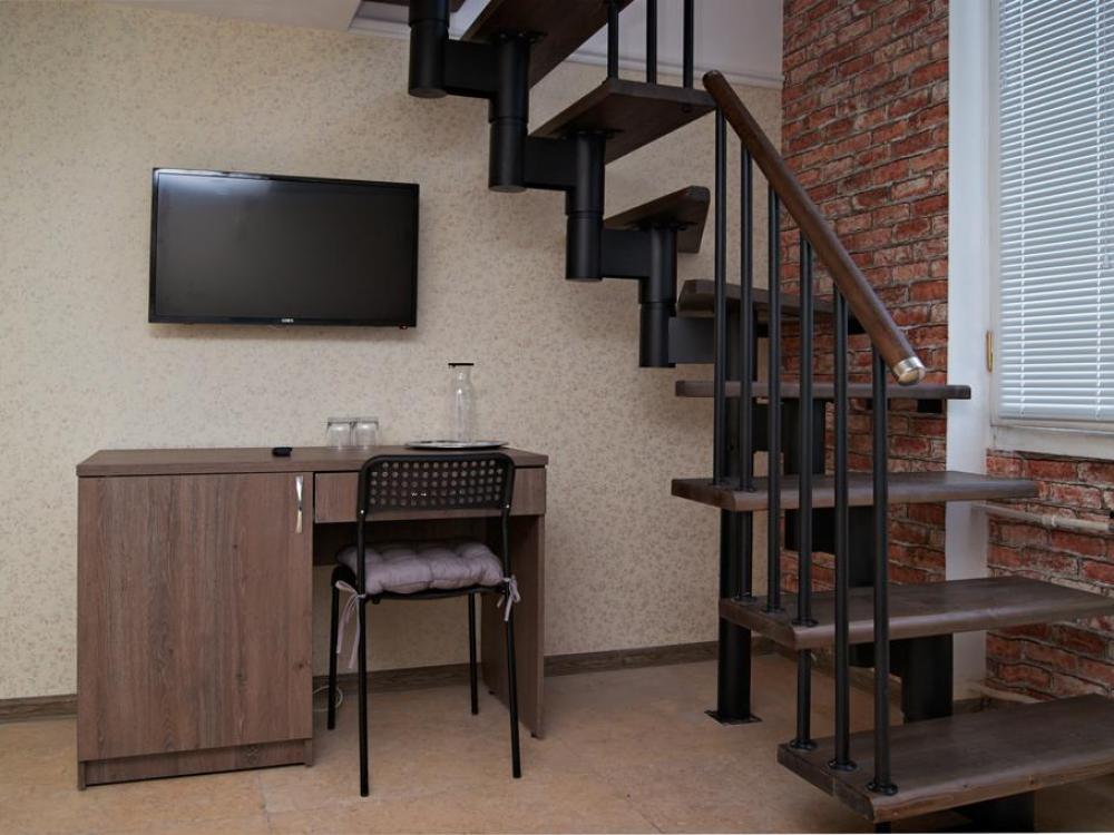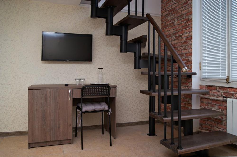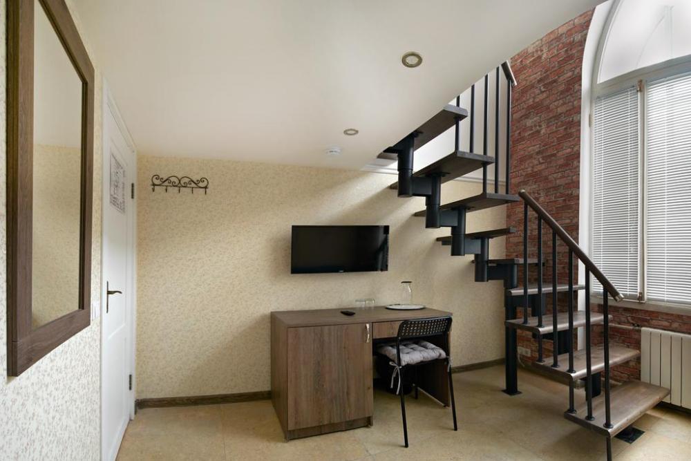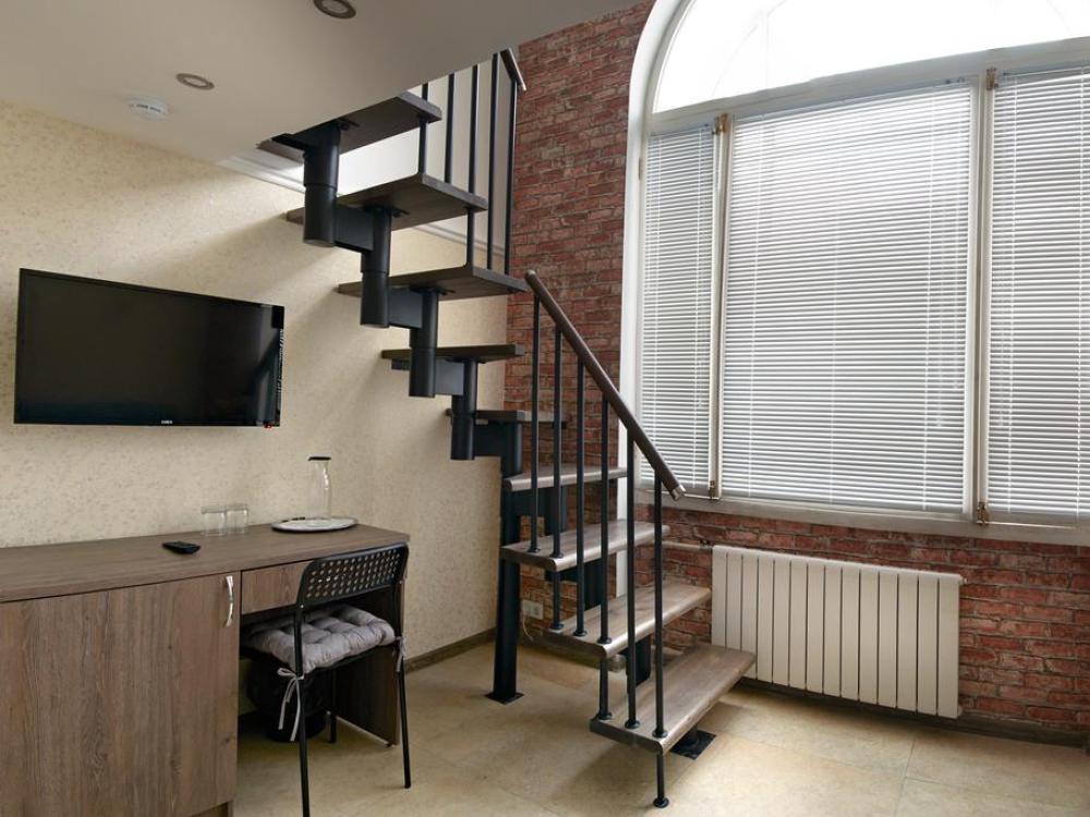 Двухуровневый номер люкс площадью 32 кв.м. В номере: диван, двухспальная кровать, мини-бар, телевизор, кондиционер, рабочий стол, гладильные принадлежности, шкаф или гардероб, ванная комната, халаты.