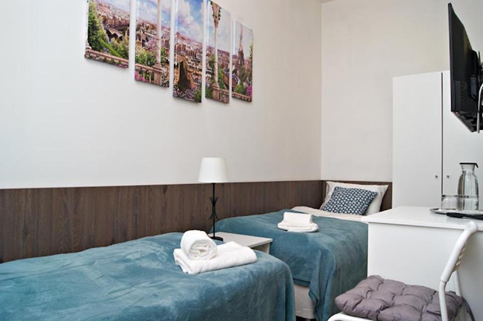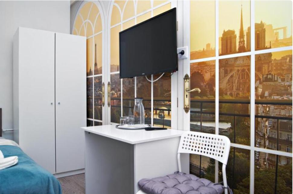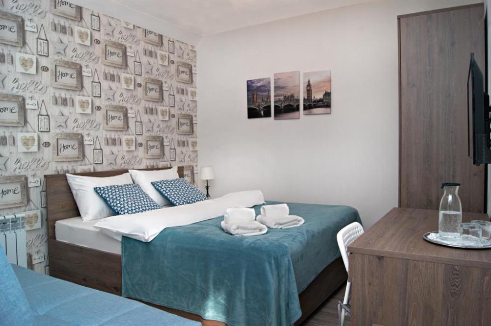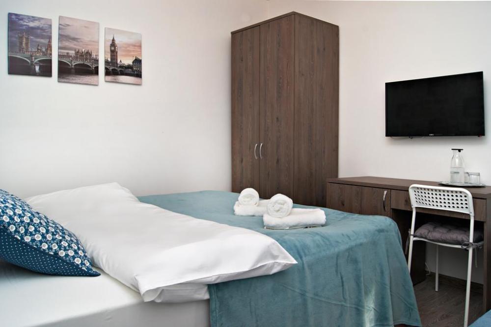 Звукоизолированный семейный номер стандарт с окном и отдельным входом общей площадью 18 кв.м. В номере двуспальная кровать, мини-бар, телевизор, кондиционер, рабочий стол, гладильные принадлежности, шкаф или гардероб, ванная комната.