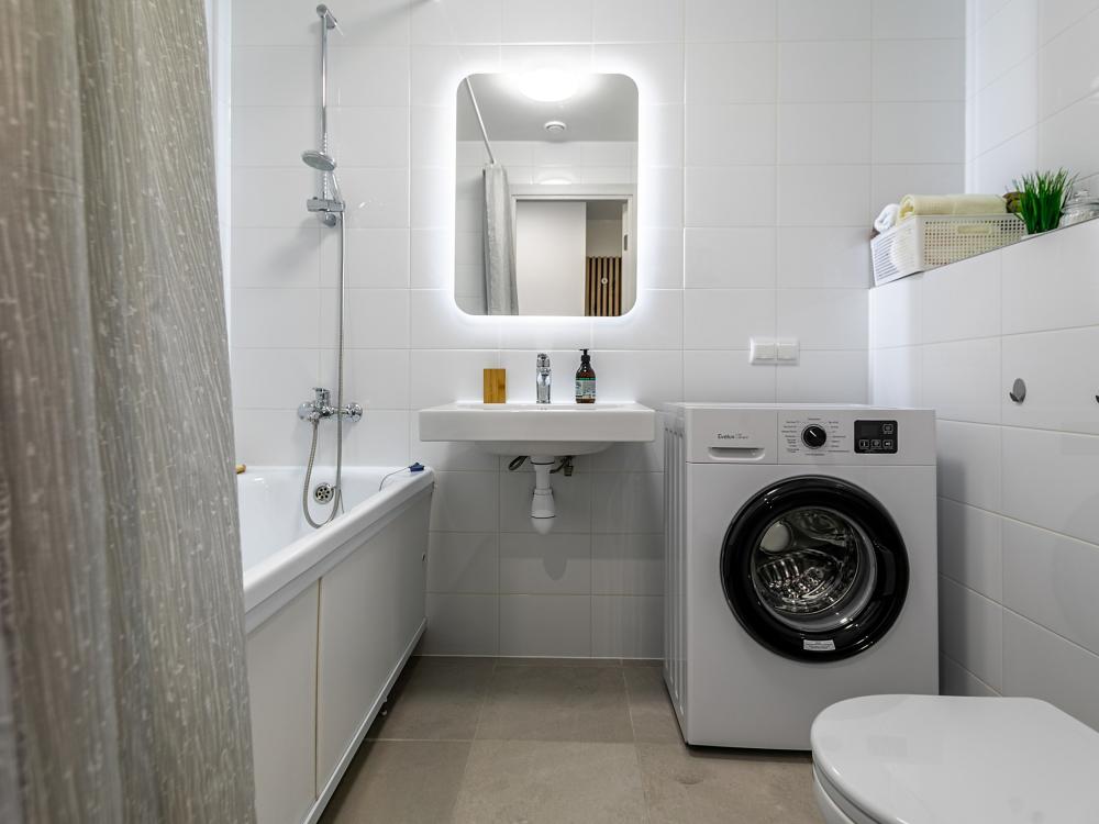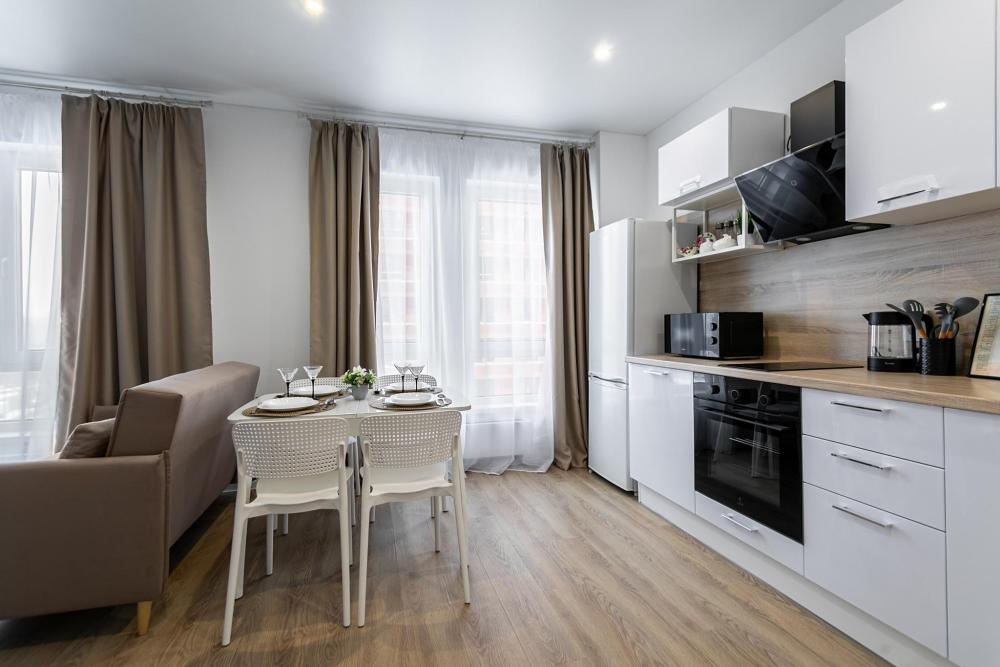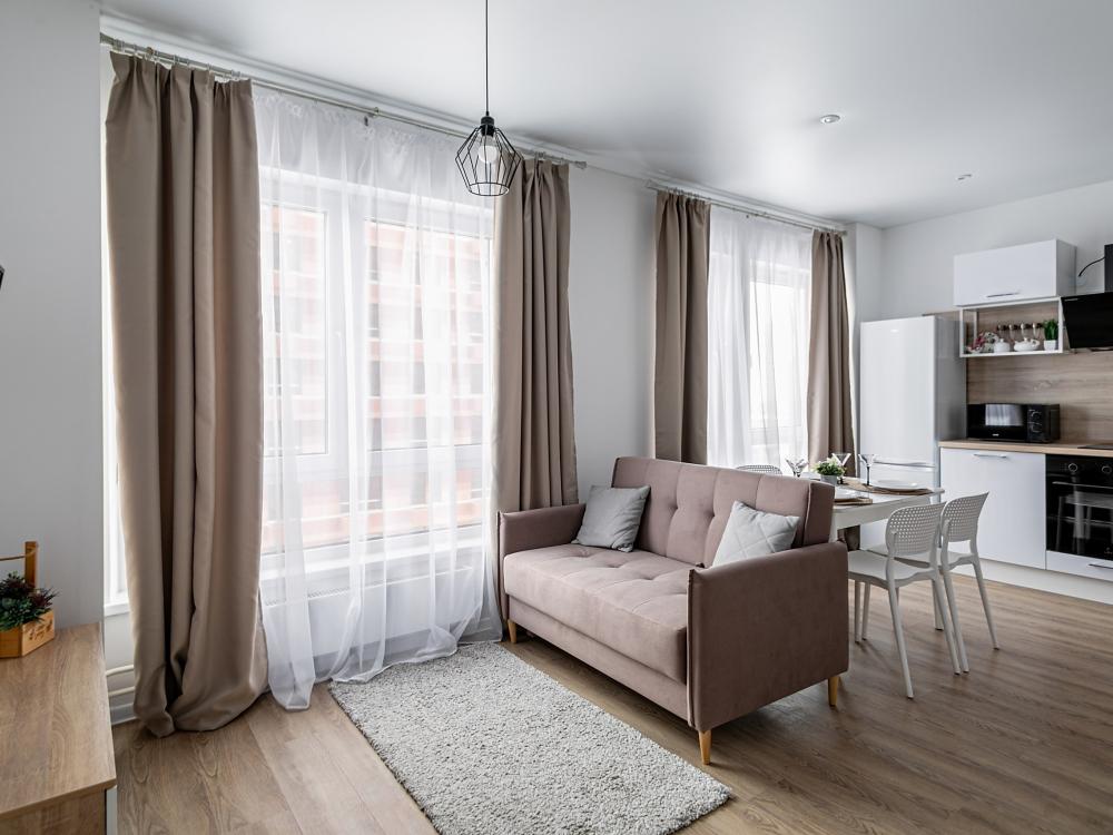 В апартаментах: 4 cпальных места (двуспальная кровать, двуспальный диван). Для удобства гостей: wi-fi и кабельное тв, подушки и тёплые одеяла, постельное белье, полотенца, набор средств личной гигиены. Плита, духовка, холодильник, микроволновка, посудомоечная машина, чайник, стиральная машина, телевизор, фен, утюг.