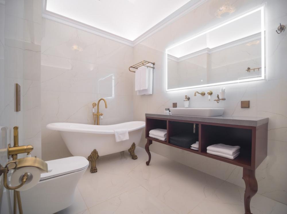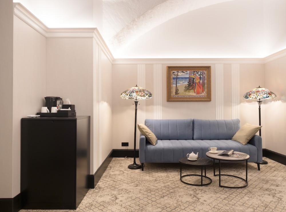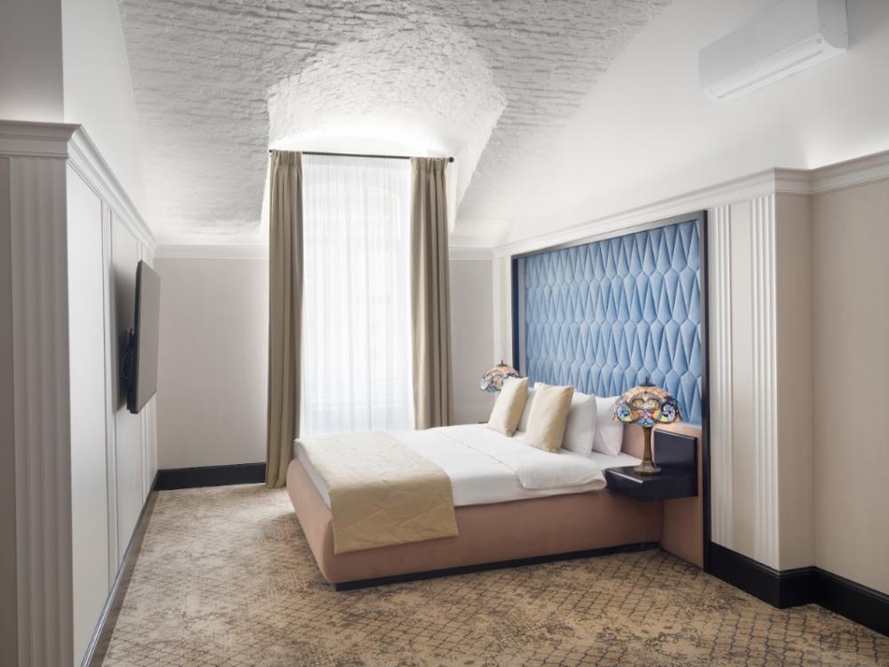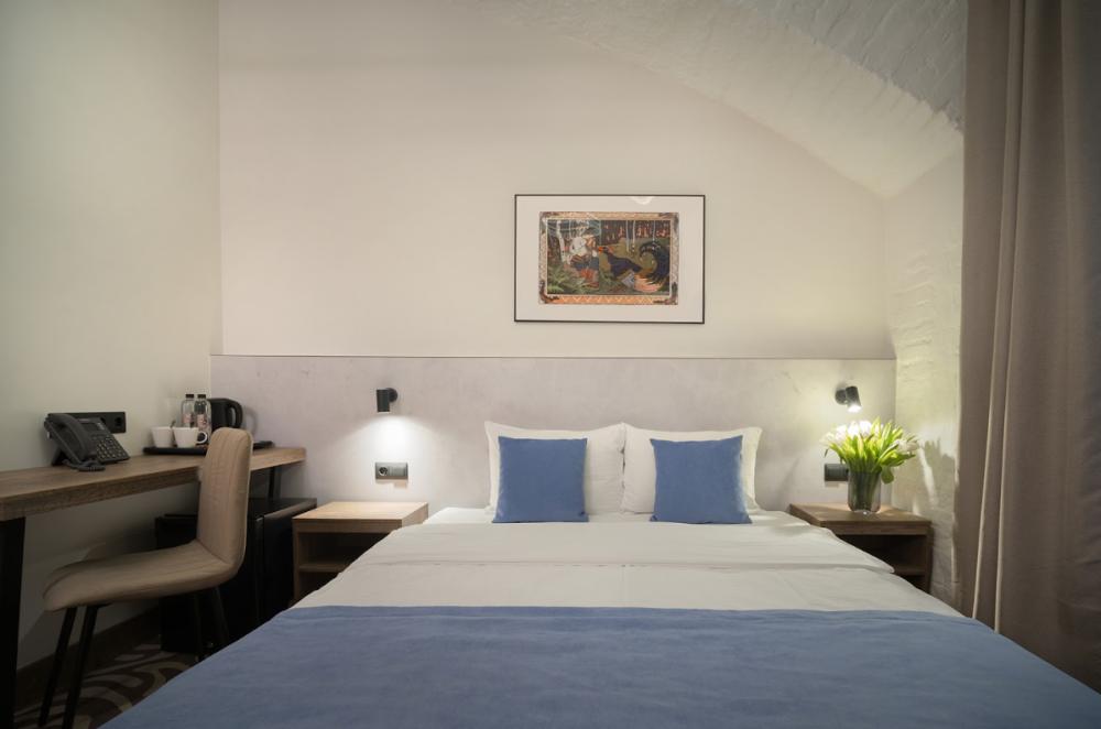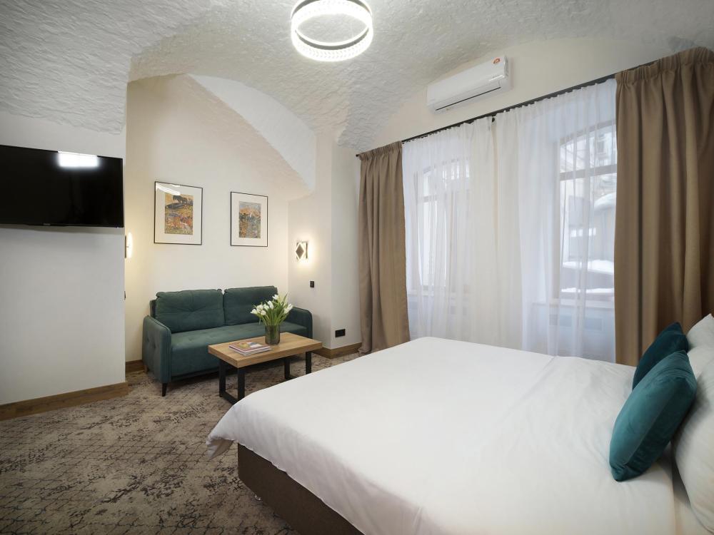 Просторный номер категории Делюкс уникальными арочными потолками и видом во внутренний двор отеля. В номере есть двуспальная кровать King-size и комфортный диван, на котором можно дополнительно разместить еще 2 человек. В ванной комнате находится душевая кабина и большое зеркало с подсветкой, а также мягкие махровые халаты, тапочки и косметические принадлежности.