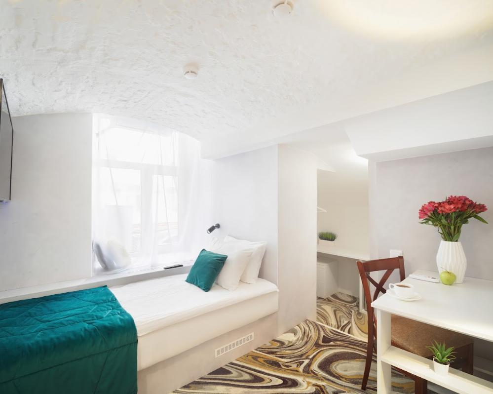 Камерный, уютный номер на первом этаже (вид на тихий внутренний дворик) с односпальной кроватью, прикроватной тумбочкой, письменным столом, телевизором, кондиционером, телефоном, сейфом, мини-холодильником, рожком для обуви, шкафом с плечиками, зеркалом, шторами. В номере санузел с душем, феном, комплектом полотенец, гигиеническими принадлежностями: шампунь, гель для душа, бальзам для волос, зубной набор, тапочки. Халаты и бритвенные наборы предоставляются бесплатно по запросу.