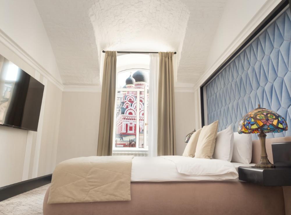 Просторный Люкс с уникальными арочными потолками и видом на исторический центр Москвы и храм "Соловецкое подворье". В номере есть двуспальная кровать King-size и комфортный диван, на котором можно дополнительно разместить еще 2 человек. В ванной комнате находится душевая кабина, белоснежная ванна и большое зеркало с подсветкой, а также мягкие махровые халаты, тапочки и косметические принадлежности.