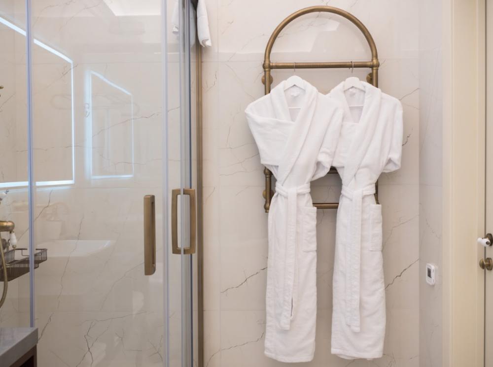 Двуспальная кровать трансформер, 2 прикроватные тумбочки, журнальный столик, 2 кресла, 2 стула, раскладной диван, торшер, телевизор, телефон, сейф, мини-холодильник, рожок для обуви, губка для обуви, тапочки, большое зеркало, микроволновая печь, плечики для одежды, вешалка, шкаф, шторы black out, вид во внутренний двор. Отдельный санузел с душем (большое, среднее полотенце для каждого гостя и полотенце для ног, гигиенические принадлежности, зеркало, косметическое зеркало, фен, раковина, туалет). Номер имеет дополнительный вход с улицы.