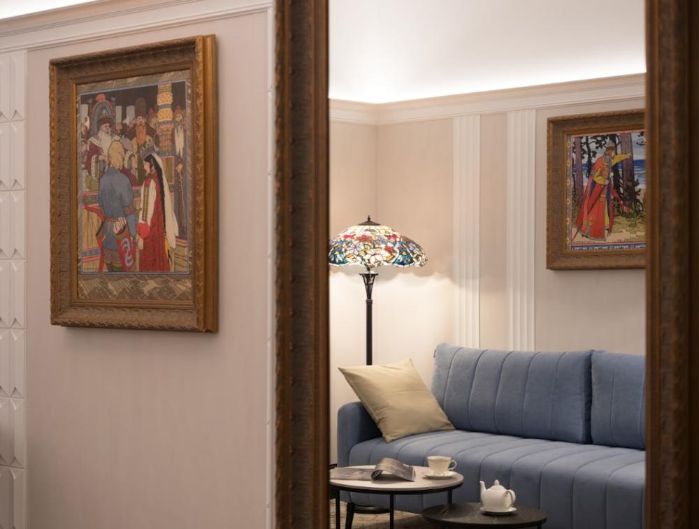 Люкс "Царский" - самый просторный и комфортабельный номер с видом на храмовый комплекс "Соловецкое подворье" и историческую улицу Садовническую. Отдельной зоной выделена гостиная с декоративным камином и раскладывающимся диваном, который позволяет разместить до 4 человек. В номере также есть двуспальная кровать размера King-size и обеденная зона. Интерьер дополняют уникальные светильники и панно ручной работы, репродукции картин Ивана Билибина. В ванной комнате помимо душевой кабины есть просторная ванна. Теплый пол, а также махровые халаты и тапочки сделают Ваше пребывание действительно царским!
