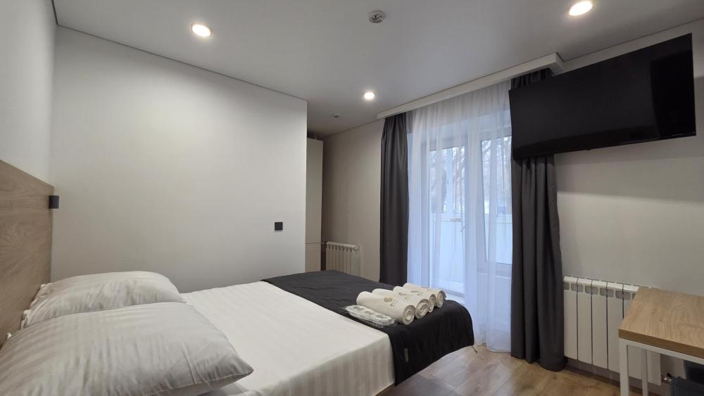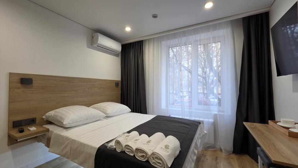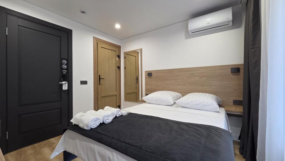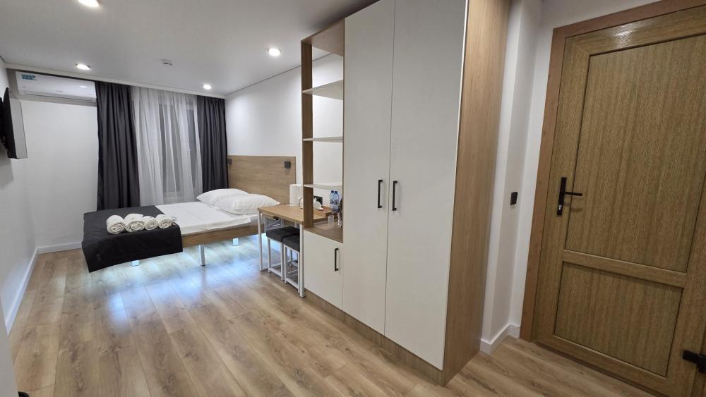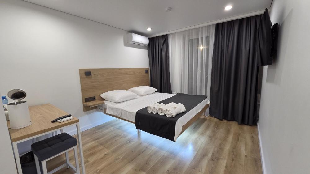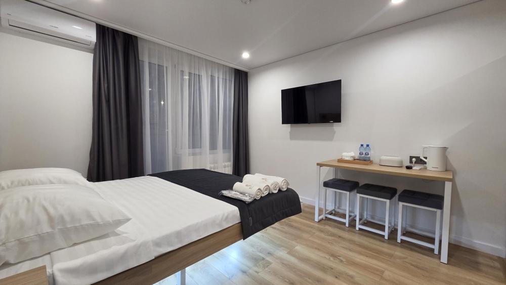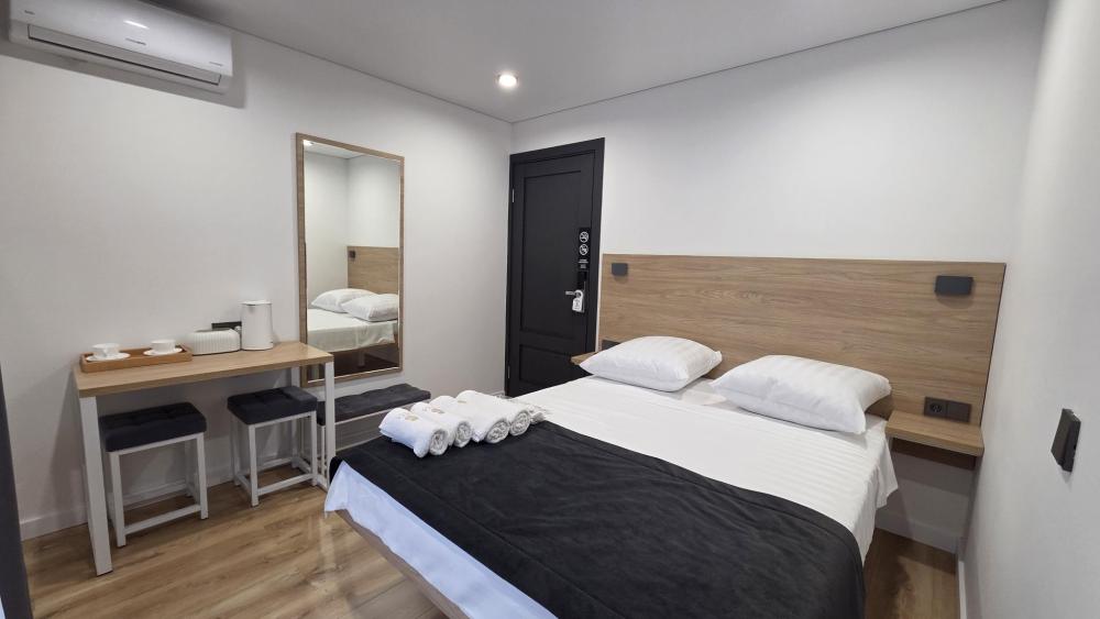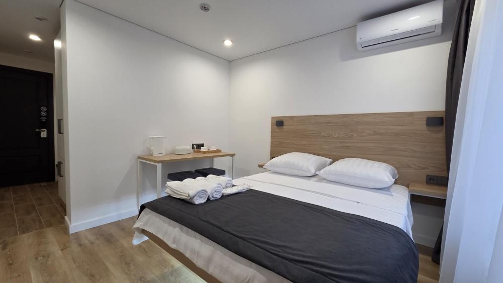 Номер стандарт площадью 10 кв.м. для размещения до 2-х гостей. Номер оснащен: кровать 160 на 200, комфортный анатомический матрас, стол, стулья, душ, туалет, обувница, шкаф, стол, стулья, зеркало в прихожей, зеркало с подсветкой в ванной, Смарт тв, холодильник, утюг, гладильная доска, чайник, кружки, гель для тела, шампунь, мыло, гигиенические наборы, зубные наборы, сплит система.