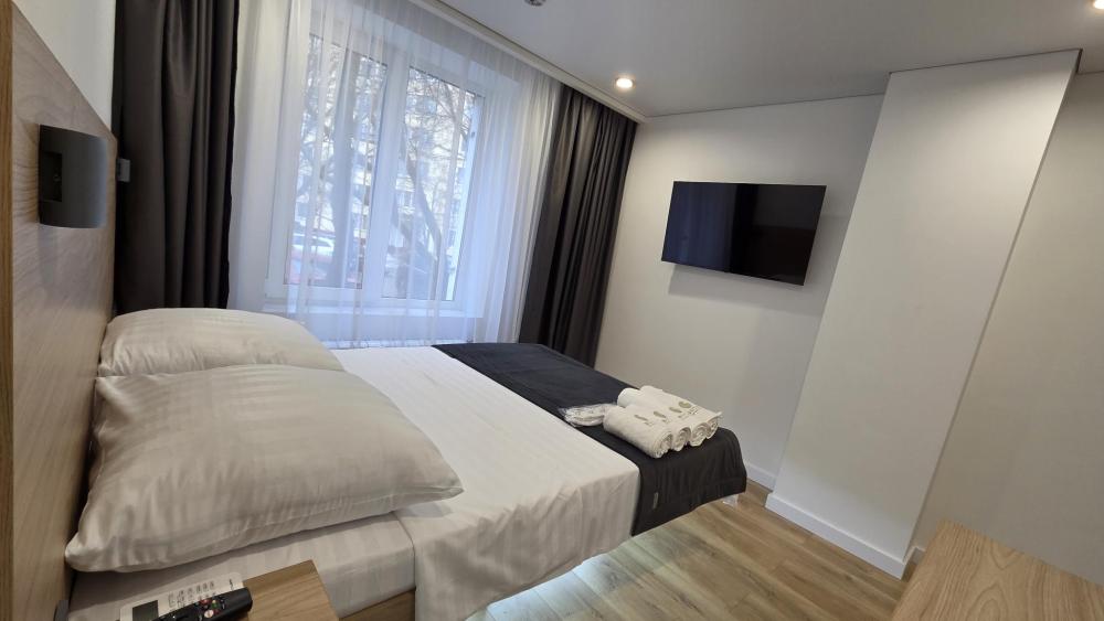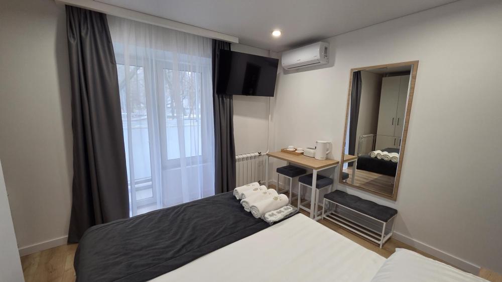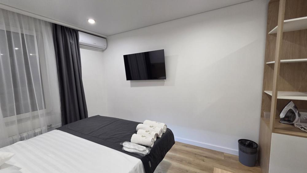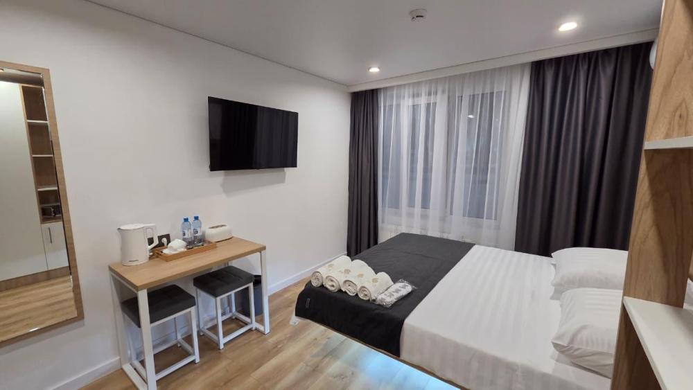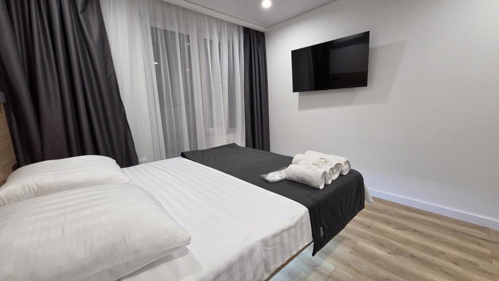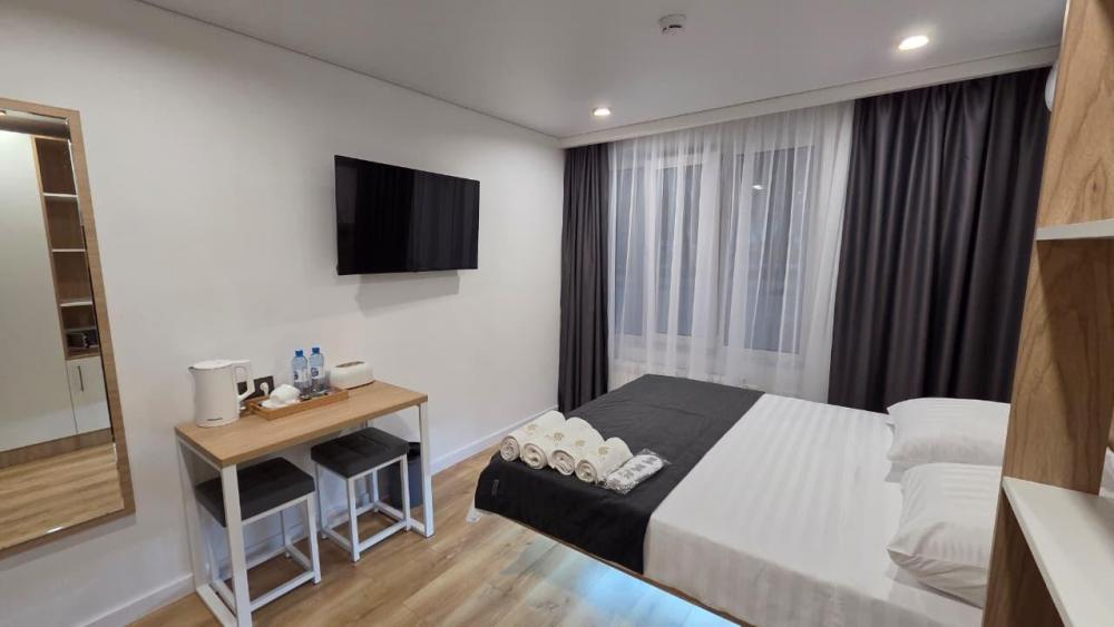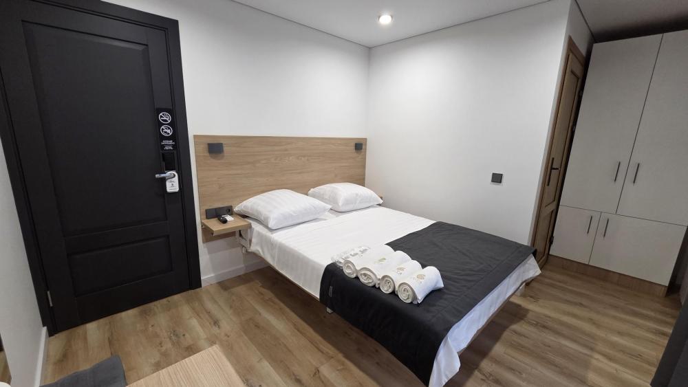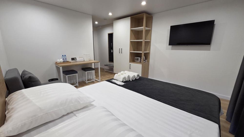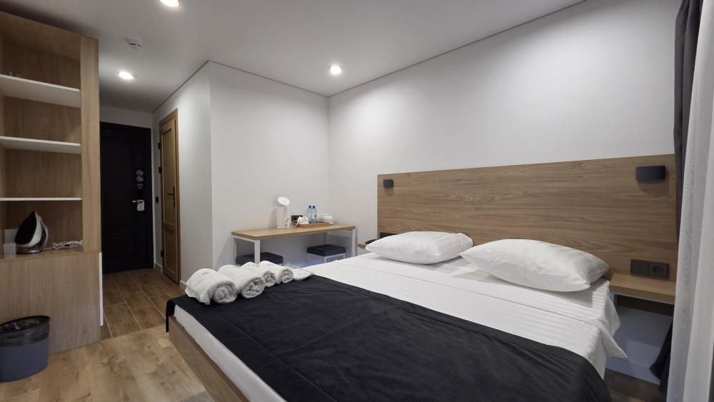 Номер стандарт площадью 10 кв.м. для размещения до 2-х гостей. Номер оснащен: кровать 160 на 200, комфортный анатомический матрас, стол, стулья, душ, туалет, обувница, шкаф, стол, стулья, зеркало в прихожей, зеркало с подсветкой в ванной, Смарт тв, холодильник, утюг, гладильная доска, чайник, кружки, гель для тела, шампунь, мыло, гигиенические наборы, зубные наборы, сплит система.