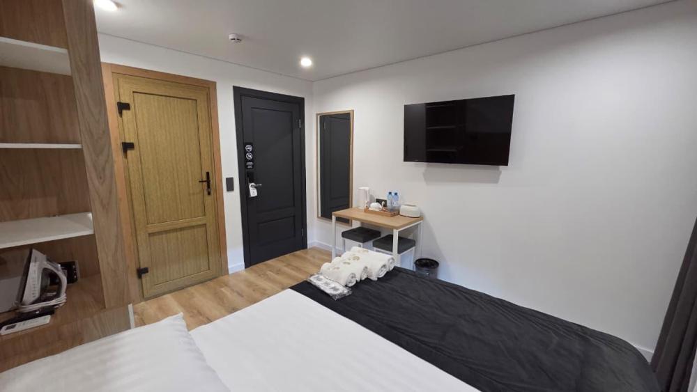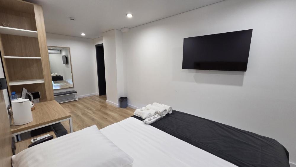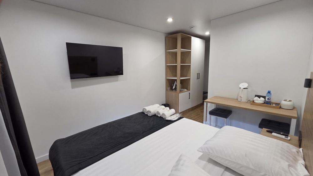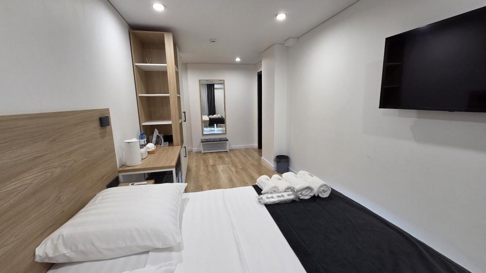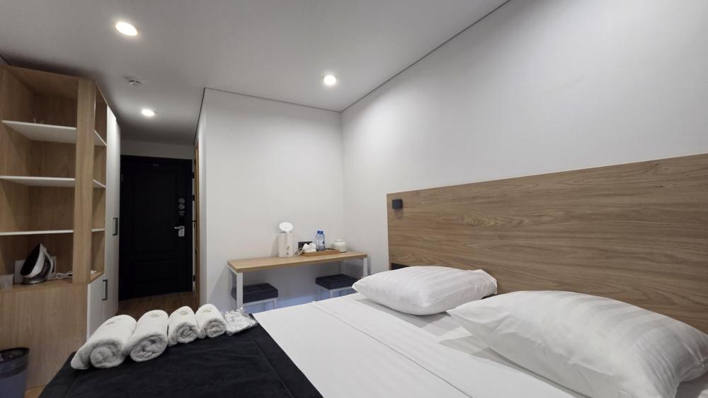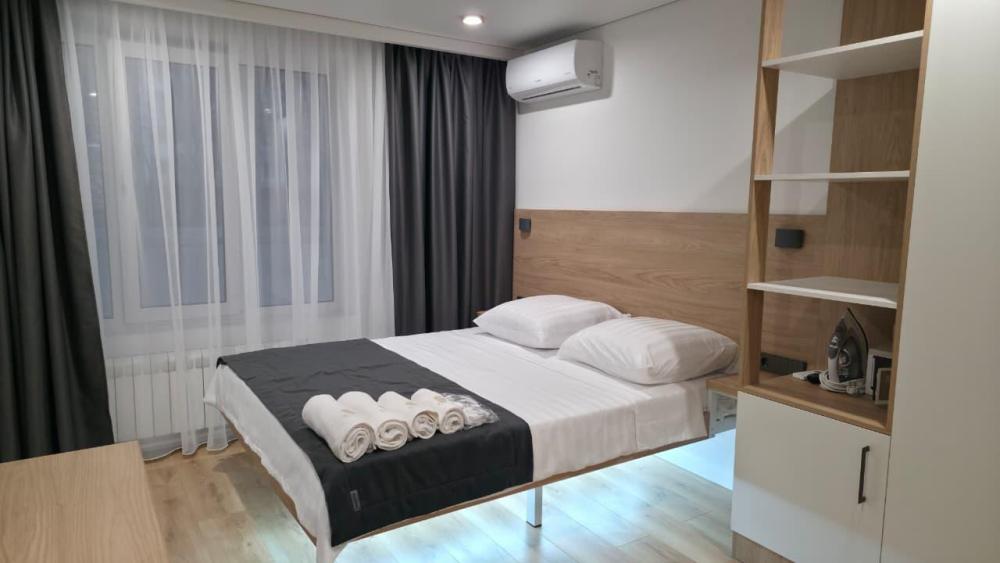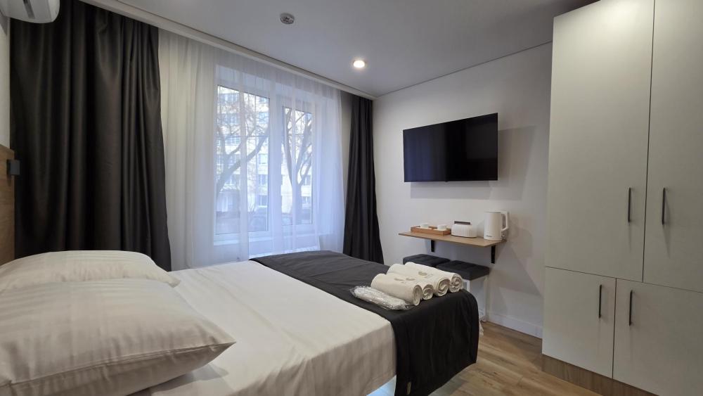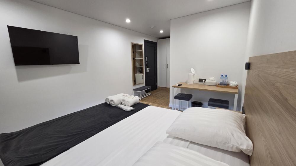 Номер стандарт площадью 10 кв.м. для размещения до 2-х гостей. Номер оснащен: кровать 160 на 200, комфортный анатомический матрас, стол, стулья, душ, туалет, обувница, шкаф, стол, стулья, зеркало в прихожей, зеркало с подсветкой в ванной, Смарт тв, холодильник, утюг, гладильная доска, чайник, кружки, гель для тела, шампунь, мыло, гигиенические наборы, зубные наборы, сплит система.