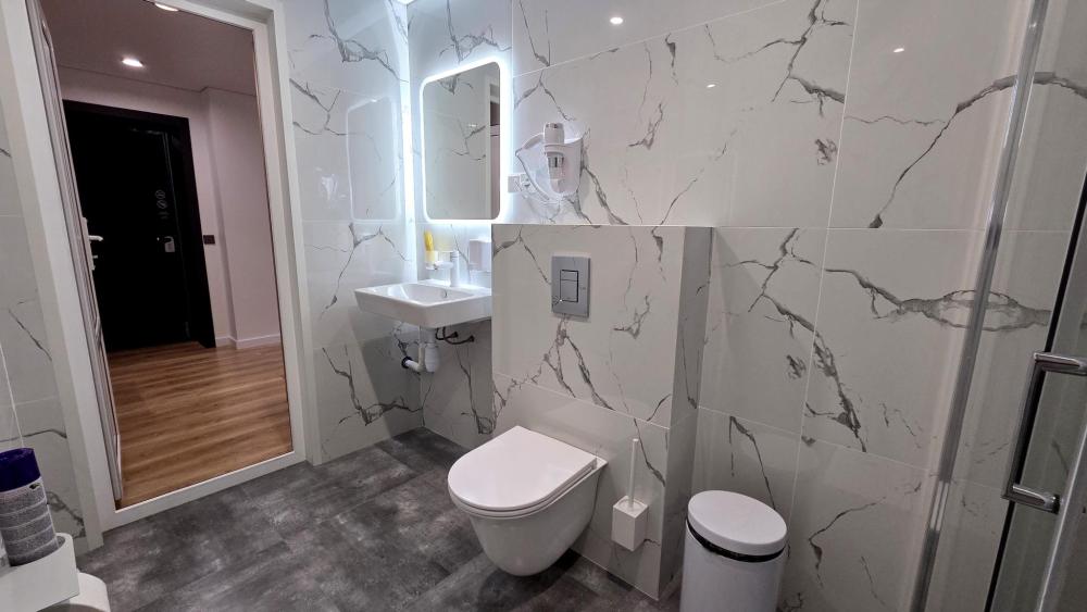 Номер стандарт площадью 15 кв.м. для размещения до 2-х гостей. Номер оснащен: кровать 160 на 200, комфортный анатомический матрас, стол, стулья, душ, туалет, обувница, шкаф, стол, стулья, зеркало в прихожей, зеркало с подсветкой в ванной, Смарт тв, холодильник, утюг, гладильная доска, чайник, кружки, гель для тела, шампунь, мыло, гигиенические наборы, зубные наборы, сплит система.