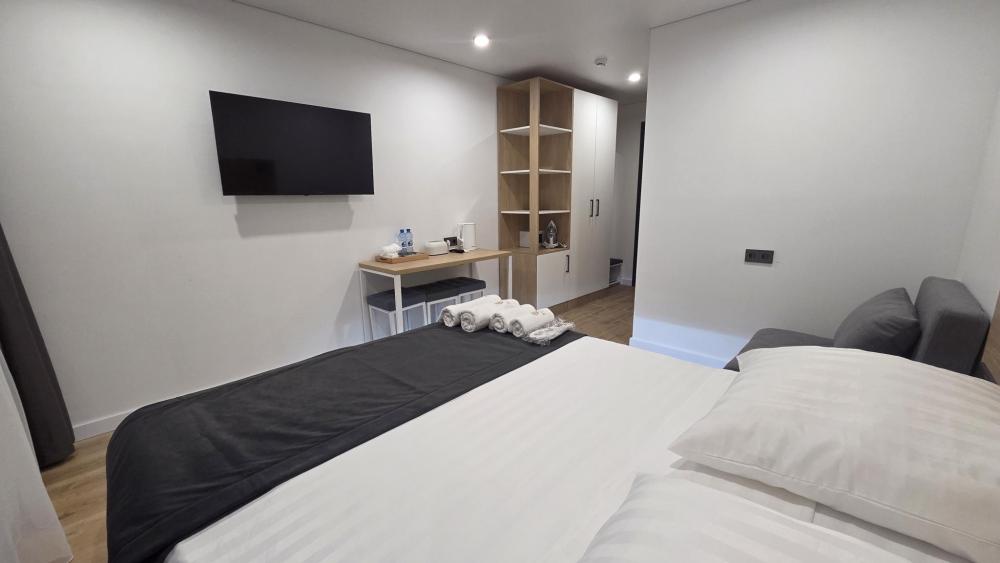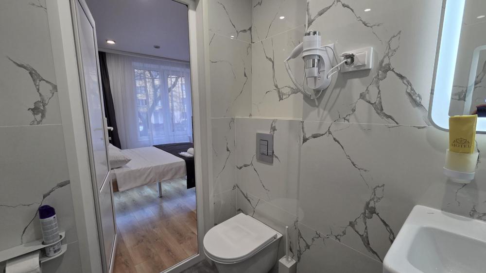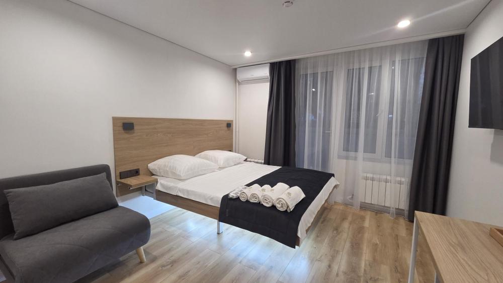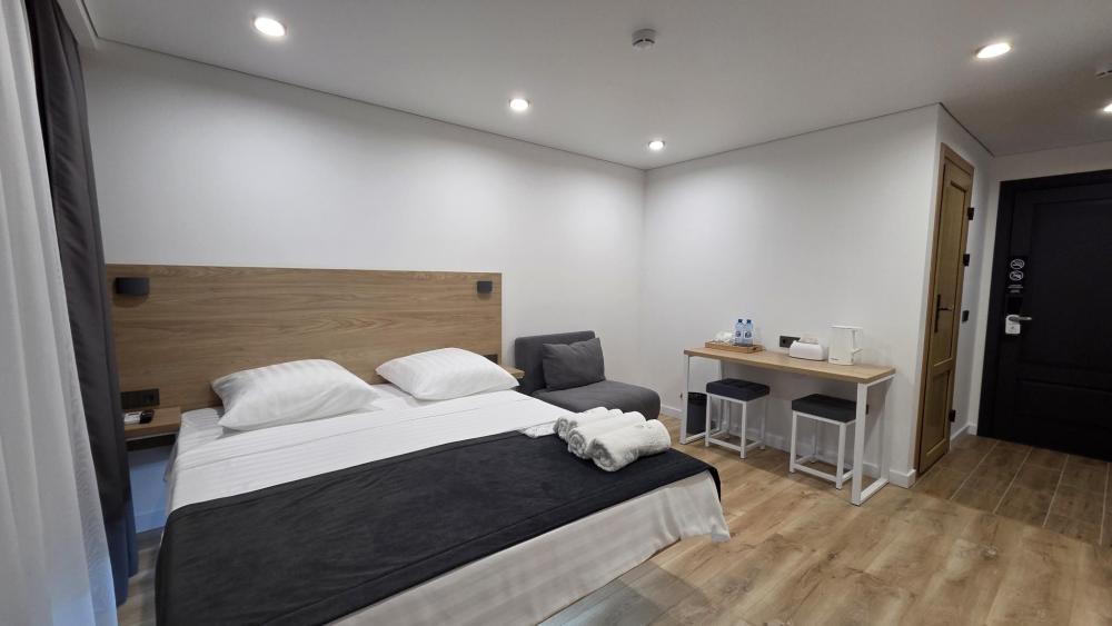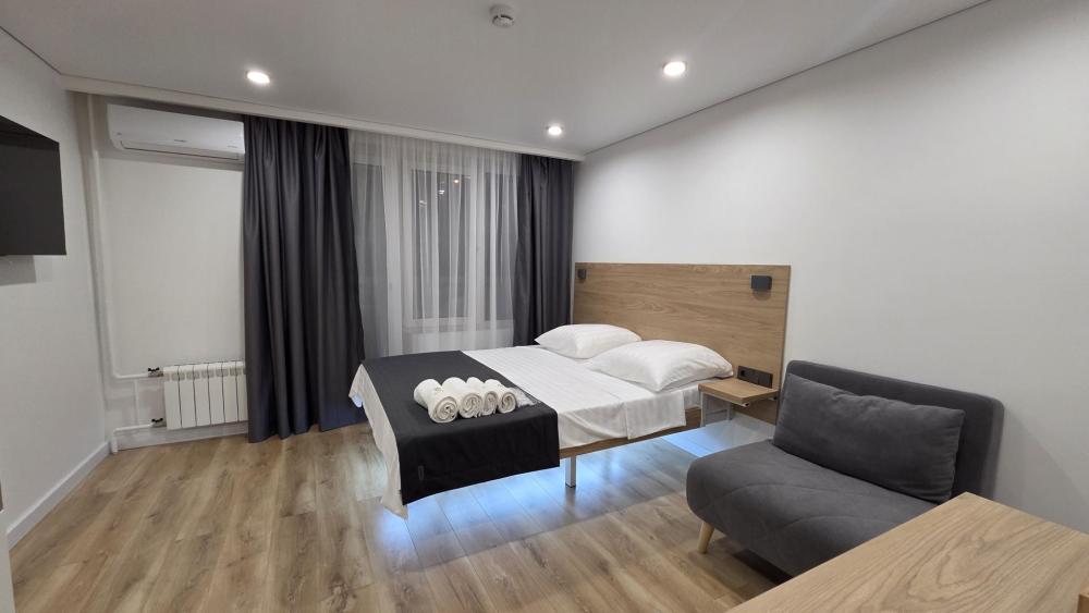 Номер стандарт площадью 18 кв.м. для размещения до 3-х гостей. Номер оснащен: кровать 160 на 200, комфортный анатомический матрас, раскладное кресло, стол, стулья, душ, туалет, обувница, шкаф, стол, стулья, зеркало в прихожей, зеркало с подсветкой в ванной, Смарт тв, холодильник, утюг, гладильная доска, чайник, кружки, гель для тела, шампунь, мыло, гигиенические наборы, зубные наборы, сплит система.