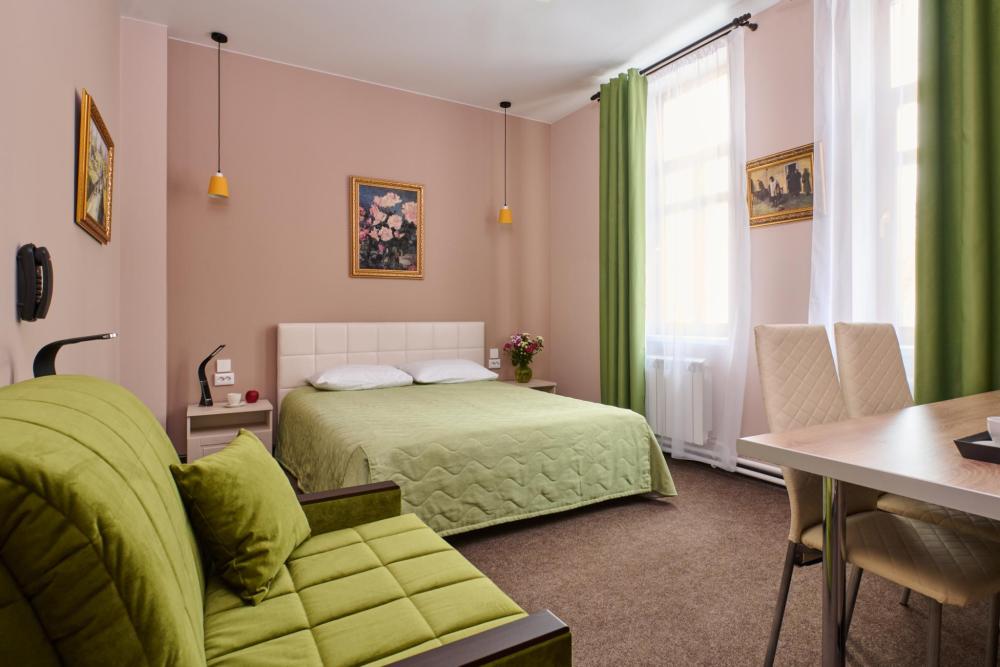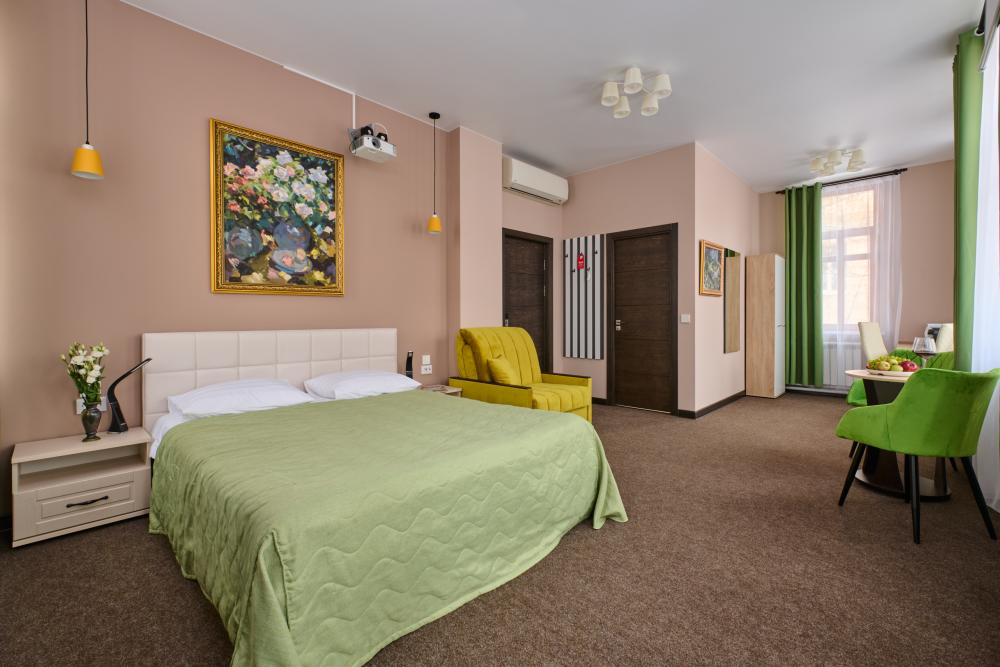 В просторном и светлом номере Люкс возможно размещение до 3 гостей. В номере есть все для комфортного проживания: от микроволновой печи до кинопроектора и журнального столика. Основные места: двуспальная кровать. Размер: 160х200. Дополнительное место: кресло-кровать. Размер: 80х200.