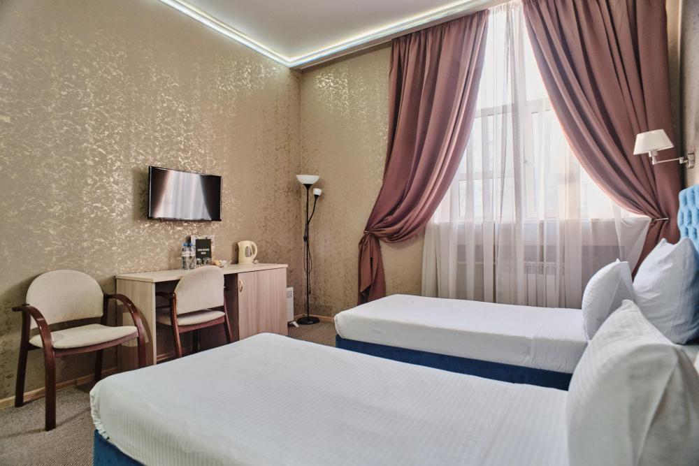 В номере: две односпальные кровати, индивидуальное кондиционирование, телефон, телевизор, холодильник, просторная ванная комната, косметические принадлежности, халат и тапочки.