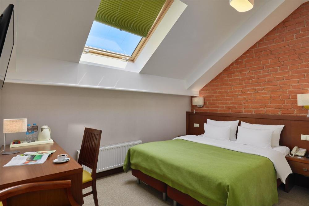 Люкс — современный двухкомнатный номер, который состоит из уютной спальни и просторной гостиной. А оригинальные окна «мансардного» типа придают номеру дополнительную легкость и простор. К вашим услугам: рабочее пространство с бесплатным высокоскоростным интернетом, ТВ со спутниковыми каналами, мини-бар, фен, кондиционер, туалетно-косметические принадлежности.