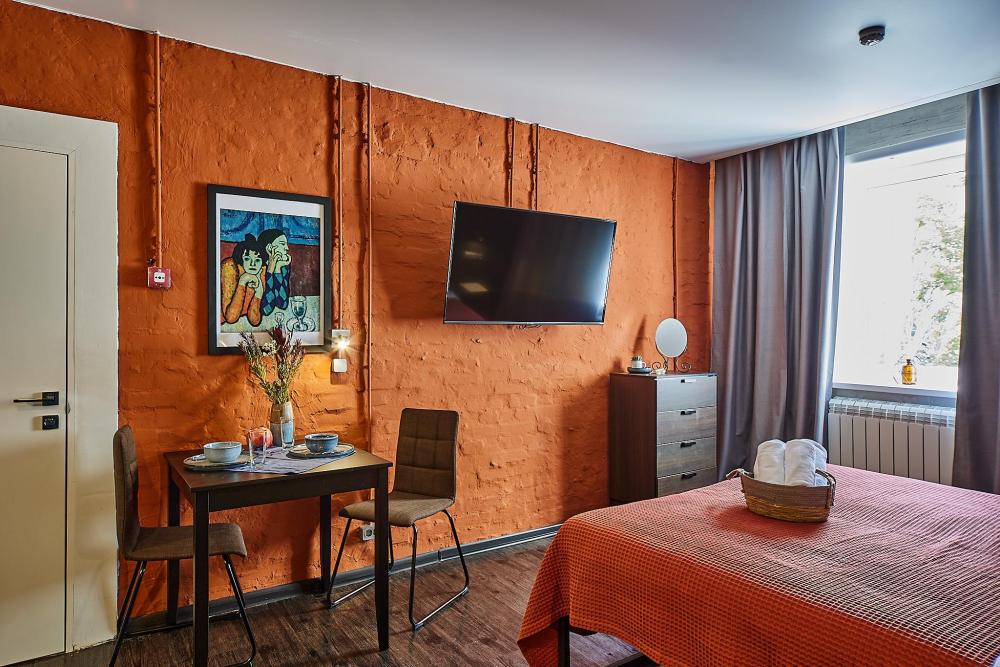 Стильная арт‑студия для одного гостя с видом на тихий внутренний дворик — идеальный вариант для командировок и коротких поездок. В апартаментах: односпальная софа‑кровать, бесплатный Wi‑Fi, кондиционер, ТВ с подпиской на Кинопоиск, мини‑холодильник, чайник и чайный набор, бесплатный чай/кофе, собственная ванная комната с туалетно‑косметическими принадлежностями, фен и тапочки. Дополнительные услуги и преимущества: - завтрак в номер - общая прачечная зона: стиральная и сушильная машины, гладильные принадлежности - уборка раз в 5 суток - общая кухня с выходом на террасу для тех, кто предпочитает готовить сам - платная парковка на территории - круглосуточное бесконтактное заселение с онлайн поддержкой 24/7, а также гибкие условия раннего заезда и позднего выезда - размещение с небольшими животными по предварительному согласованию и за дополнительную плату