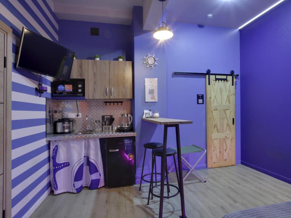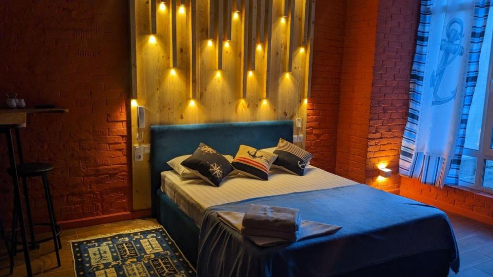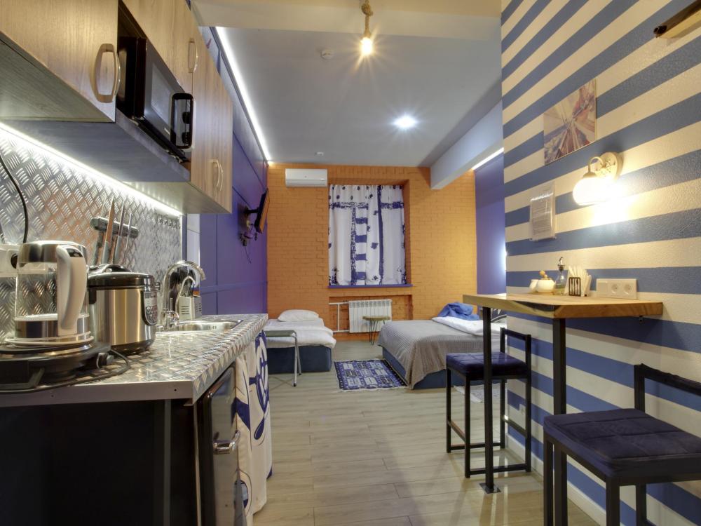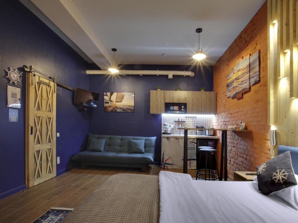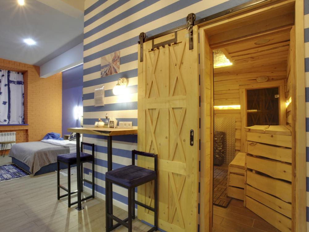 Уютный комфортный апартамент, оформленный в морской тематике с отдельным входом в липовую финскую сауну "Леший" (сауна оплачивается отдельно). Вход в номер со двора, не через ресепшн. В номере есть мини кухня со всем необходимым. Его можно соединить с другими номерами и вместе с друзьями или семьей ходить в сауну. Во дворе дома есть детская и спорт площадки.