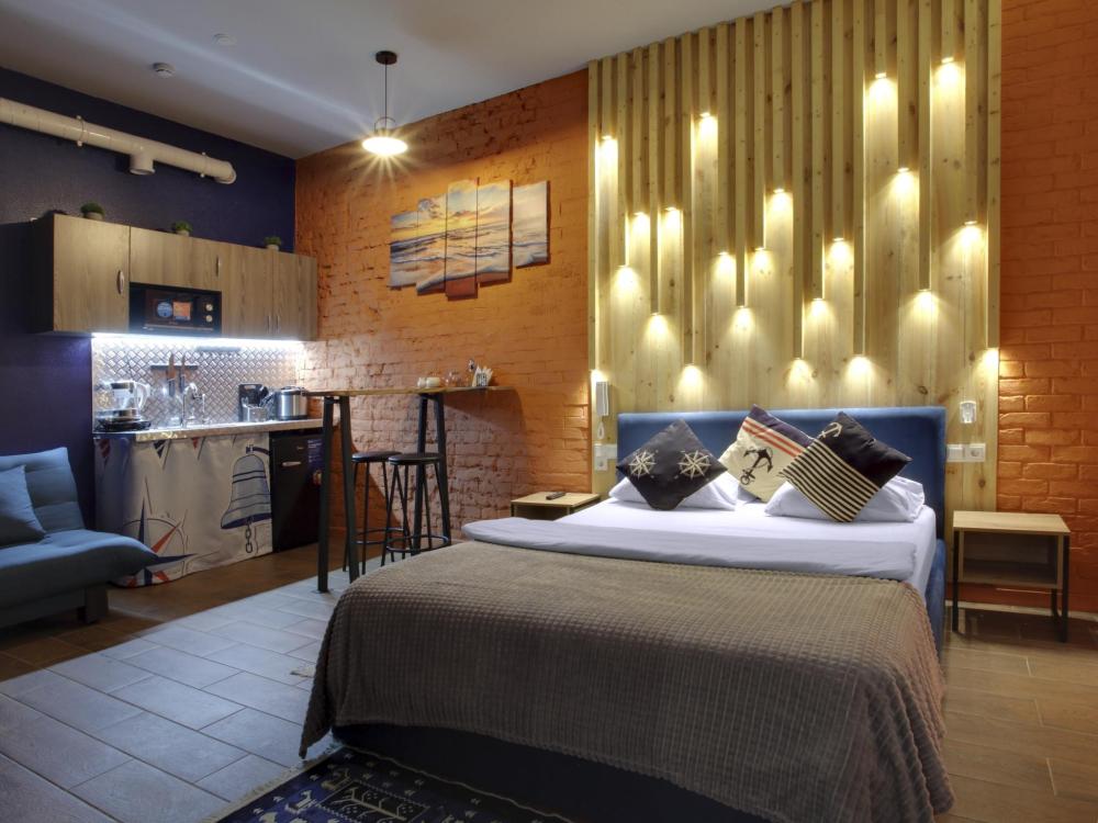 Уютный апартамент с большим окном в сторону реки Яузы и отдельным входом со стороны набережной. Откатная дизайнерская дверь ведет из номера прямо в финскую сауну "Леший" (сауна оплачивается отдельно). Есть миникухня со всем необходимым. Оригинальное, реечное, подсвечиваемое изголовье у двуспальной кровати наполняет апартамент приятным светом.