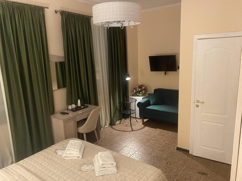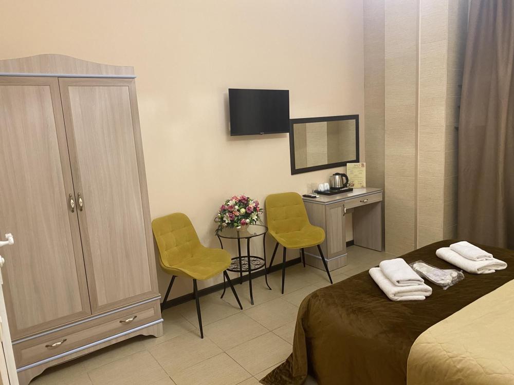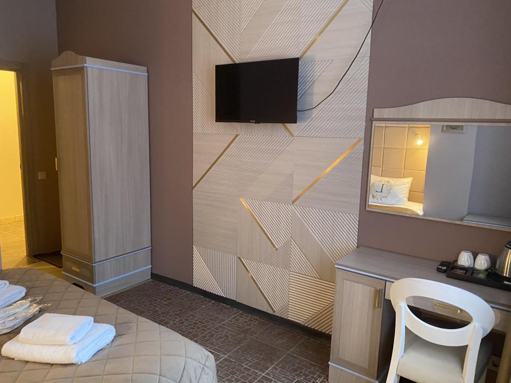 В номере имеется все необходимое для комфортного отдыха . В номере кондиционер, телевизор с смарт т.в, кондиционер, туалетные принадлежности, халат, фен, чайный набор. В номере есть раздвижной диван, кресла со столиком. По запросу утюг, гладильная доска.