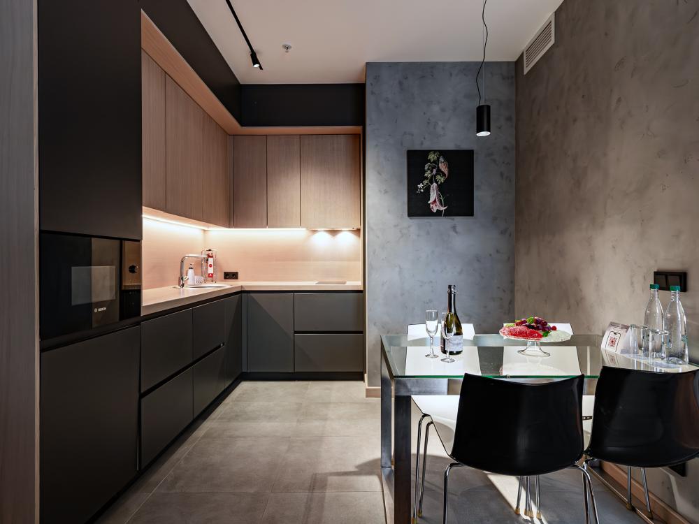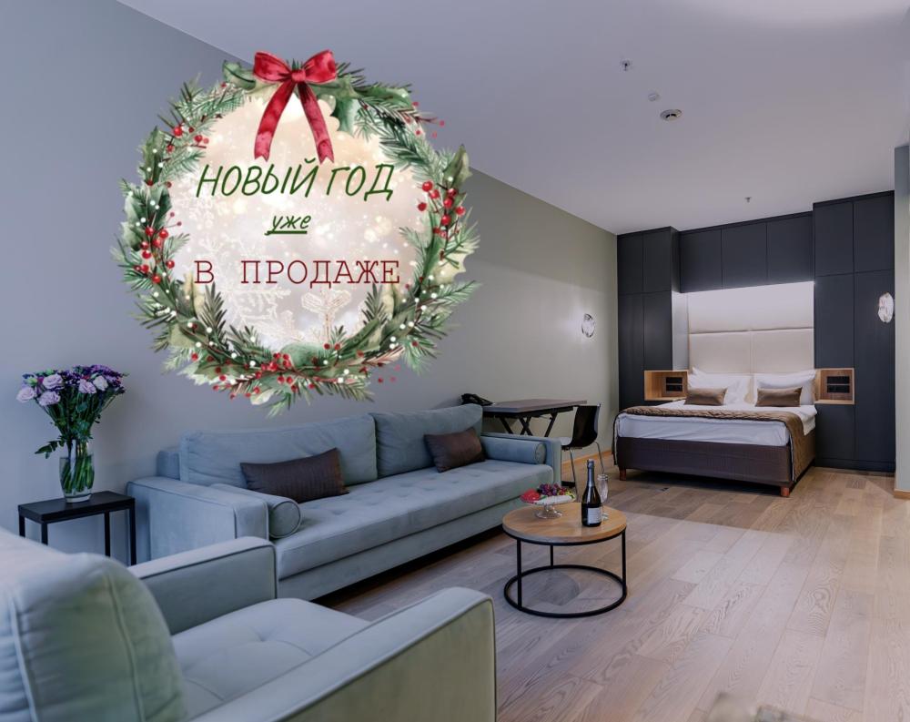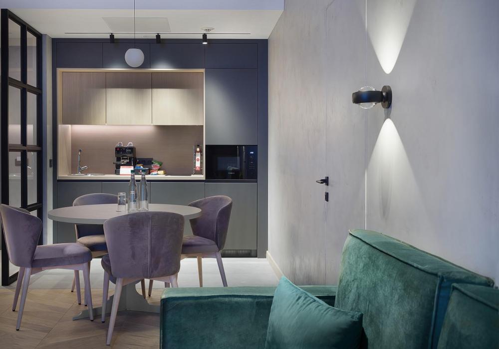 Однокомнатный номер-студия площадью 40 кв. метров отлично подойдёт для комфортного проживания двух гостей. Спальня с кроватью формата King Size совмещена с небольшой гостиной. Приятные глазу цветовые решения и стильный дизайн порадуют ценителей элегантной простоты.