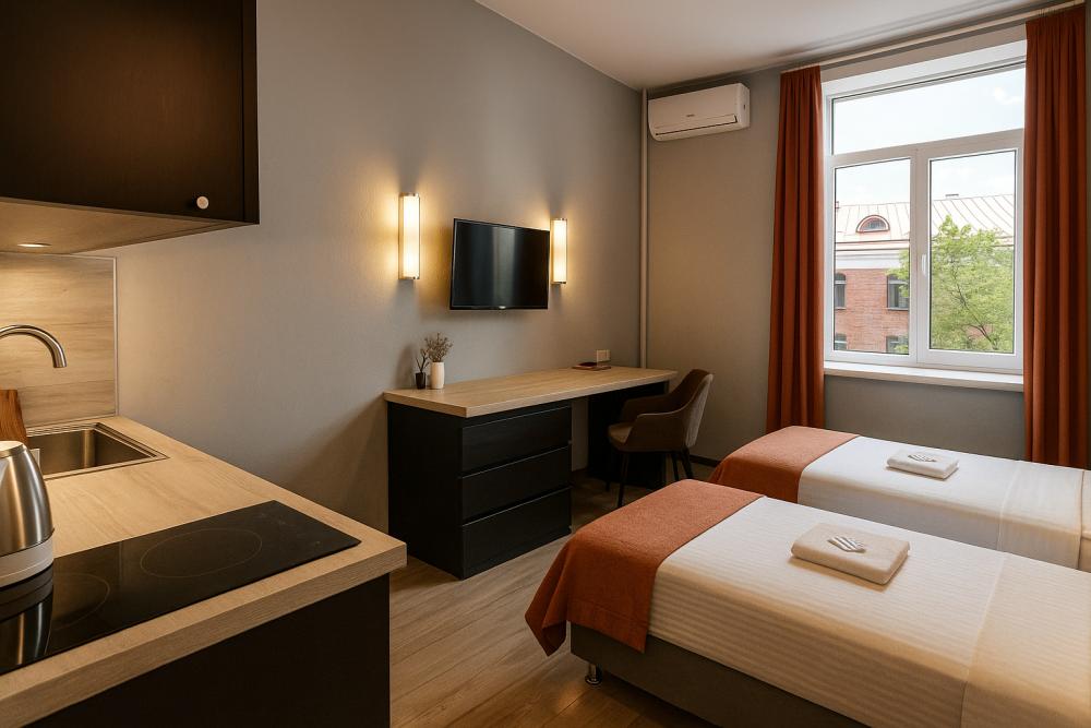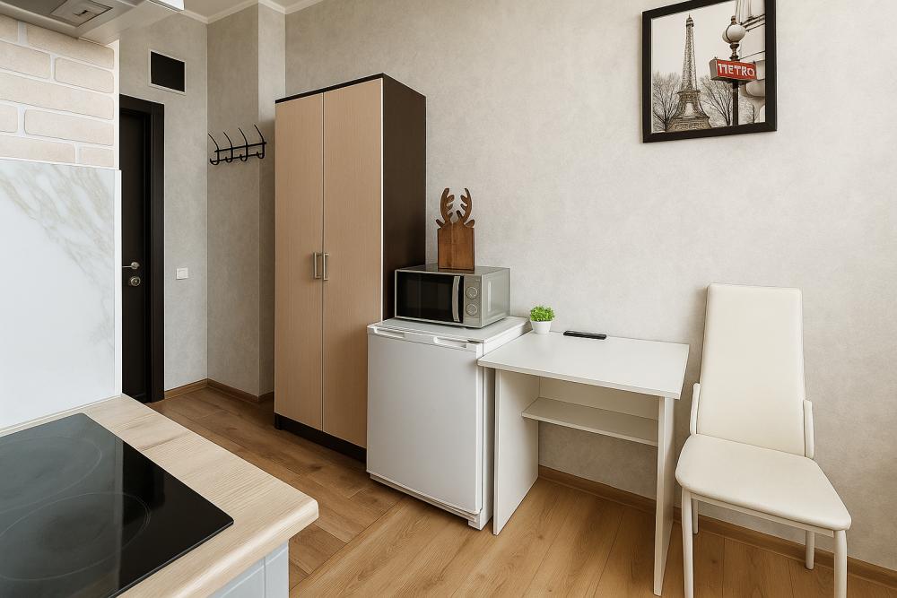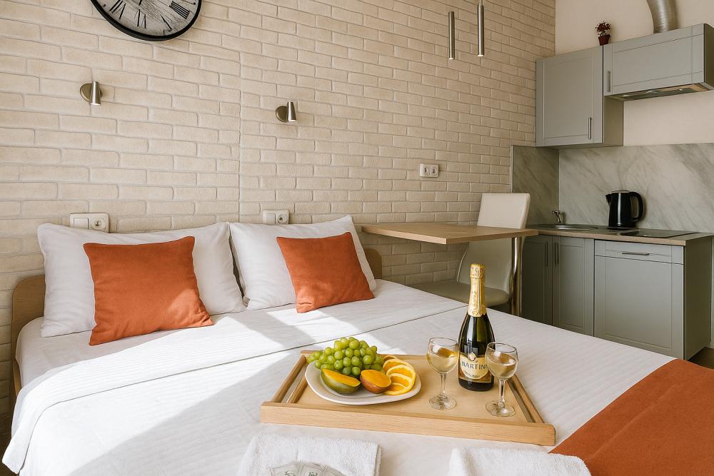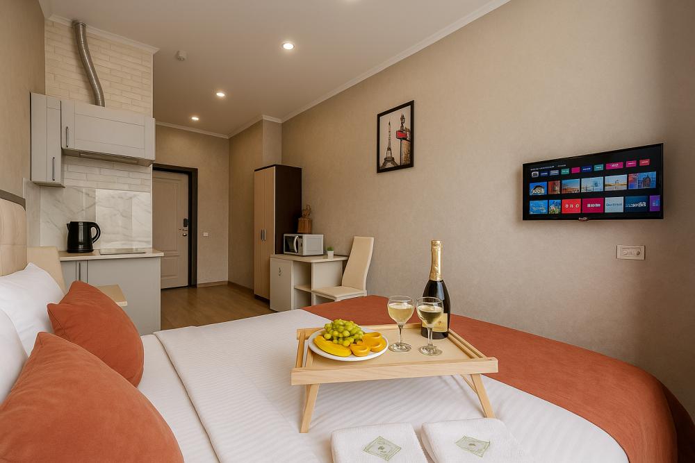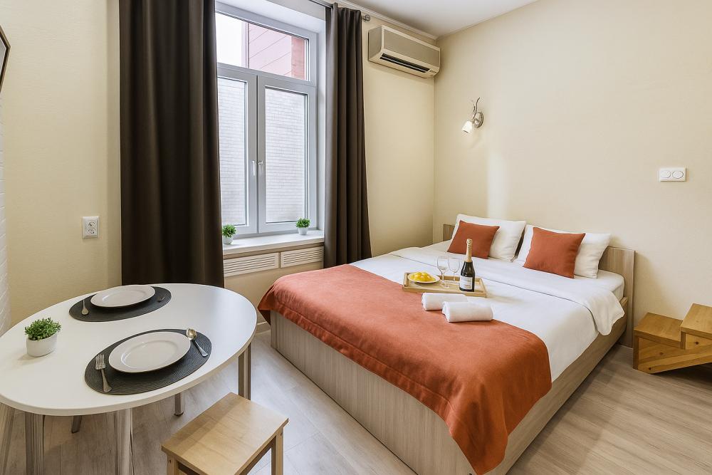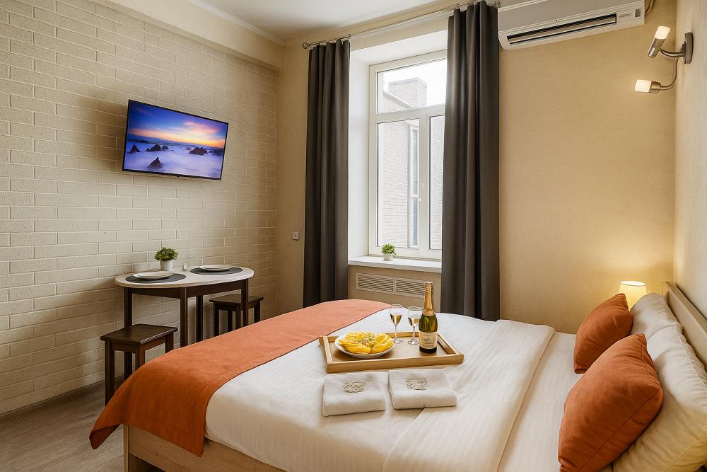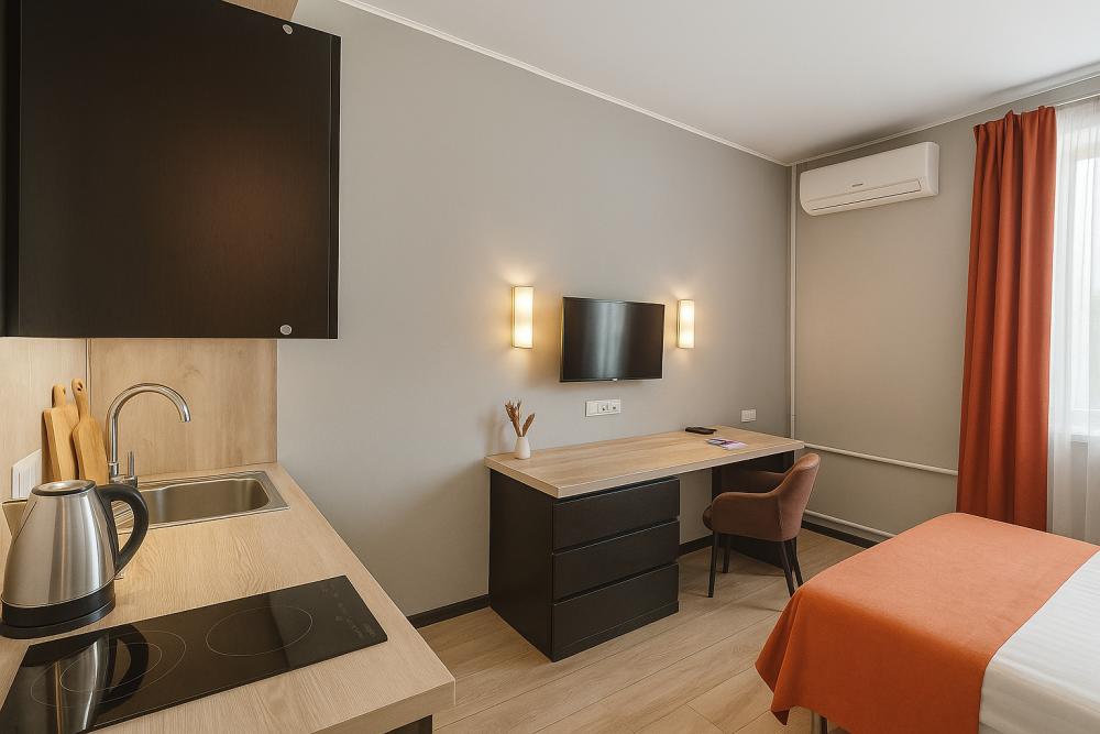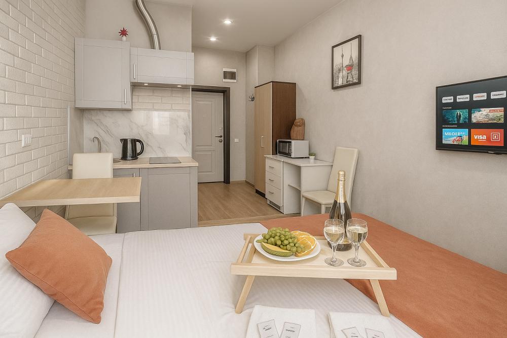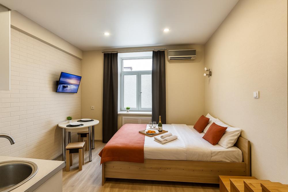 Небольшие, но уютные студии, с дизайнерским ремонтом, где есть всё необходимое для комфортного проживания: бесплатный Wi-Fi, Телевизор, плита, холодильник, микроволновка, фен, всё для сервировки стола. От стандартного отличается наличием столика. Уборка и дезинфекция проводятся после каждого заезда. Комфортное проживание гарантировано. Идеальный вариант для командированных сотрудников и тех, кто просто хочет отдохнуть в непринужденной обстановке.