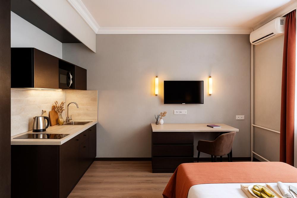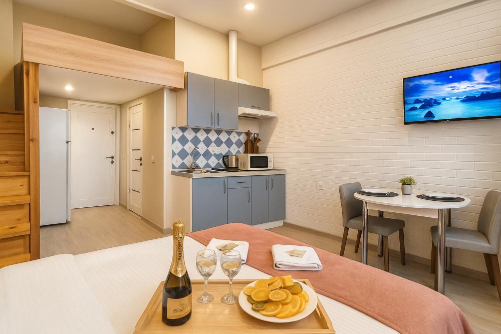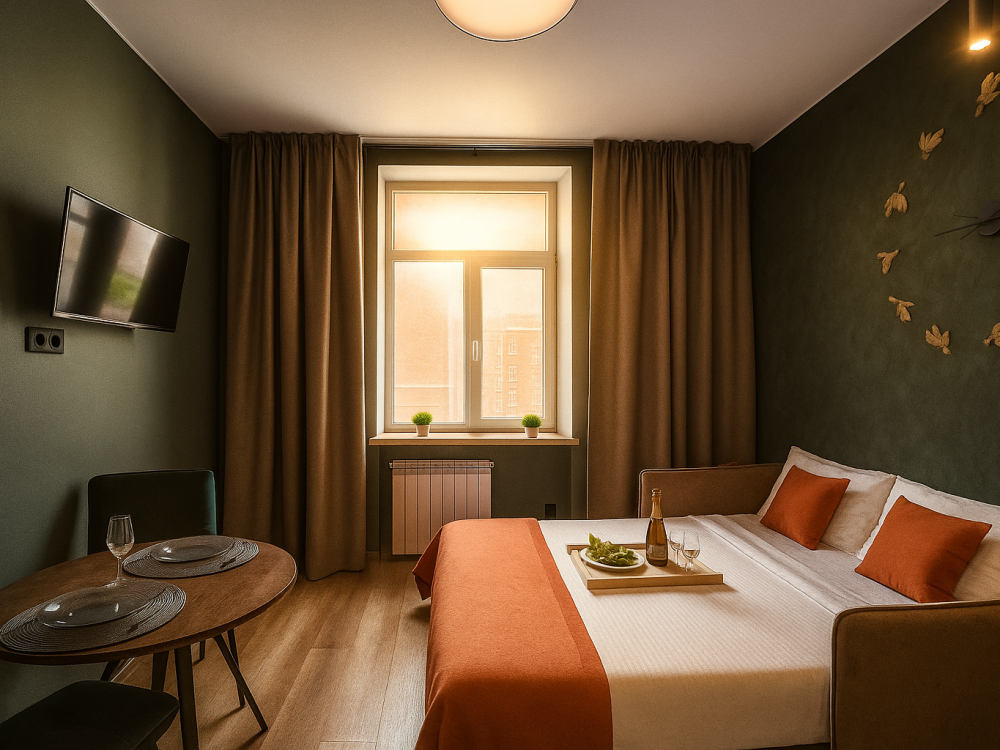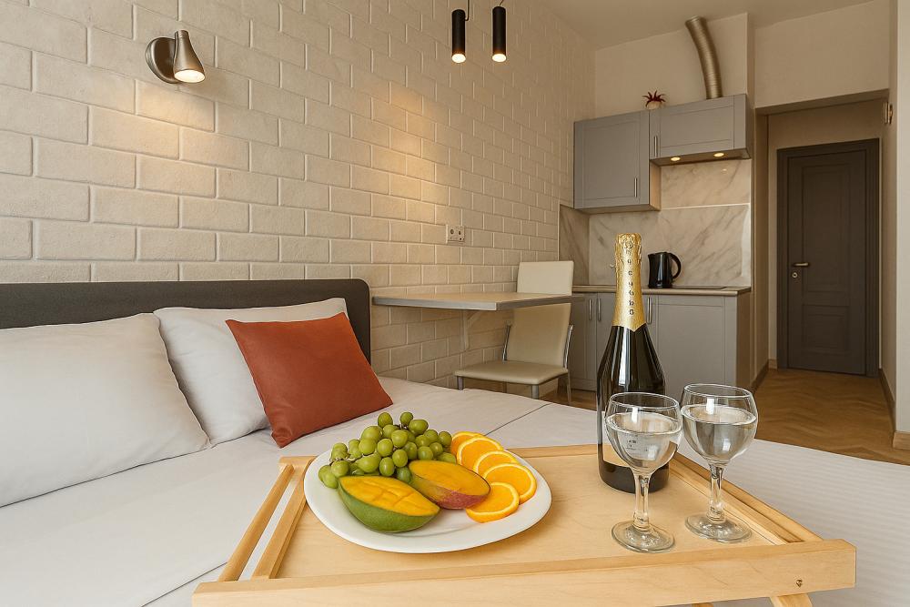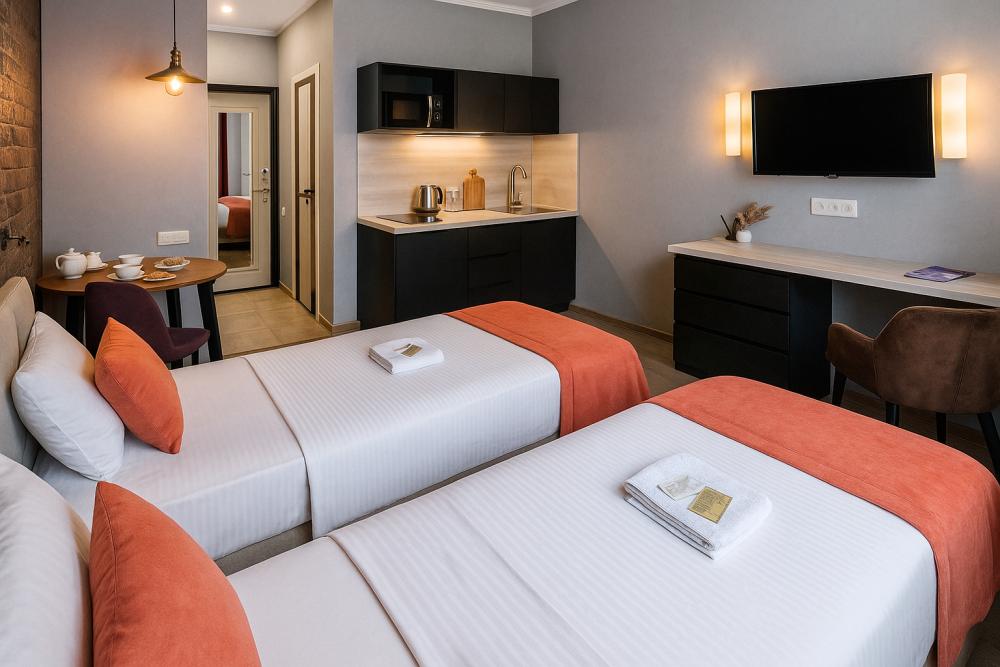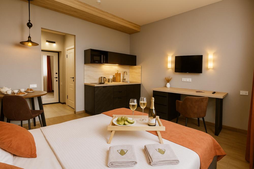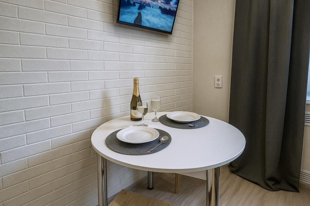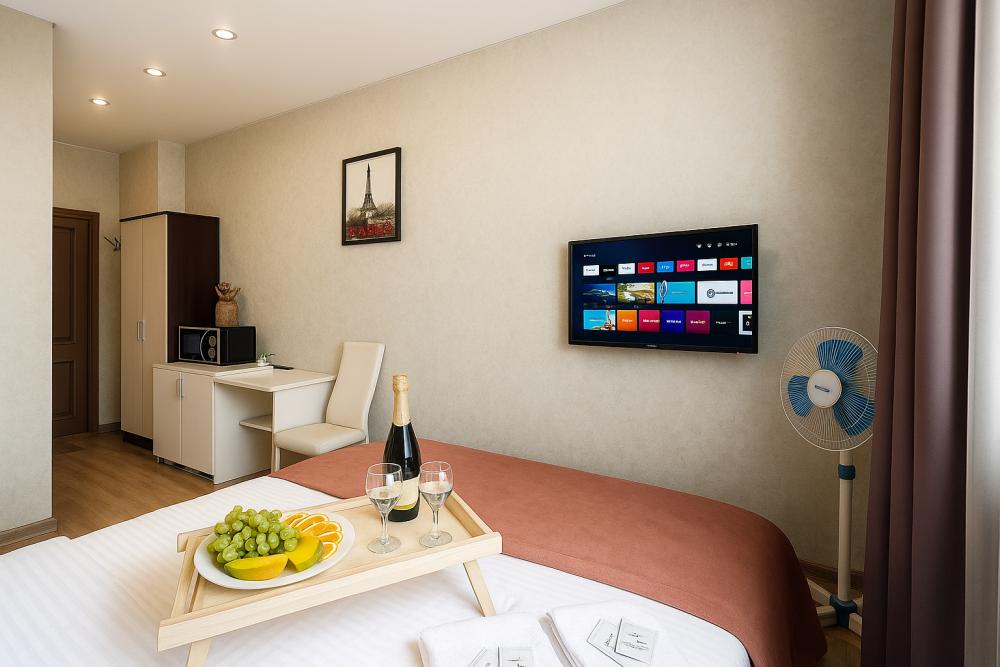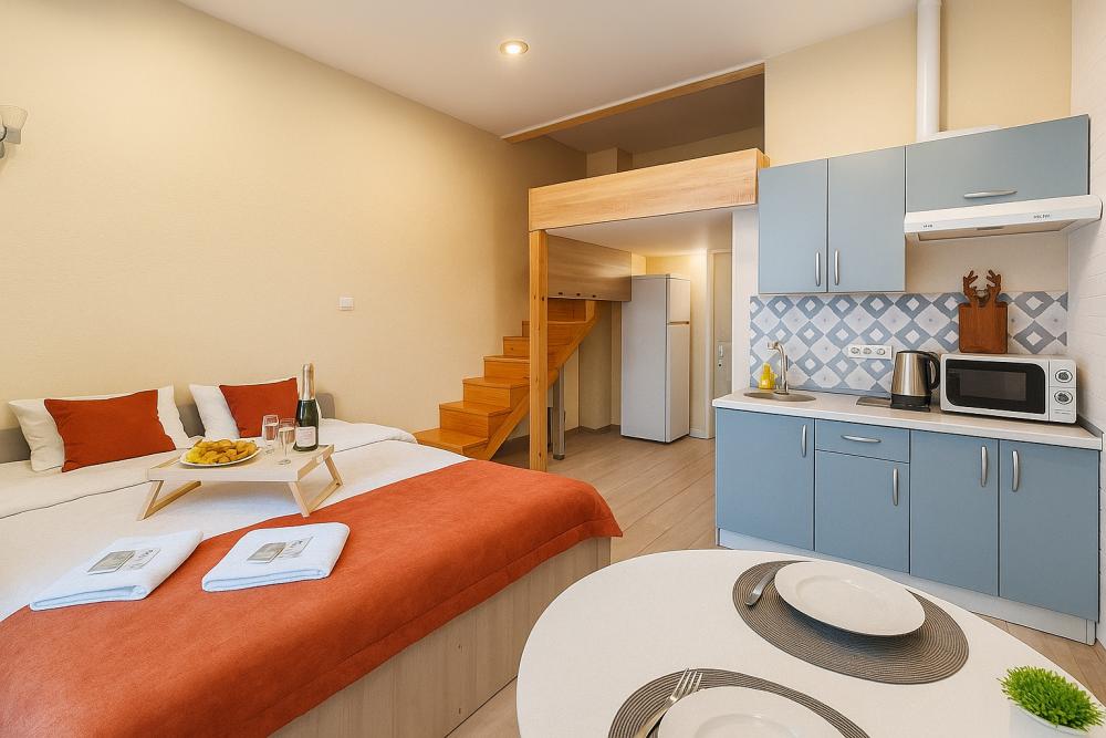 Небольшие, но уютные студии, с дизайнерским ремонтом, где есть всё необходимое для комфортного проживания: бесплатный Wi-Fi, Телевизор, плита, холодильник, микроволновка, фен, всё для сервировки стола. От стандартного отличается наличием столика. Уборка и дезинфекция проводятся после каждого заезда. Комфортное проживание гарантировано. Идеальный вариант для командированных сотрудников и тех, кто просто хочет отдохнуть в непринужденной обстановке.