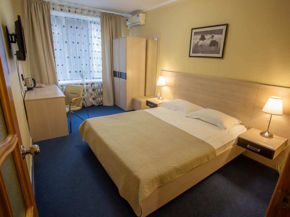 В номере: кровать прикроватная тумбочка шкаф стол с зеркалом телевизор (спутниковое телевидение) сплит-система холодильник чайник посуда: тарелка, чашка, стакан сейф В ванной: душевая кабина, раковина, туалет, средства индивидуальной гигиены.