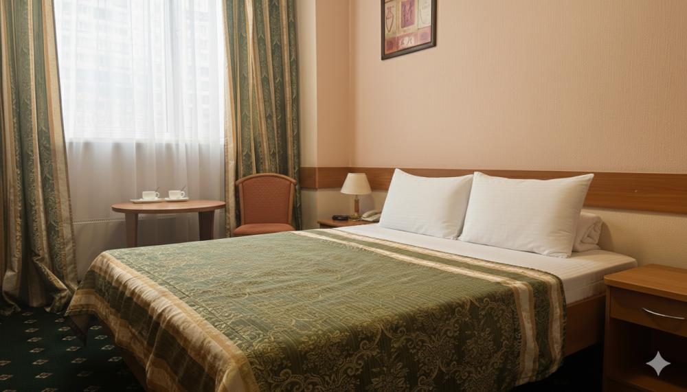 Двухместный номер с двуспальной кроватью. Номер оснащен телевизором, местом для хранения одежды, кондиционером, ванной комнатой, предоставляются туалетно-косметические принадлежности.