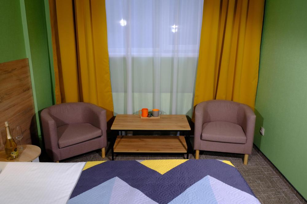 Двухкомнатный номер с двуспальной кроватью, дополнительно есть диван. Номер оснащен телевизором, местом для хранения одежды, холодильником, микроволновой печью, кондиционером, ванной комнатой, предоставляются туалетно-косметические принадлежности.