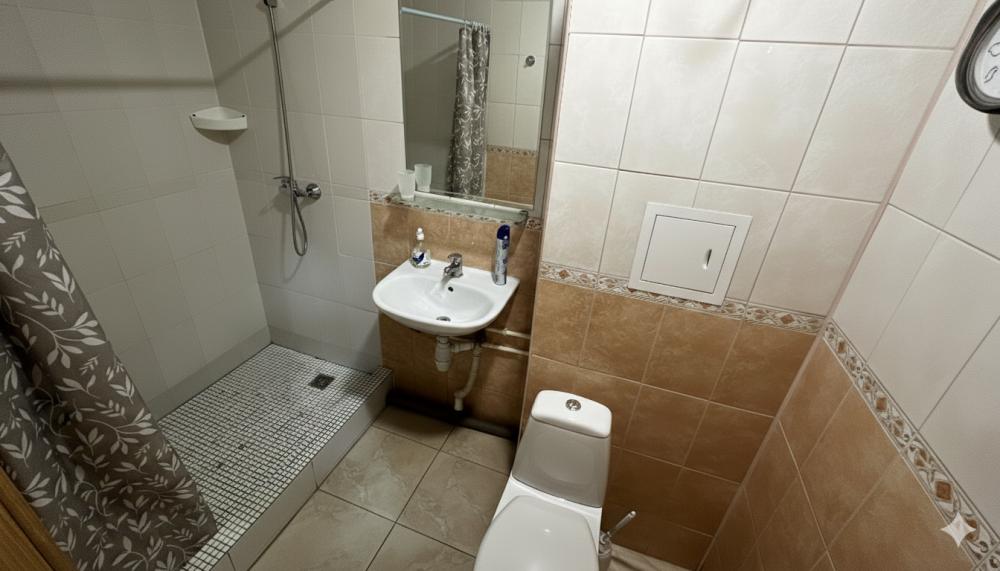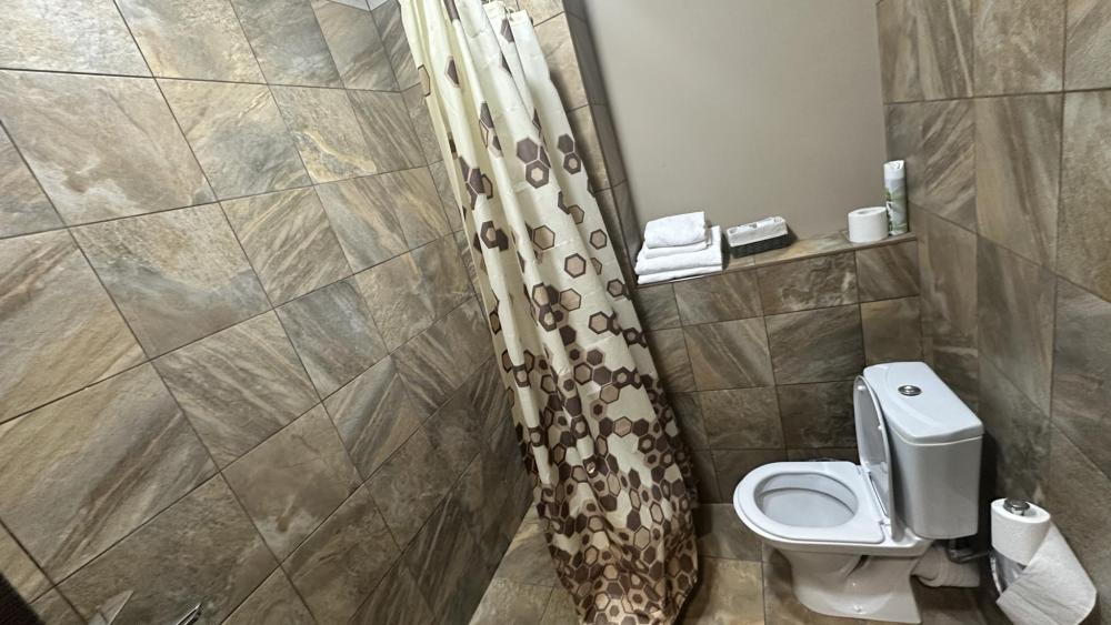 Комфортный номер с большой кроватью и телевизором, в номере имеется ванная комната с душем и туалетом.