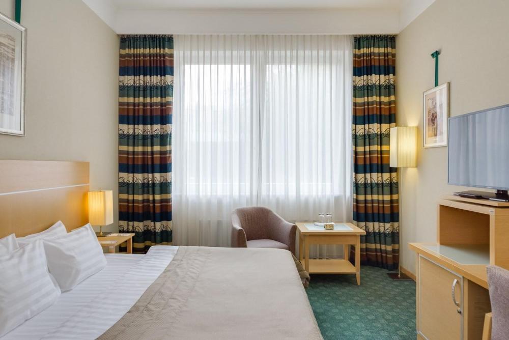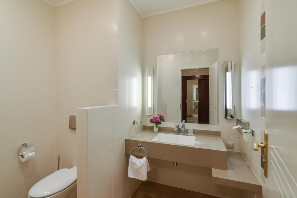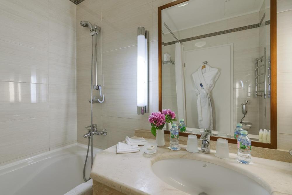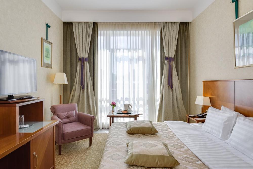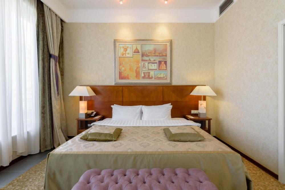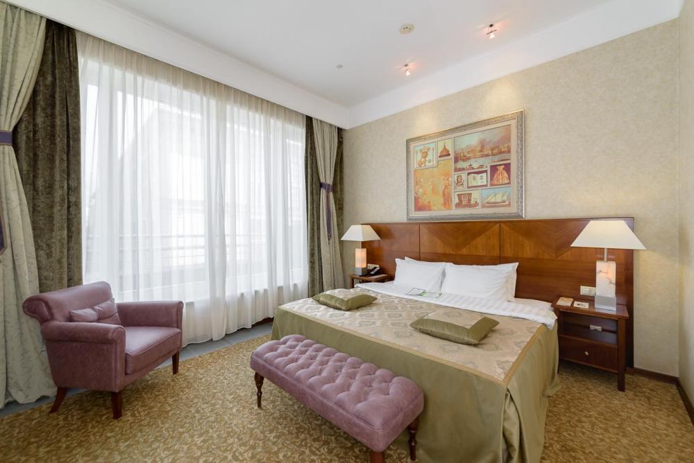 Спальня: двуспальная кровать King-size с ортопедическим матрасом, шкаф для одежды, подставка для чемодана, журнальный столик, кресло, рабочий стол, сейф, мини-бар, телефон, телевизор (общероссийские, спутниковые каналы), беспроводной доступ в Интернет, система кондиционирования. Ванная комната с душевой кабиной, полотенцесушитель, фен, увеличивающее зеркало с подсветкой, набор косметики, тапочки и халат.
