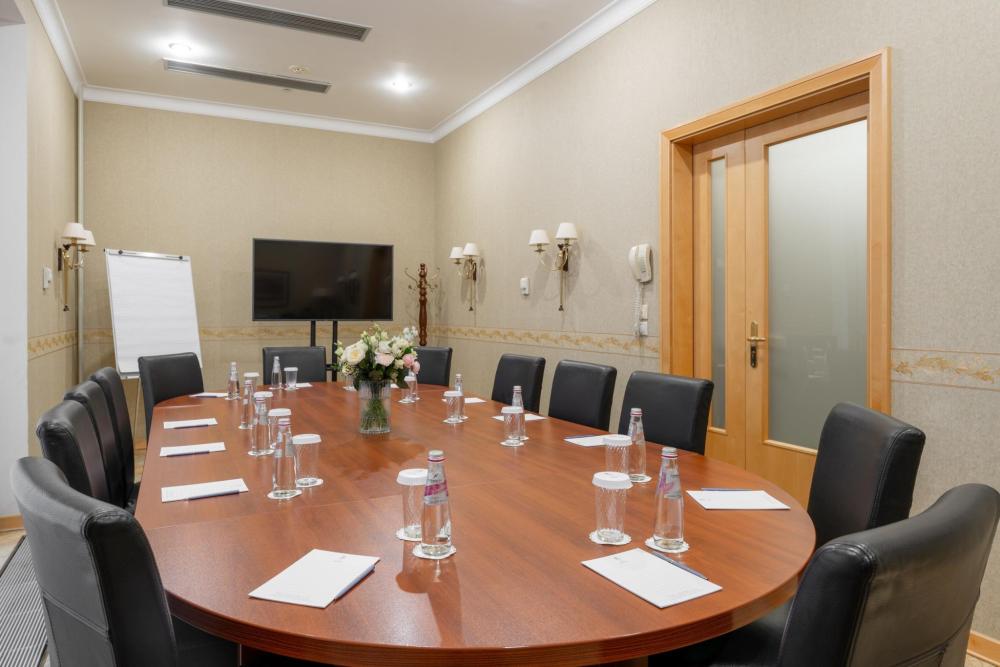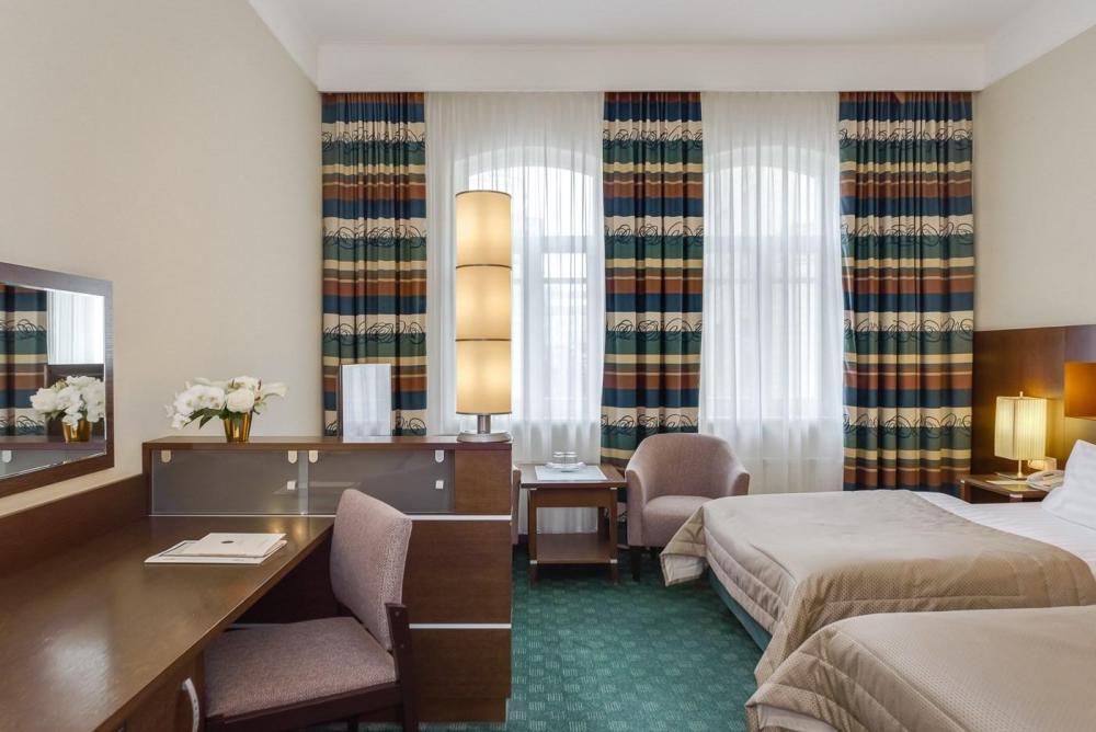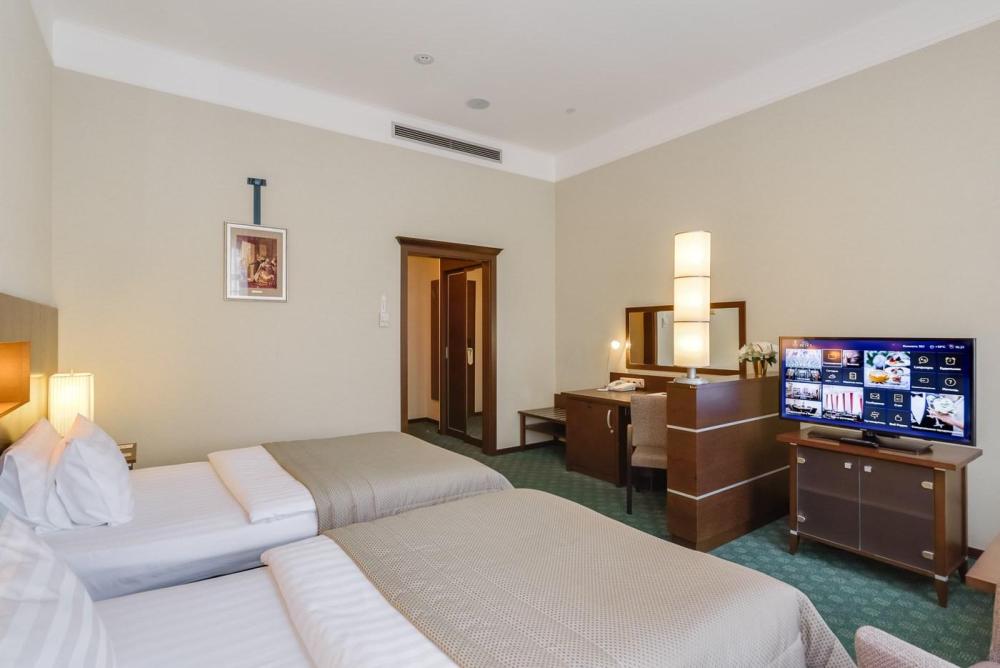 Спальня: две кровати с ортопедическим матрасом, шкаф для одежды, подставка для чемодана, журнальный столик, кресло, рабочий стол, сейф, мини-бар, телефон, телевизор (общероссийские, спутниковые каналы), Wi-Fi, система кондиционирования. В ванной комнате: полотенцесушитель, фен, косметическое зеркало, набор косметики, махровые тапочки и халат.