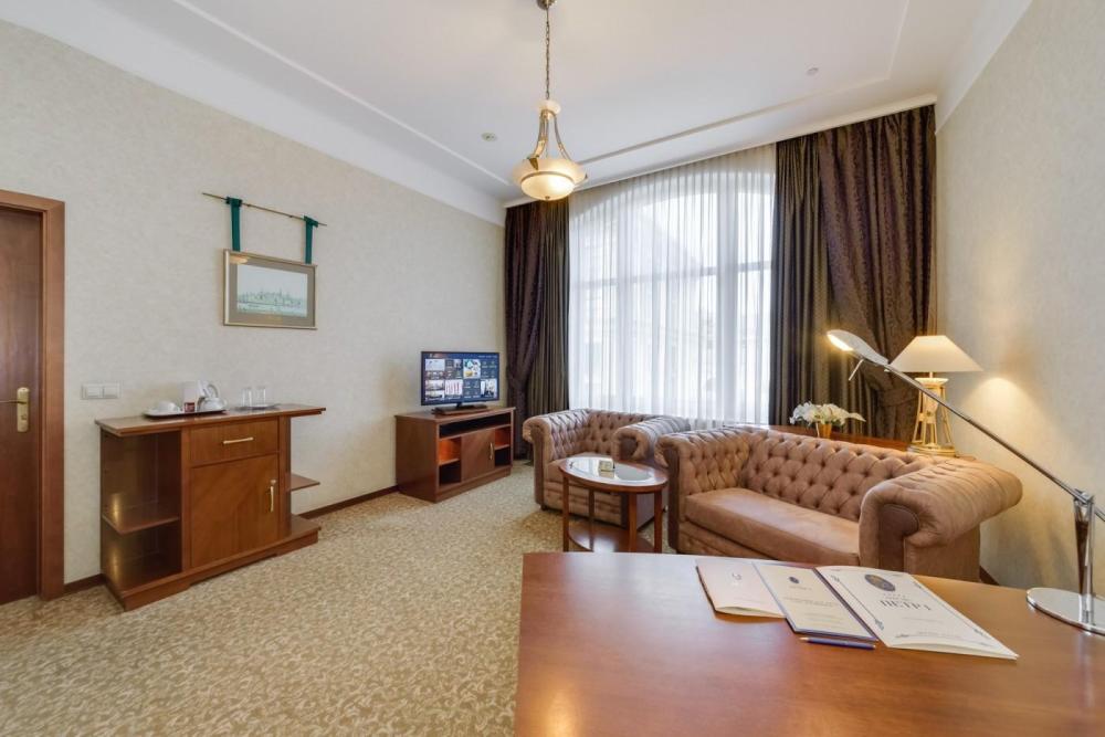 Спальня: двуспальная кровать King size с ортопедическим матрасом, шкаф для одежды, подставка для чемодана, журнальный столик, кресло, рабочий стол, сейф, мини-бар, телефон, телевизор (общероссийские, спутниковые каналы), беспроводной доступ в Интернет, система кондиционирования. Ванная комната с душевой кабиной, полотенцесушитель, фен, увеличивающее зеркало с подсветкой, набор косметики, тапочки и халат.