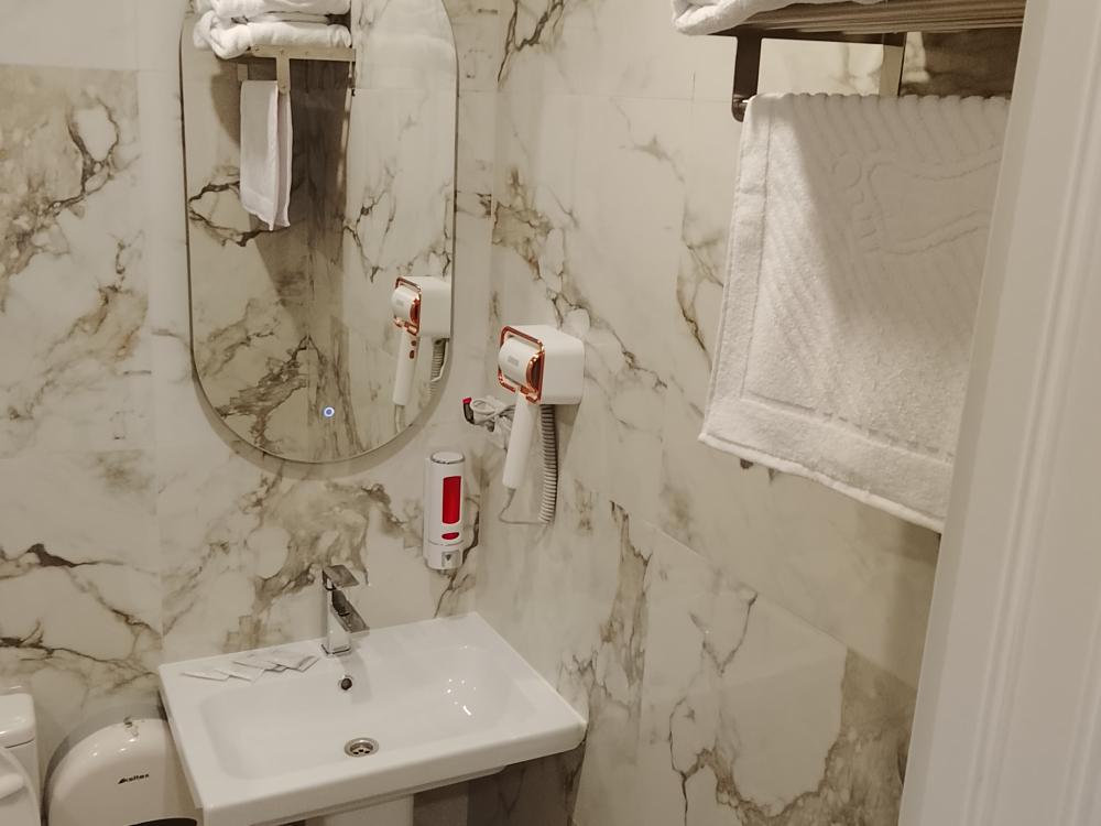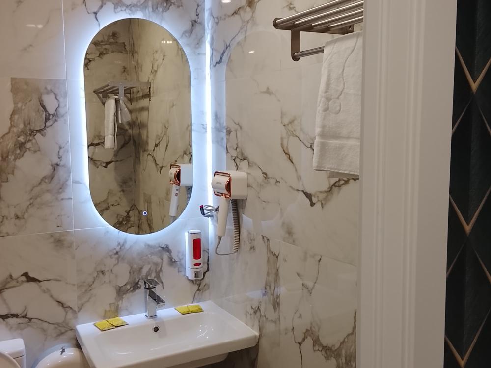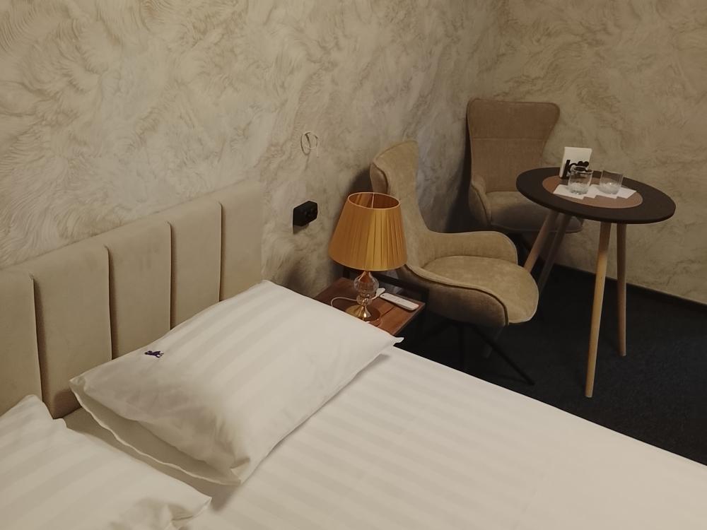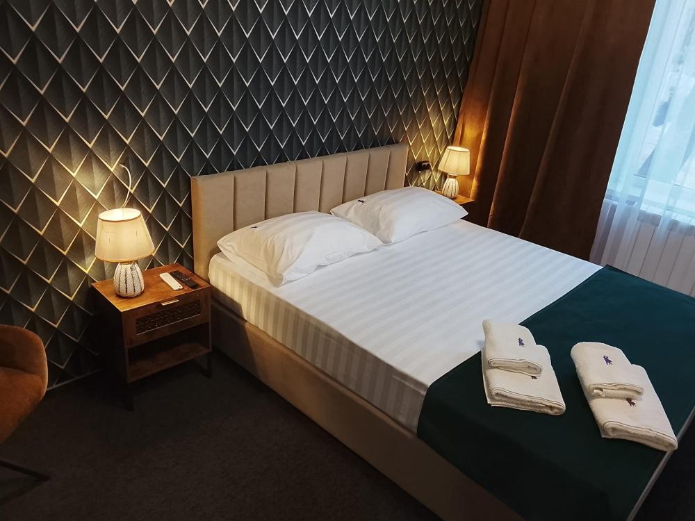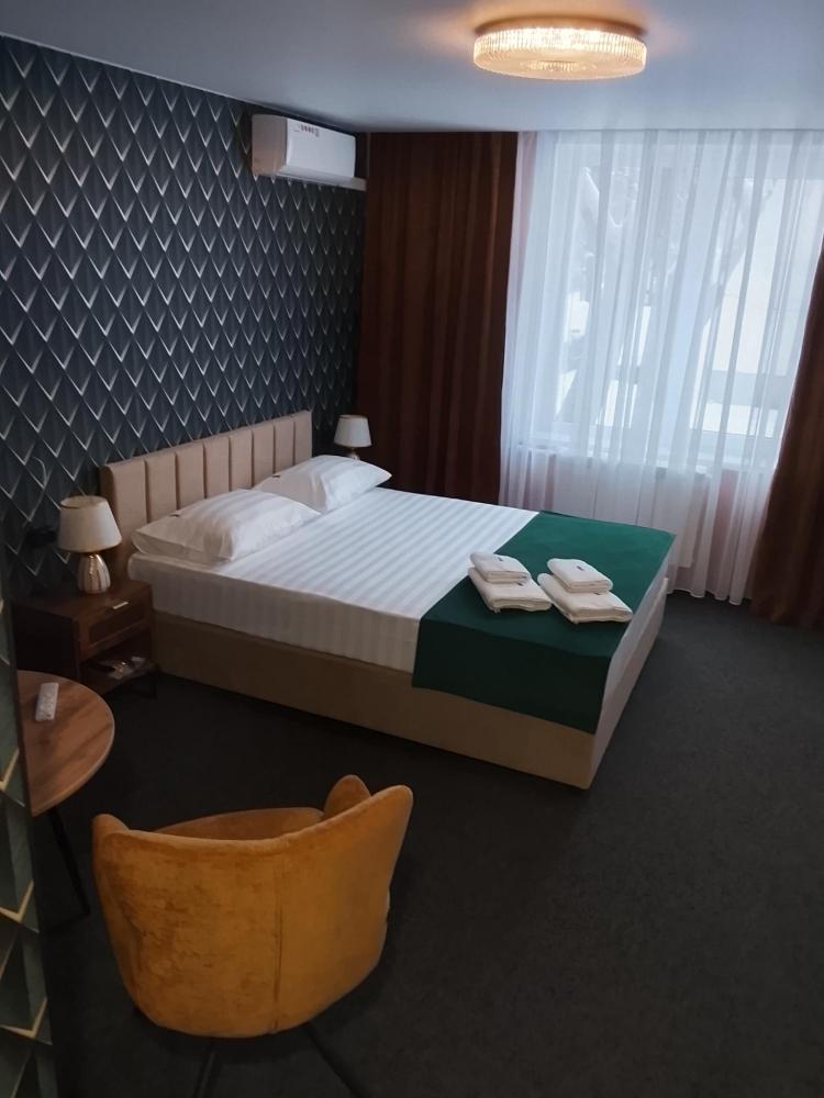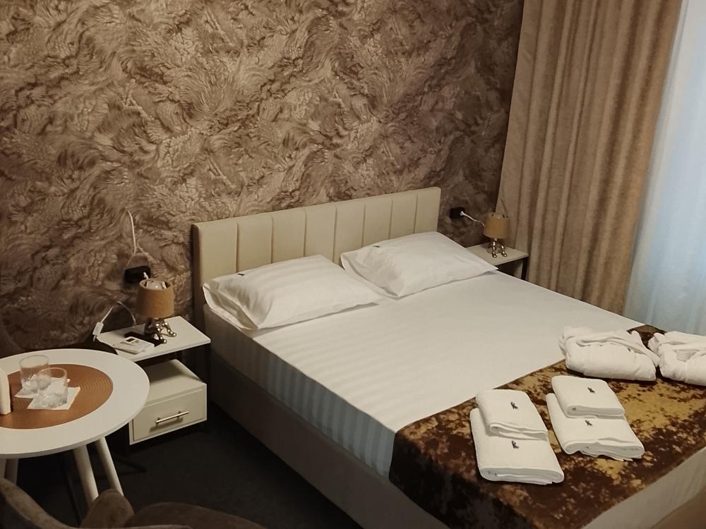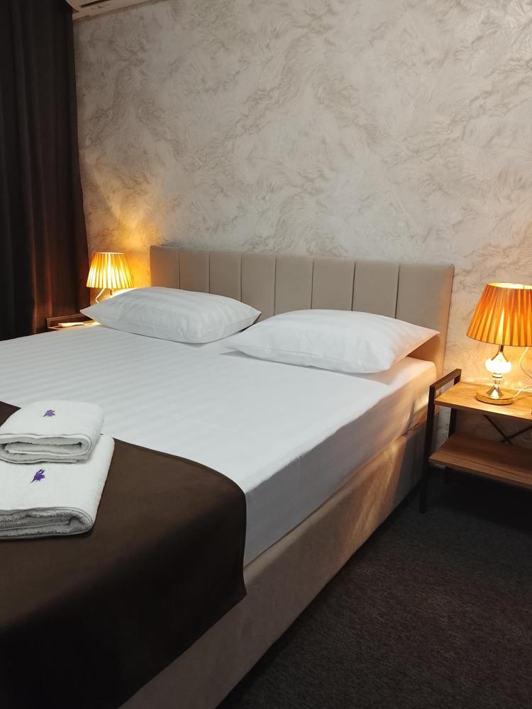 В номере есть большая плазменная панель, сплит-система, большая двуспальная кровать, прикроватные тумбочки, зона отдыха из двух стульев и стола, санузел с душевой кабиной, комплект полотенец, туалетные и ванные принадлежности, а также фен.