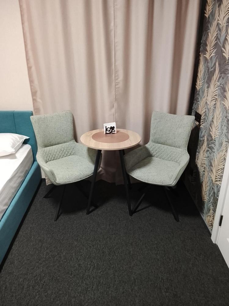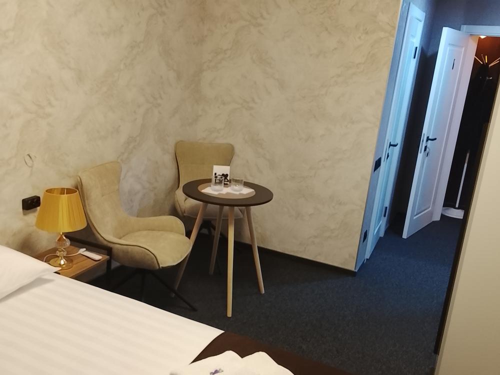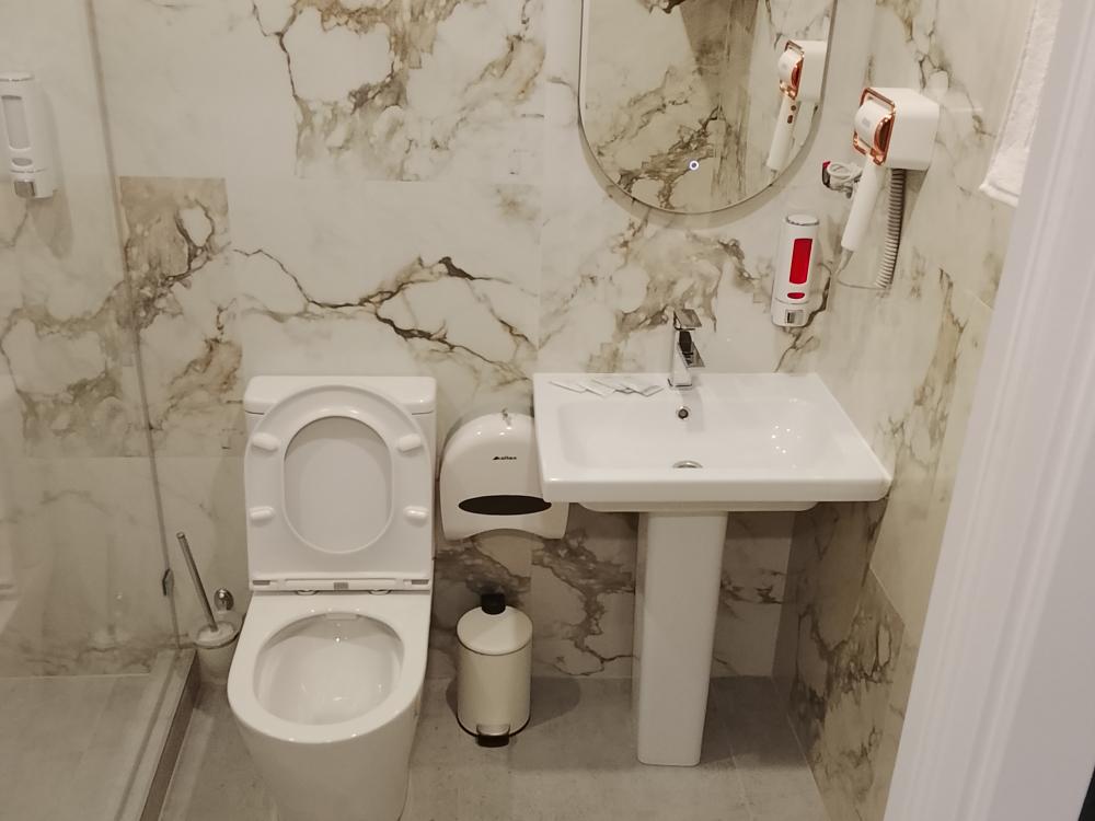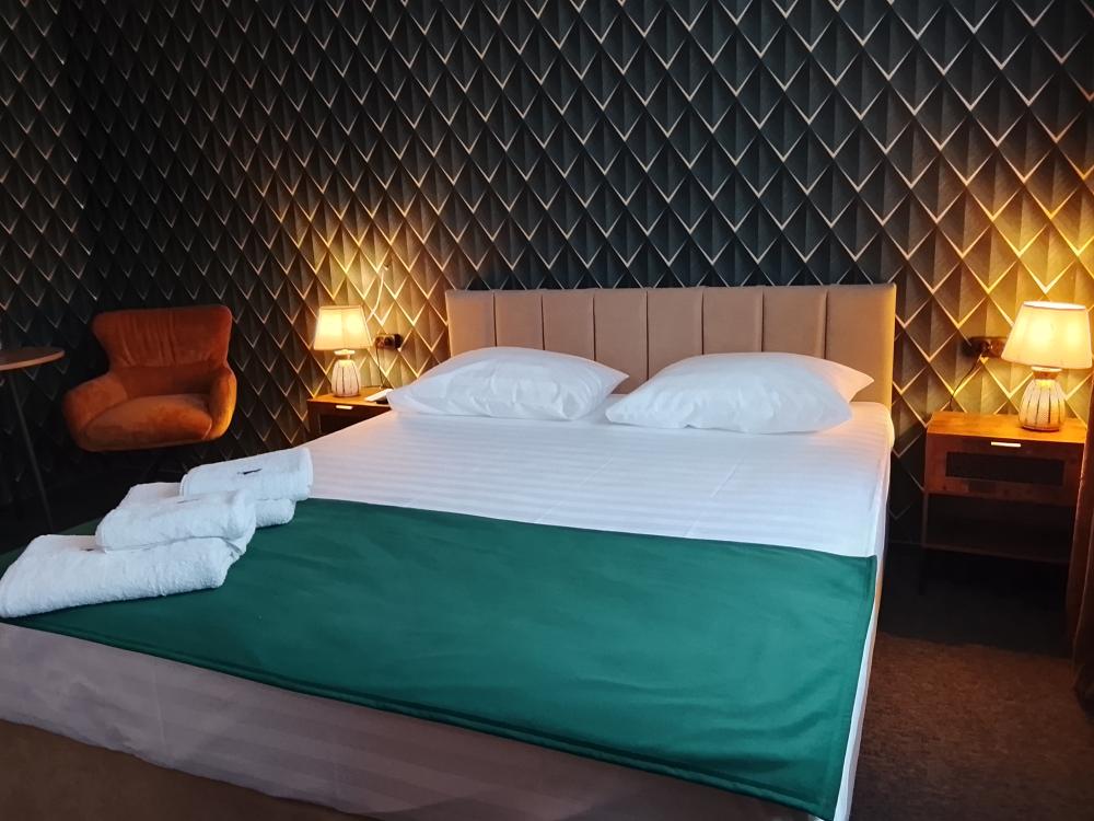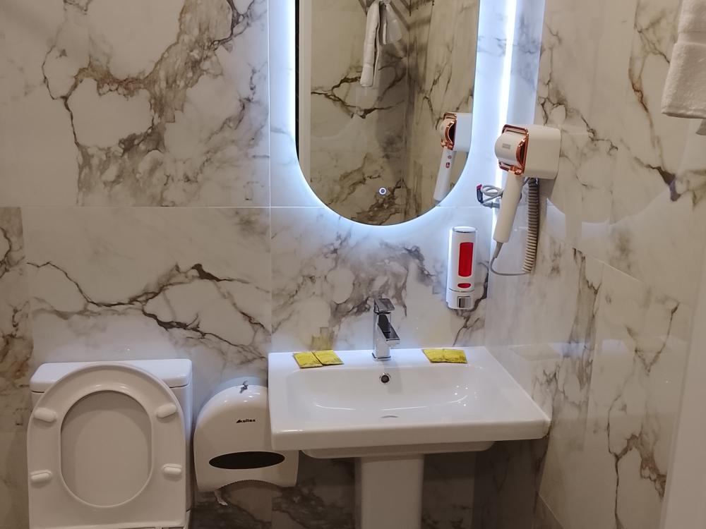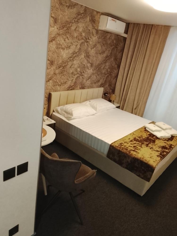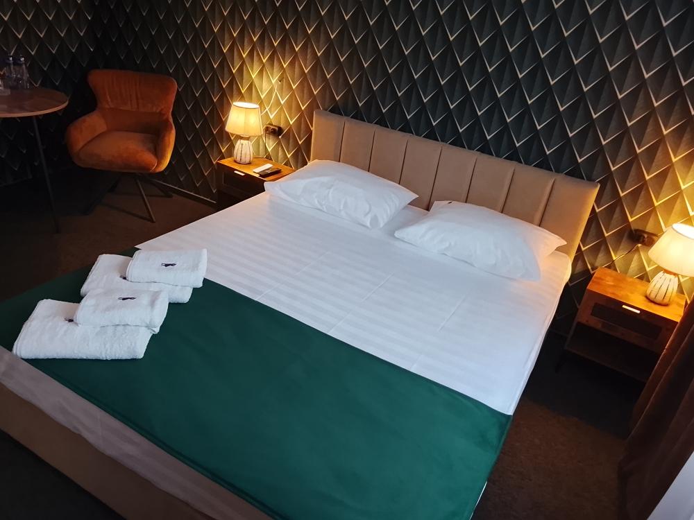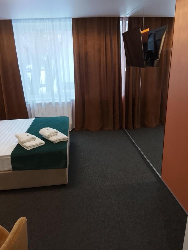 В номере есть большая плазменная панель, сплит-система, большая двуспальная кровать, прикроватные тумбочки, зона отдыха из двух стульев и стола, санузел с душевой кабиной, комплект полотенец, туалетные и ванные принадлежности, а также фен.