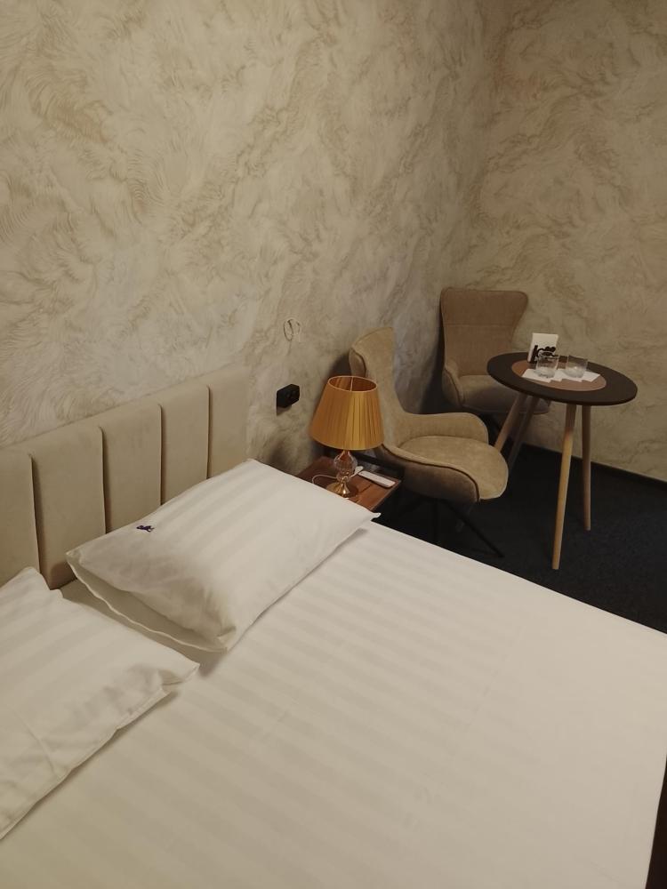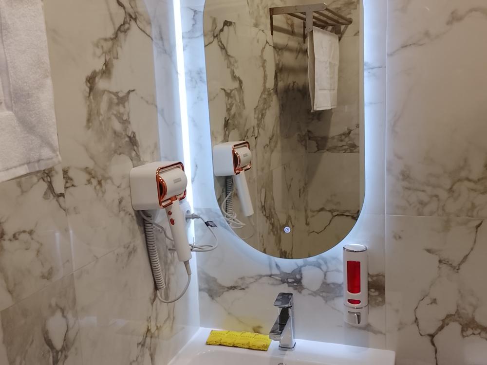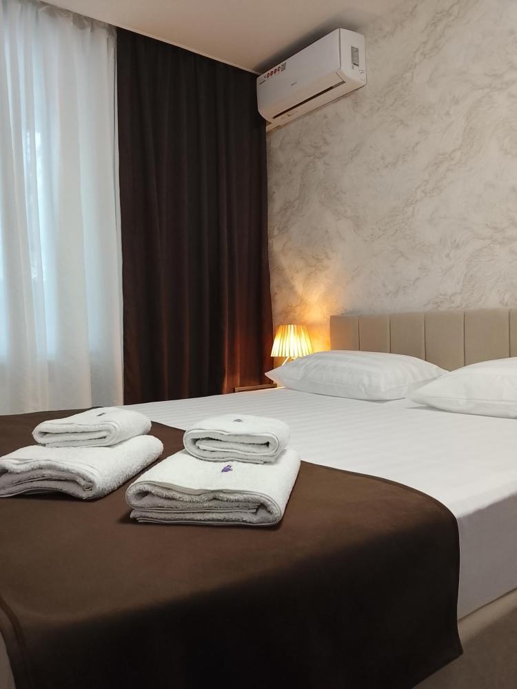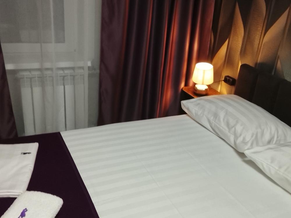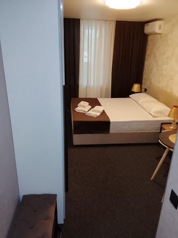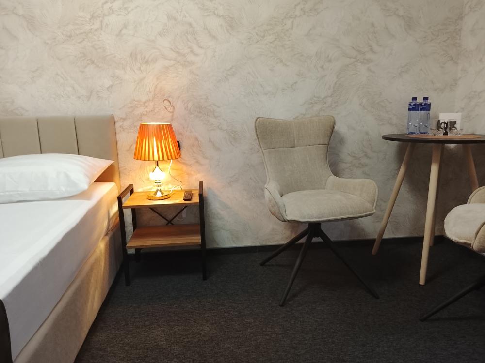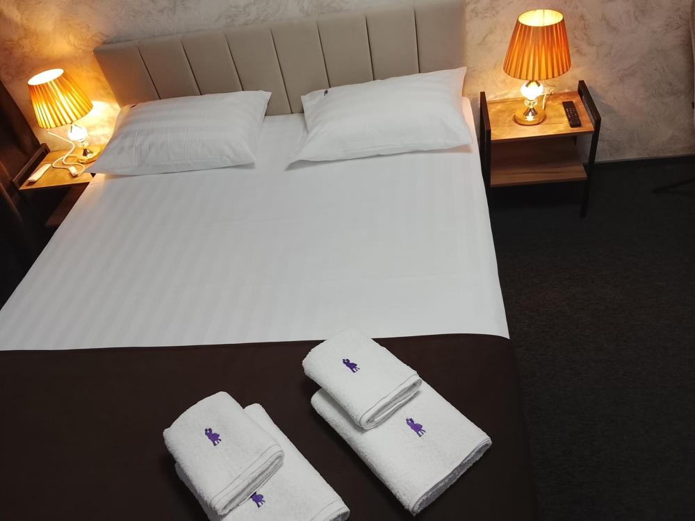 В номере есть большая плазменная панель, сплит-система, большая двуспальная кровать, прикроватные тумбочки, зона отдыха из двух стульев и стола, санузел с душевой кабиной, комплект полотенец, туалетные и ванные принадлежности, а также фен.