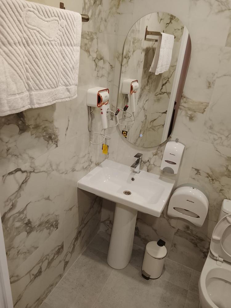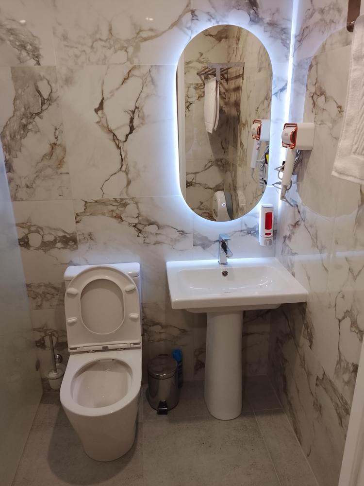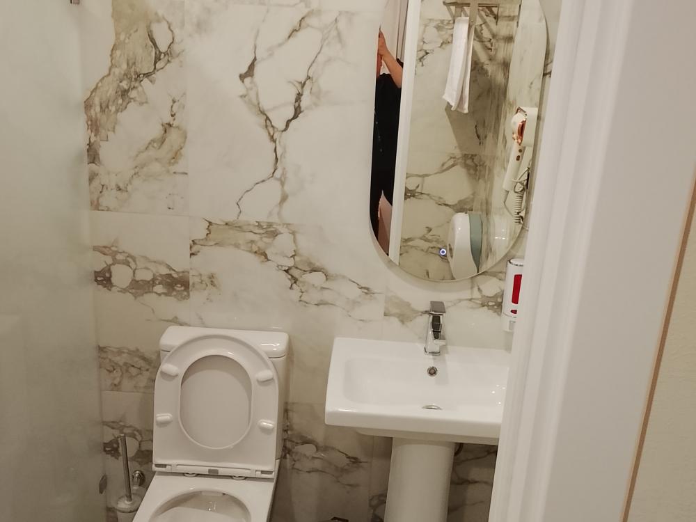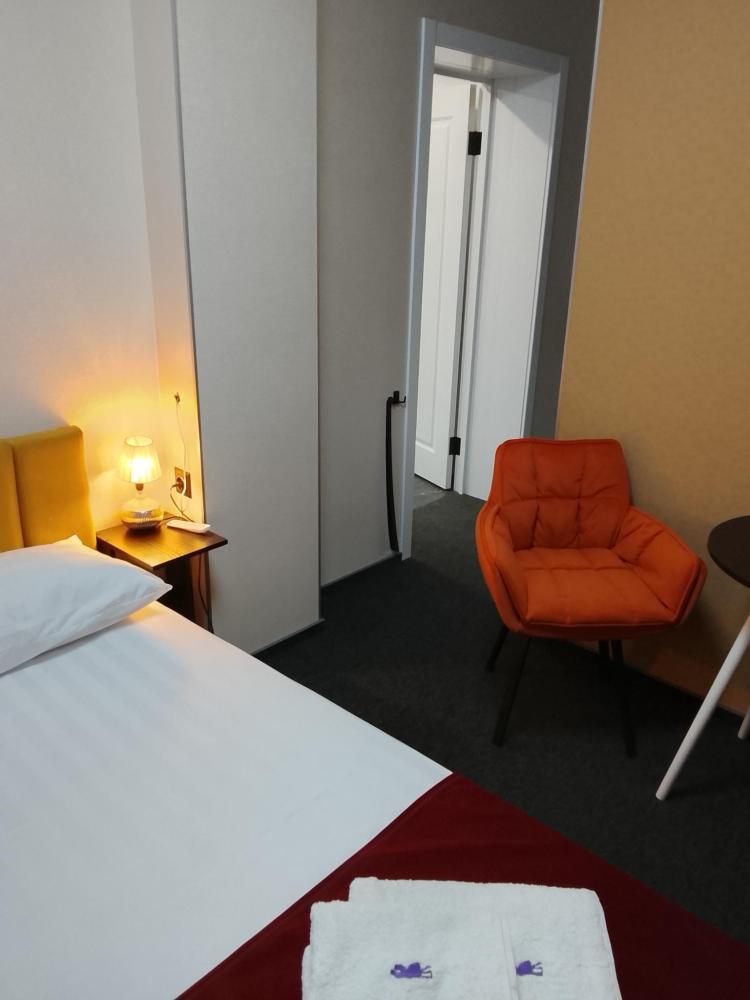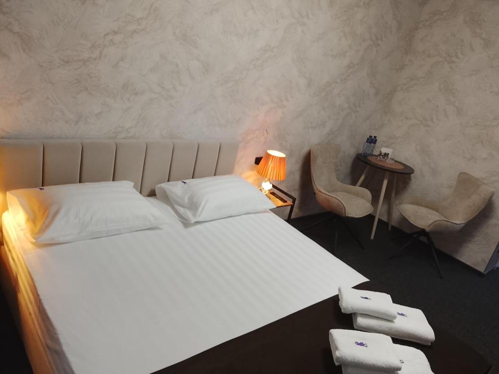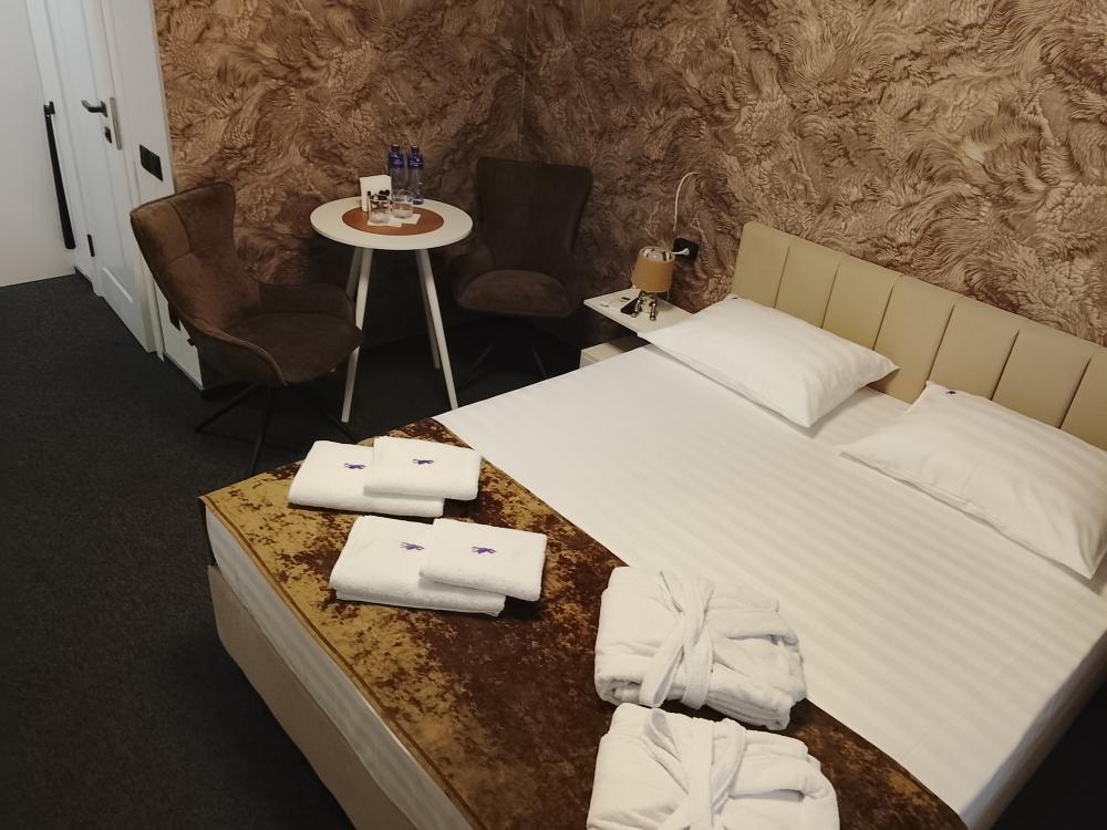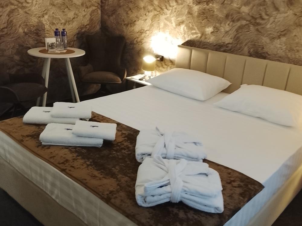 В номере есть большая плазменная панель, сплит-система, большая двуспальная кровать, прикроватные тумбочки, зона отдыха из двух стульев и стола, санузел с душевой кабиной, комплект полотенец, туалетные и ванные принадлежности, а также фен.