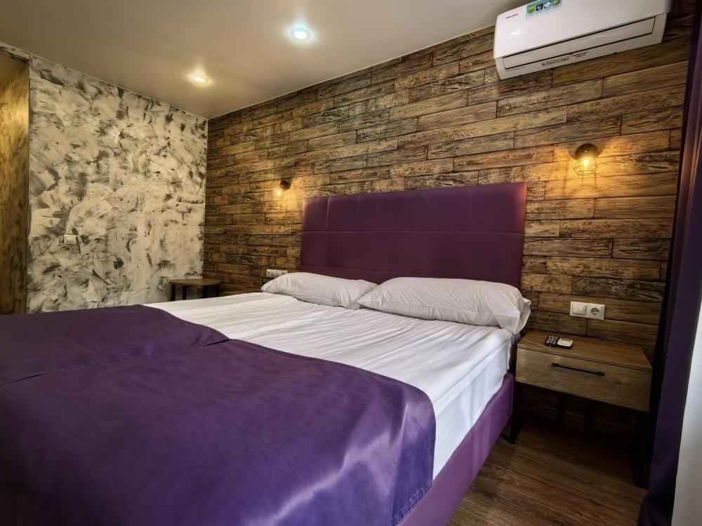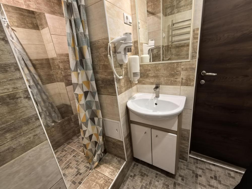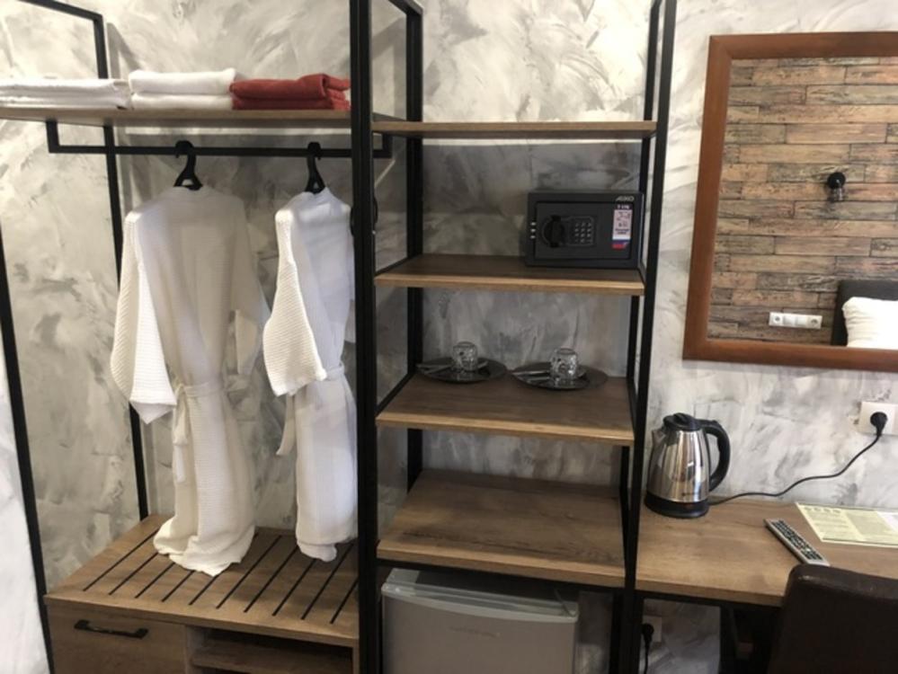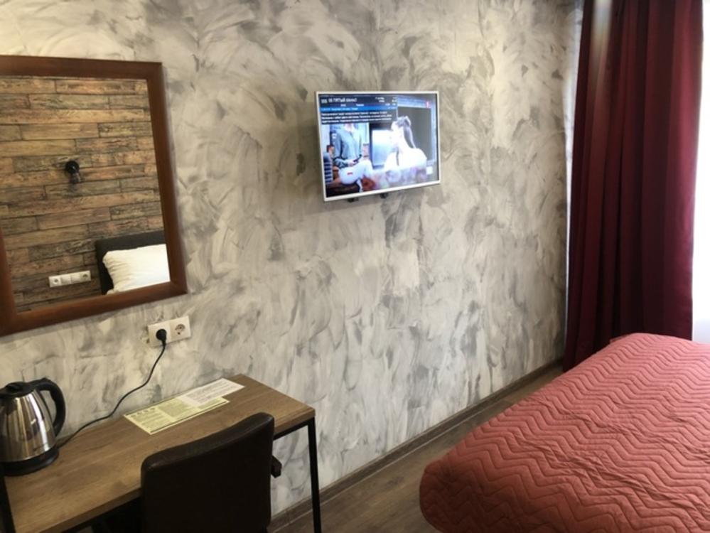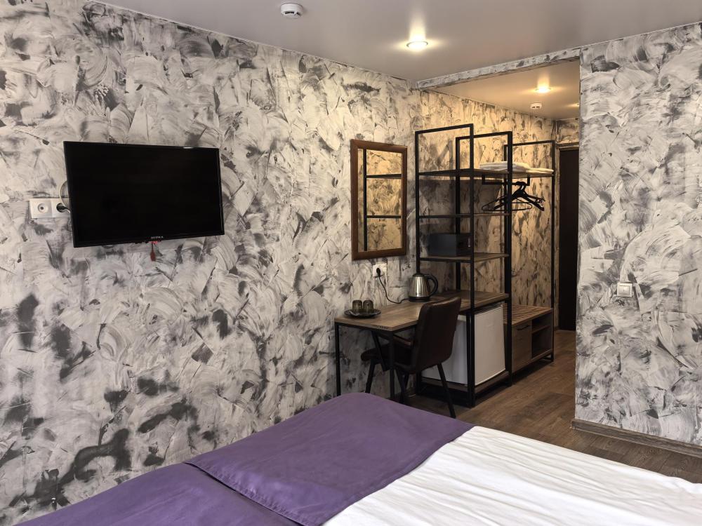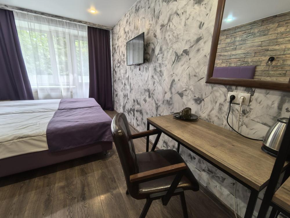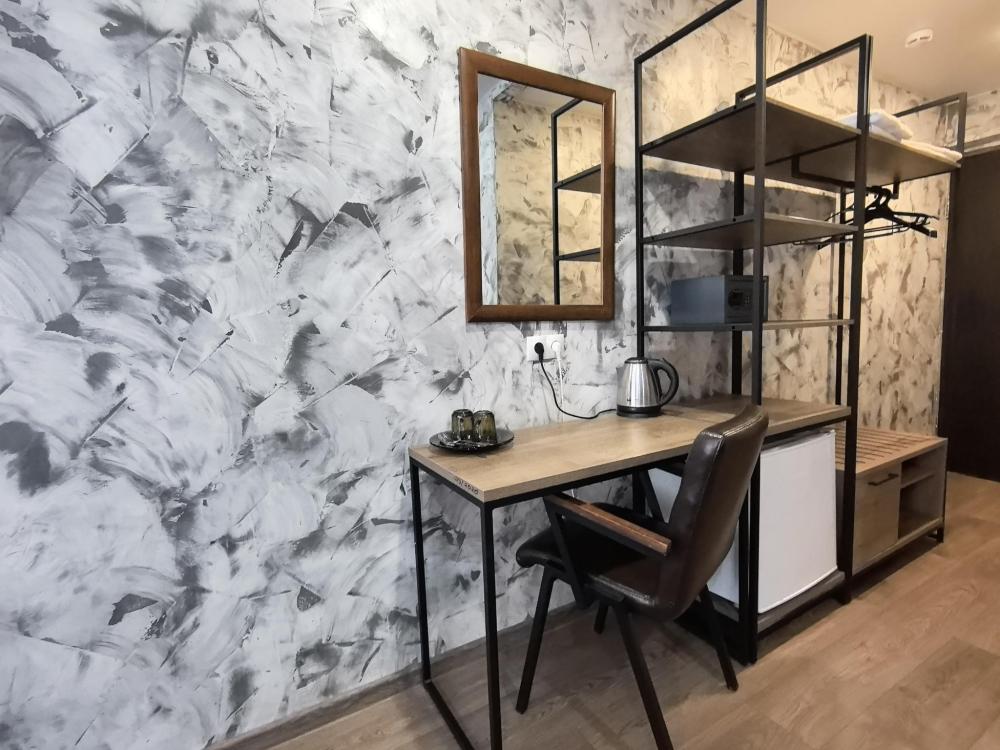 Однокомнатный номер Комфорт с двумя односпальными кроватями, оформлен в стиле лофт и оснащен всем необходимым для комфортного проживания 1-2 гостей с зоной отдыха с Wi-Fi и ЖК ТВ с диагональю более 32'. Общая площадь номера 19 квадратных метров, а также номер имеет балкон. В номере собственная просторная ванная комната 150х200 кв.м с просторным душем, зеркалом в полный рост.