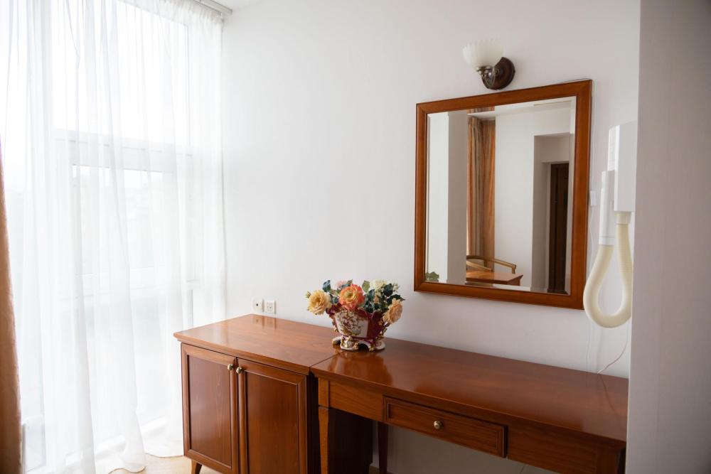 Трехкомнатный номер. В номере: спальная комната, кабинет, кухня-гостиная, гардеробная, два санузла, просторная ванная комната, бытовая техника, набор посуды, расширенный набор косметических аксессуаров, банные халаты, тапочки, картины, цветы и пр., индивидуальная система кондиционирования, телефон. бесплатный Wi-Fi, ТВ. Для гостей гостиницы доступна бесплатная парковка.