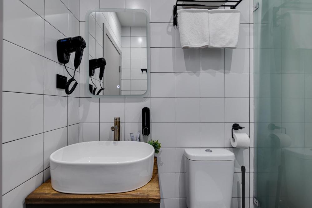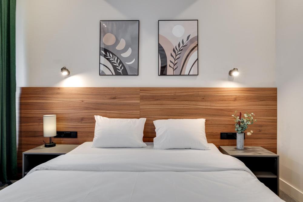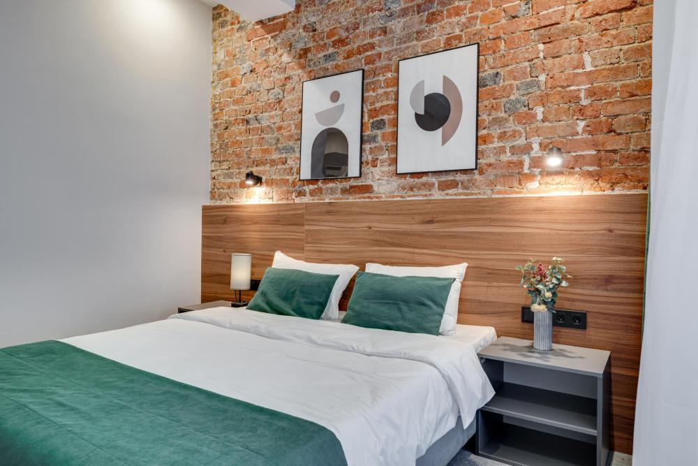 Современный номер в стиле лофт — идеальное сочетание уюта и городского характера. Кирпичная стена, мягкий свет и природные оттенки создают атмосферу спокойствия и расслабления. В номере: просторная двуспальная кровать индивидуальное освещение у изголовья, затемняющие шторы и лёгкий тюль, рабочая зона с розетками у кровати, стильный декор и картины в минималистичном дизайне. Идеален для отдыха после насыщенного дня в городе