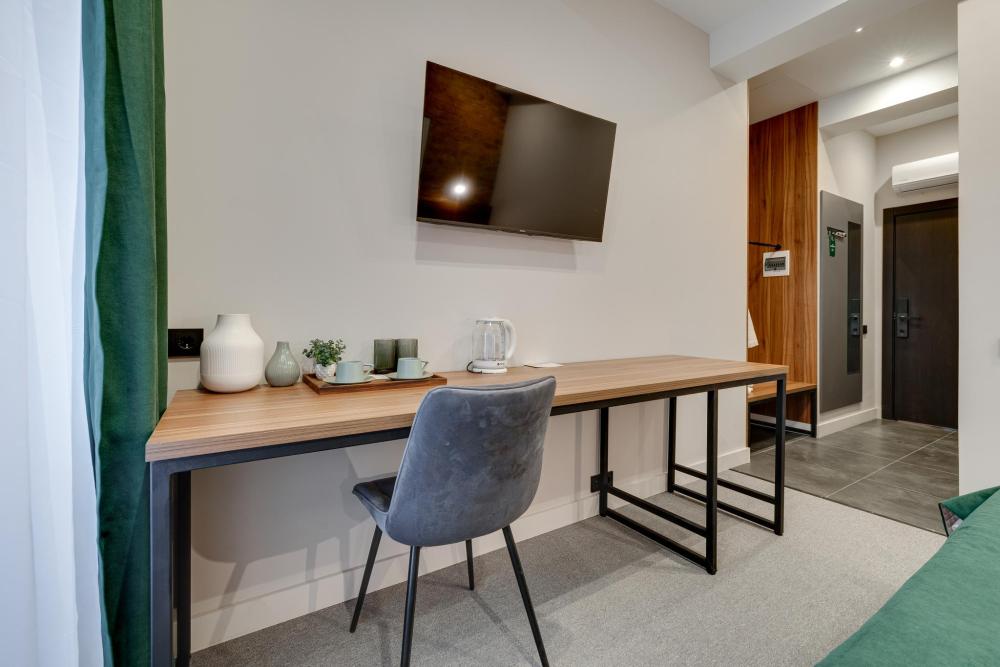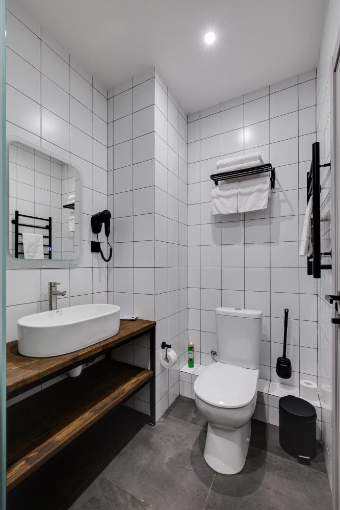 Номера данной категории – это современные, комфортные номера с лаконичным дизайном. Идеально подходят для кратковременных деловых поездок, а также молодых семейных пар. Письменный стол с удобным стулом предоставит комфортное рабочее место для бизнес-гостей отеля. В номере: одна двуспальная кровать с прикроватными тумбами, телевизор с плоским экраном, телефон, шкаф, зеркало, письменный стол со стулом, фен. В ванной комнате: халаты, полотенца, тапочки и туалетно-косметические принадлежности.