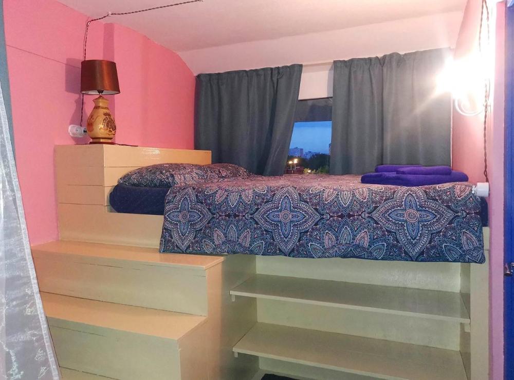 Двухкомнатный номер на 4-ом этаже с выходом в галерею. Кровать со ступенями. Окна выходят в парк и Кремль Измайлово. Ванная комната с душем, кровать, тумбочка, стулья.