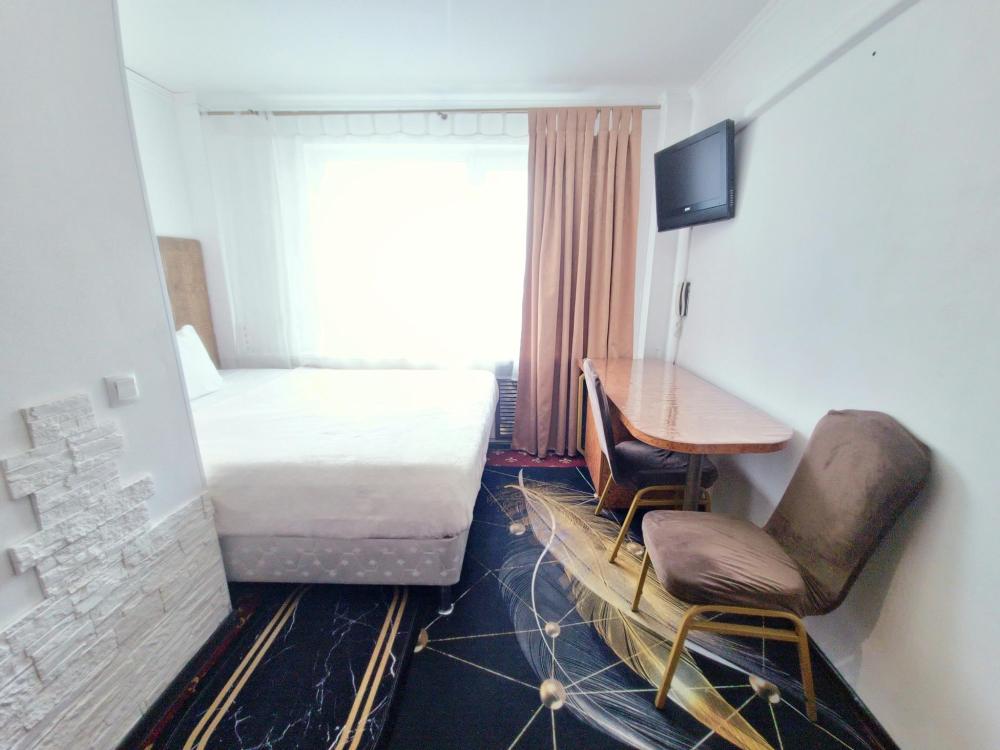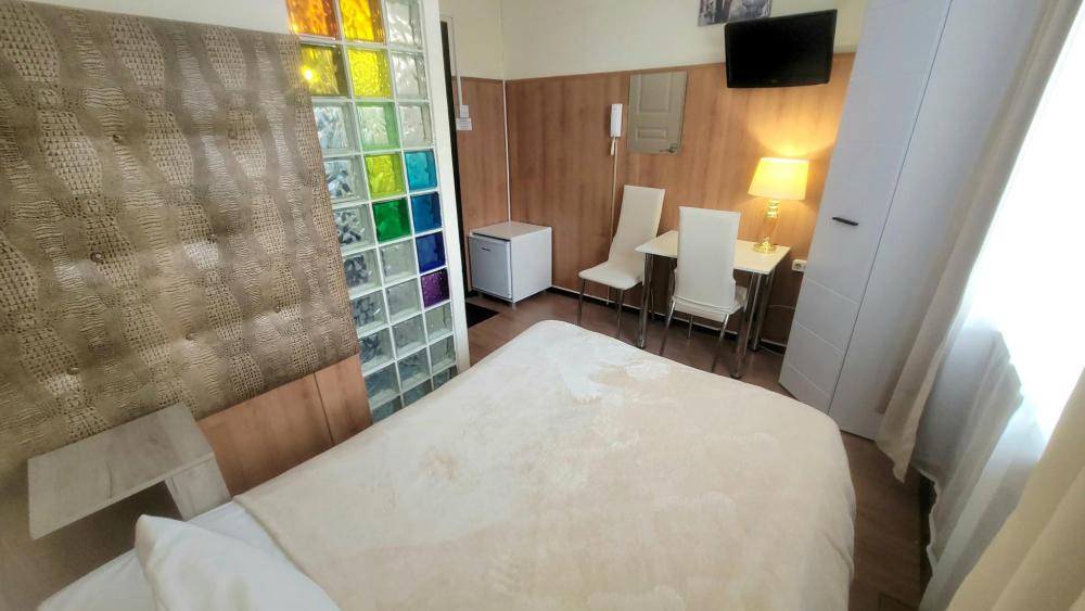 Номер категории «Номер c большой Qeen-size кроватью с собственной ванной комнатой» — Однокомнатный двухместный номер 18 м2, с кроватью Queen-size и двуспальным ортопедическим матрасом. Каждый номер оборудован современной мебелью: двухстворчатый шкаф купе стол-бар с встроенным баром холодильником индивидуальной комплектации, кровать с ортопедическими матрасом, 100 % натуральное высококачественное пастельное белье, комплекты натуральных 100% хлопковых махровых полотенец наилучшего качества , одноразовые тапочки. Номер оборудован системой звукоизоляции, включающей в себя двойные двери ,3х камерные термо- звукоизоляционные стеклопакеты с москитными сетками и открывающейся створкой. ЖК-телевизор, бесплатный Wi-FI, кондиционер, регулируемое освещение, кнопка экстренного вызова администрации, Интерком, а также датчиками противопожарной сигнализации и рециркулятором воздуха. просторная собственная Ванная комната , полный комплект гигиенических принадлежностей: шампуни ,гели, й мыло, фен .
