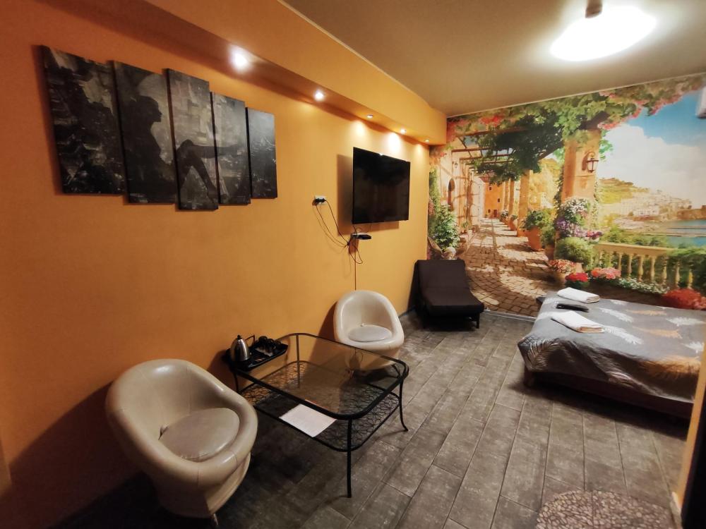 2‑х комнатный номер повышенной комфортности с одной двуспальной кроватью 180х200 и раскладным диваном готов принять до 4х человек. (возможна установка раскладной кровати для 5-го человека). Идеальное сочетание комфорта и функциональности. Наполнение каждого номера включает: большая двухспальная кровать; раскладной диван; кондиционер; шкаф, столик; 4 стула; ЖК телевизор; телефонная связь; беспроводной интернет (Wi-Fi); В номере ванная комната, с необходимыми одноразовыми принадлежностями, набором полотенец.