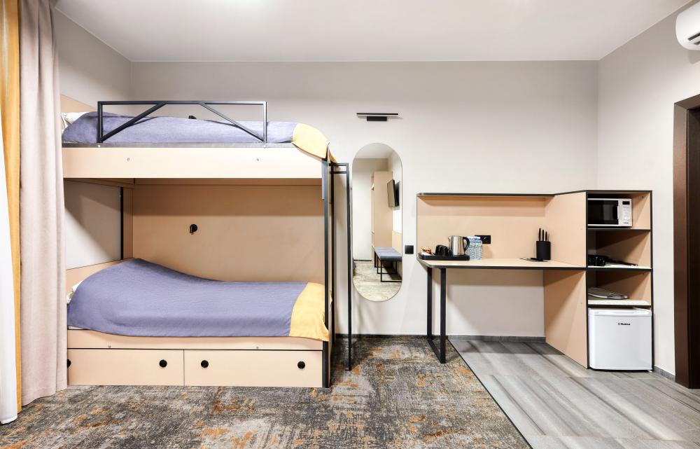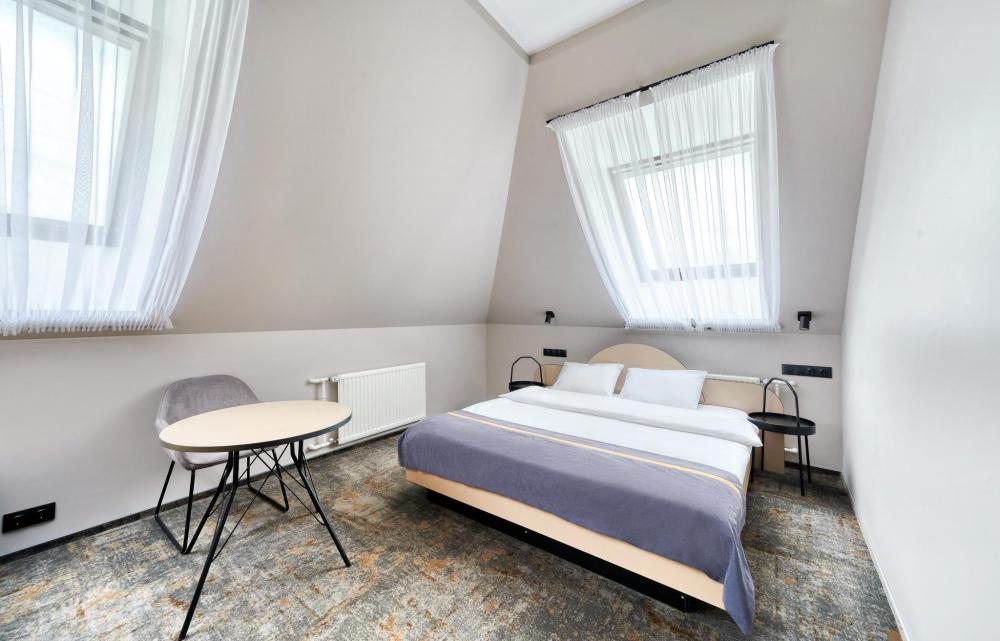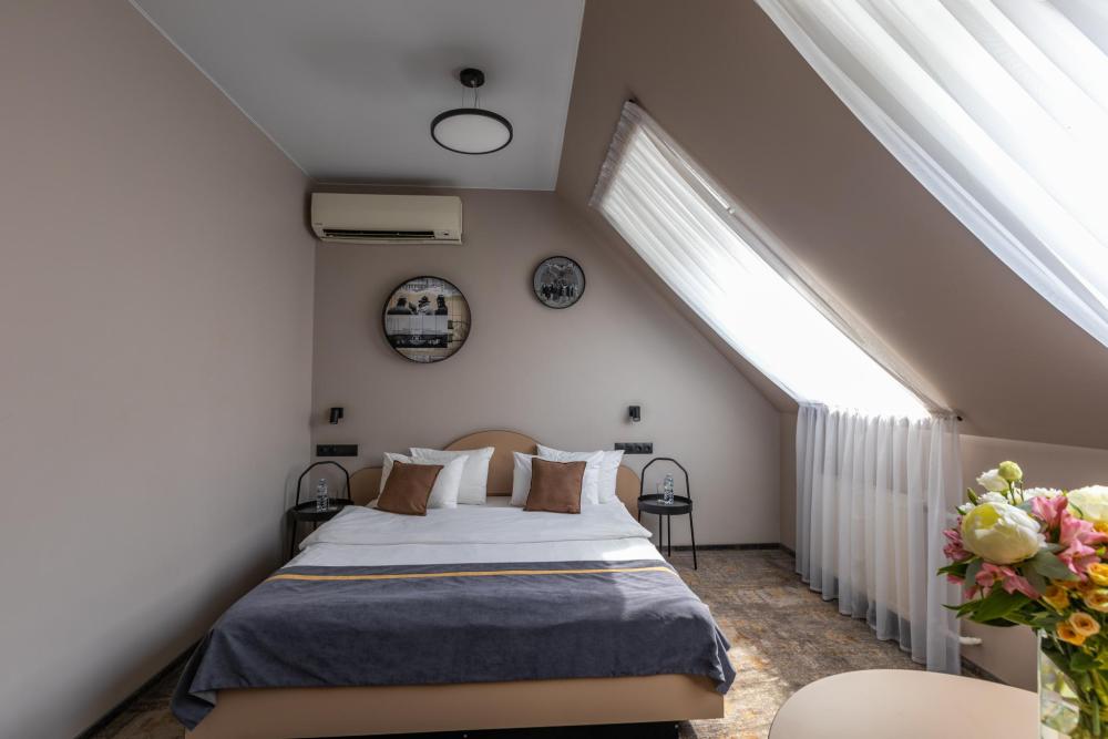 Просторный однокомнатный номер с кондиционером, выполненный в спокойной цветовой гамме, располагает к отдыху после долгих экскурсий и насыщенного дня. 1 двуспальная большая кровать. Каждый номер оборудован собственной ванной комнатой с душем. Каждому гостю предоставляются туалетные принадлежности, полотенца и тапочки.