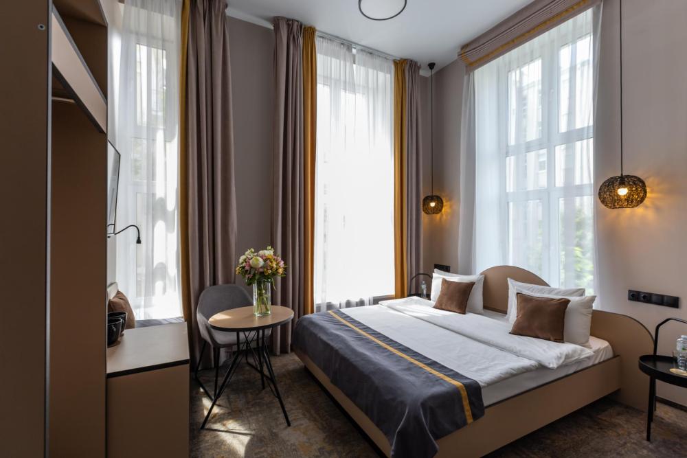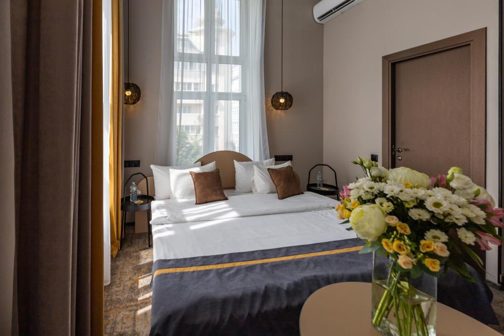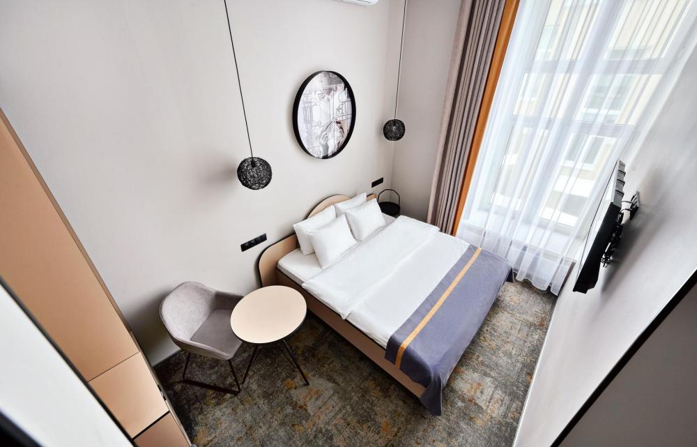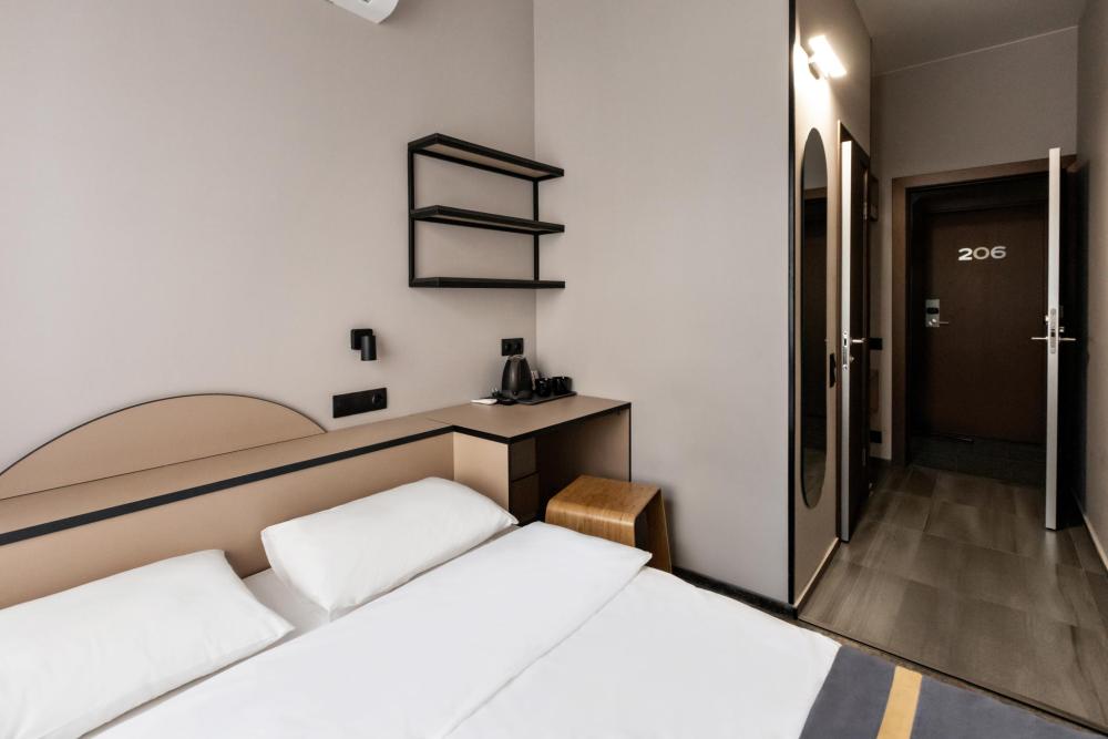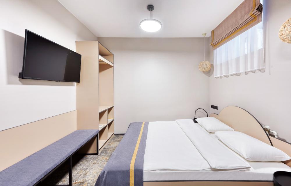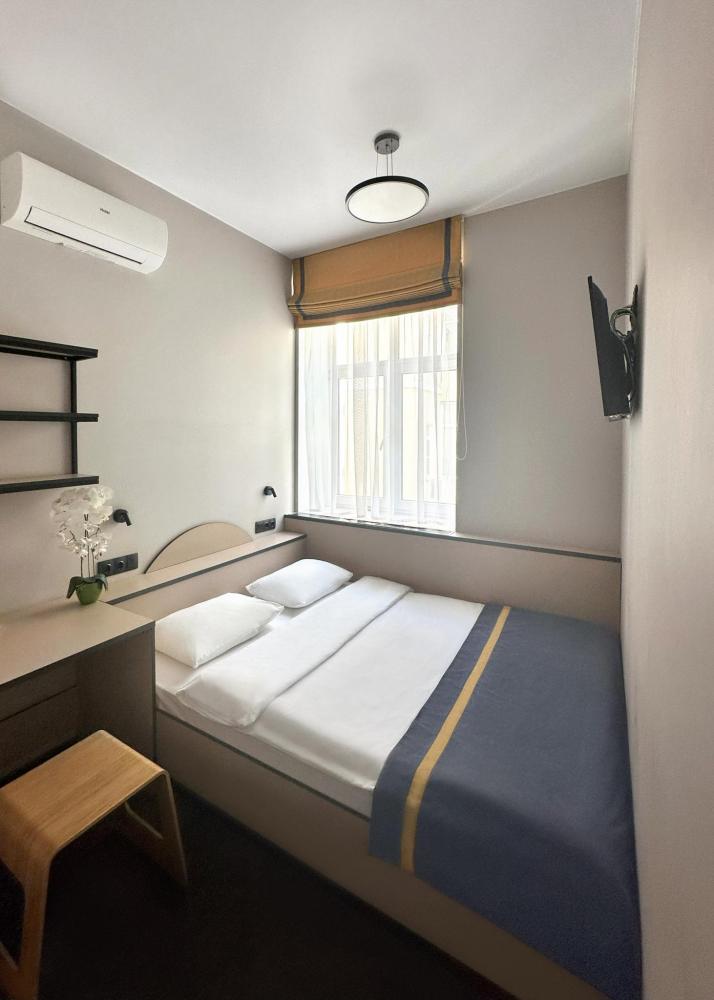 Уютный однокомнатный номер с кондиционером, выполненный в спокойной цветовой гамме, располагает к отдыху после долгих экскурсий и насыщенного дня. 1 двуспальная кровать. Каждый номер оборудован собственной ванной комнатой с душем. Каждому гостю предоставляются туалетные принадлежности, полотенца и тапочки.