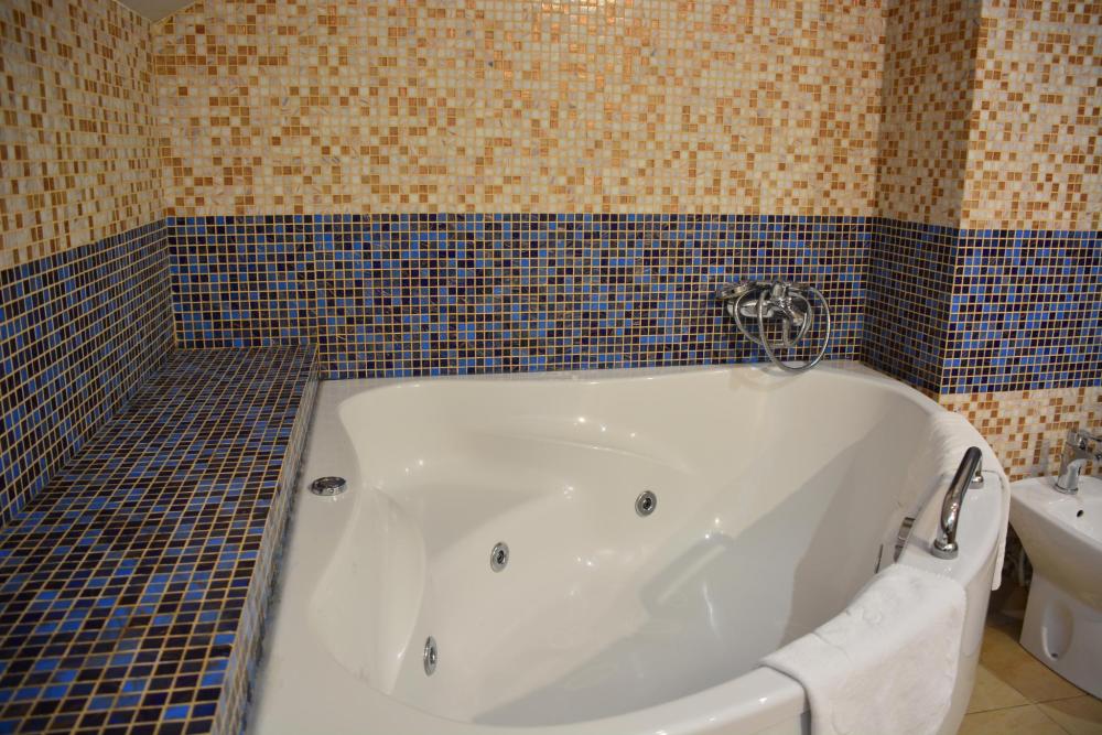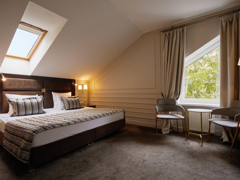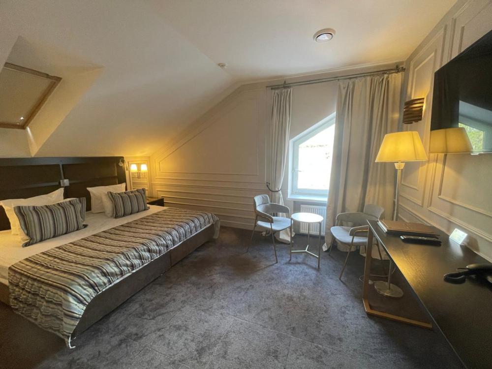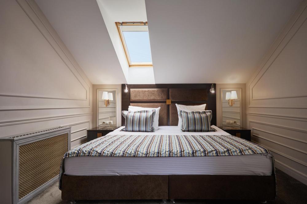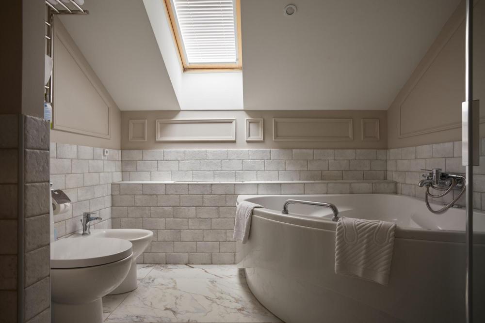 Номер площадью 30м с большой кроватью и гидромассажной ванной. Возможен для свадеб и романтичной встречи. Номер размещен на 3 этаже с красивыми мансардными окнами. Номер оснащен: ТВ с плоским экраном, феном, мини-холодильником, чайными принадлежностями, бутилированной водой, чаем, зубными наборами, мыльно-бритвенными принадлежностями, гелем, шампунем, тапочками, белыми полотенцами.