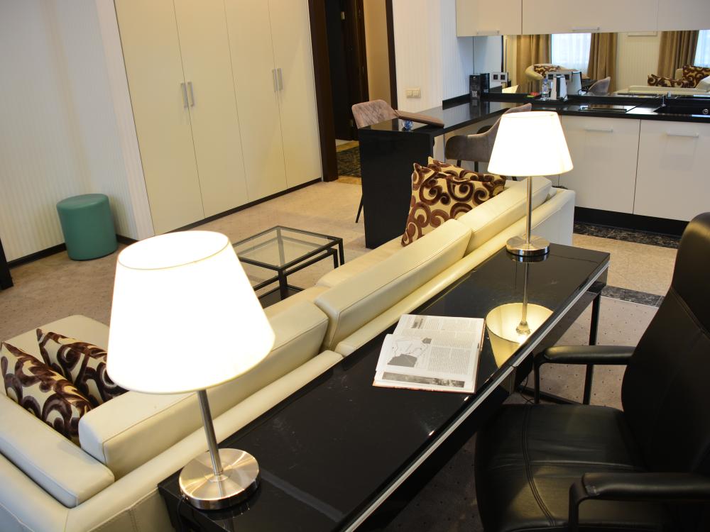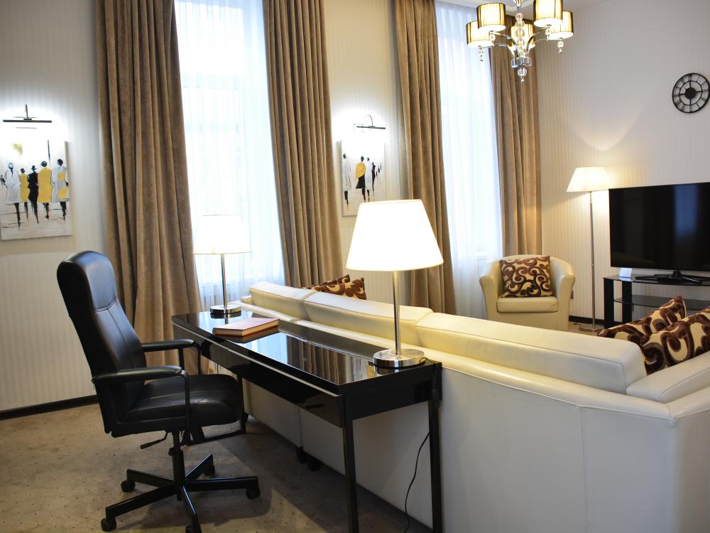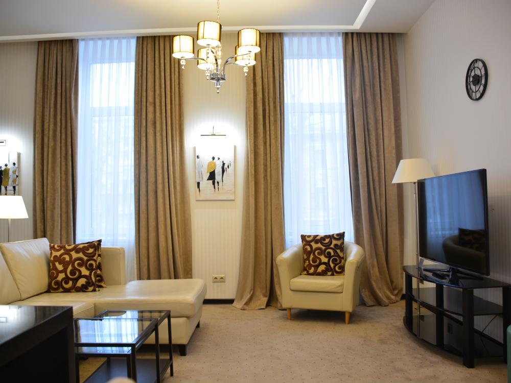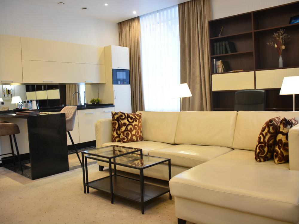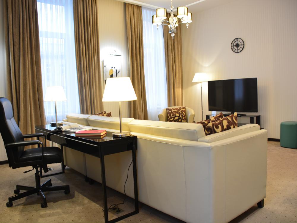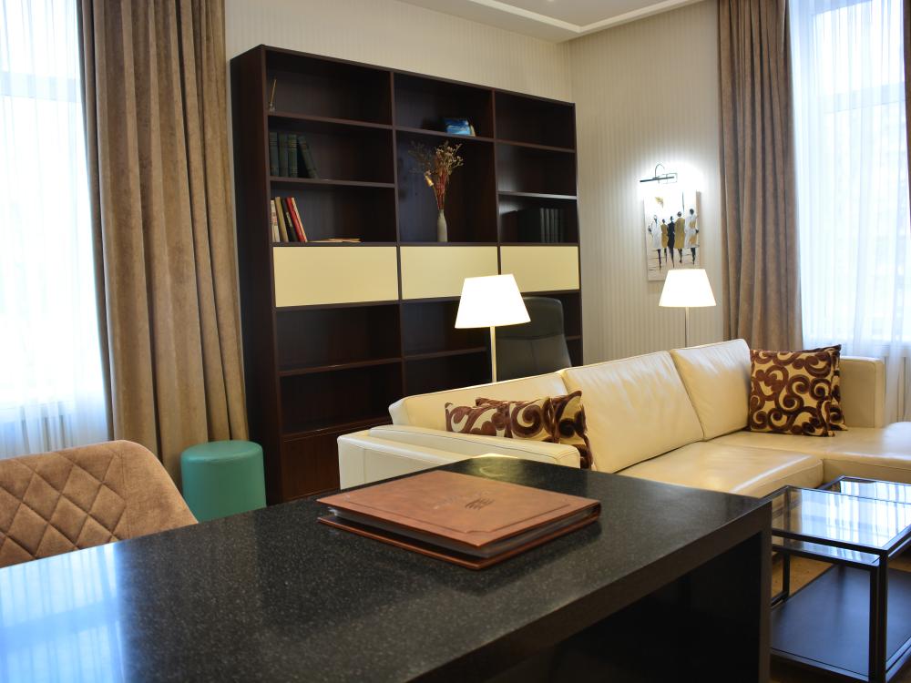 Уютные двухкомнатные апартаменты. В номере: спальная комната с двуспальной кроватью, гостиная, совмещенная с кухней, диван, кресло, шкаф-купе, гардероб, комод, два телевизора с плоским экраном, Wi-Fi, телефон, рабочий стол, сейф, расширенный набор косметических принадлежностей, тапочки, халаты.