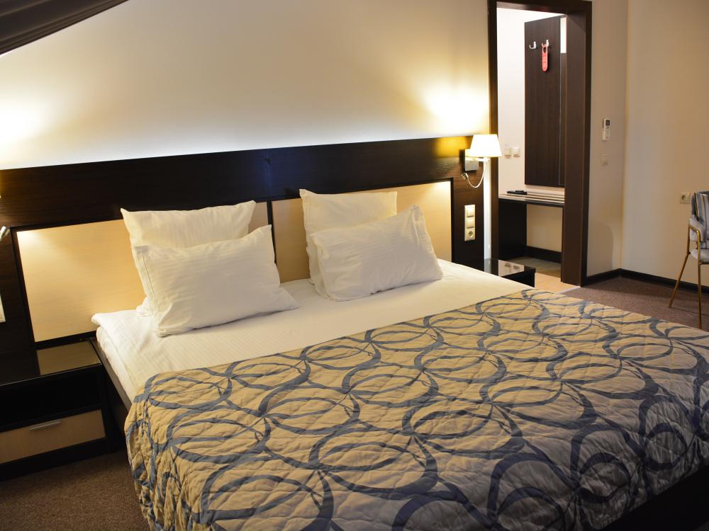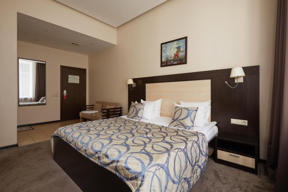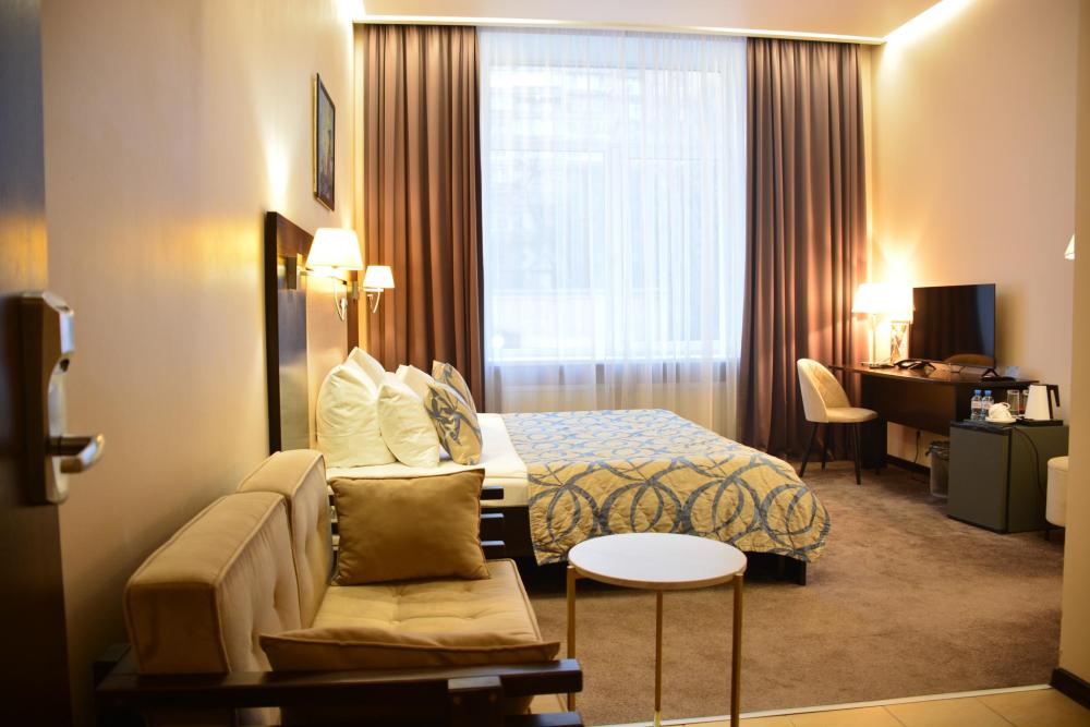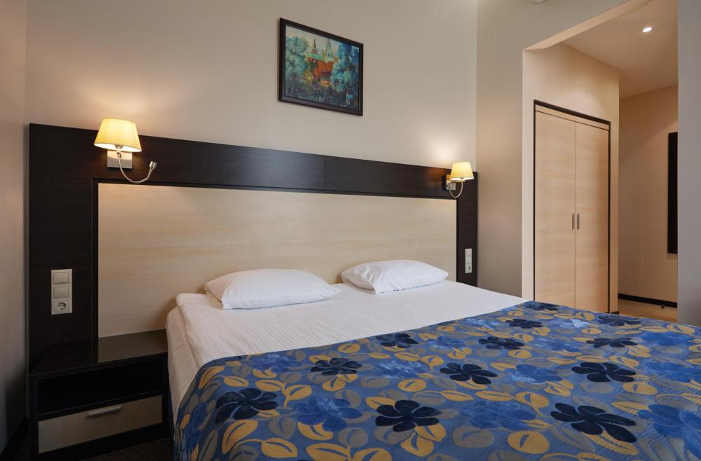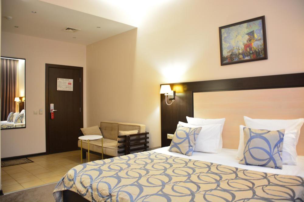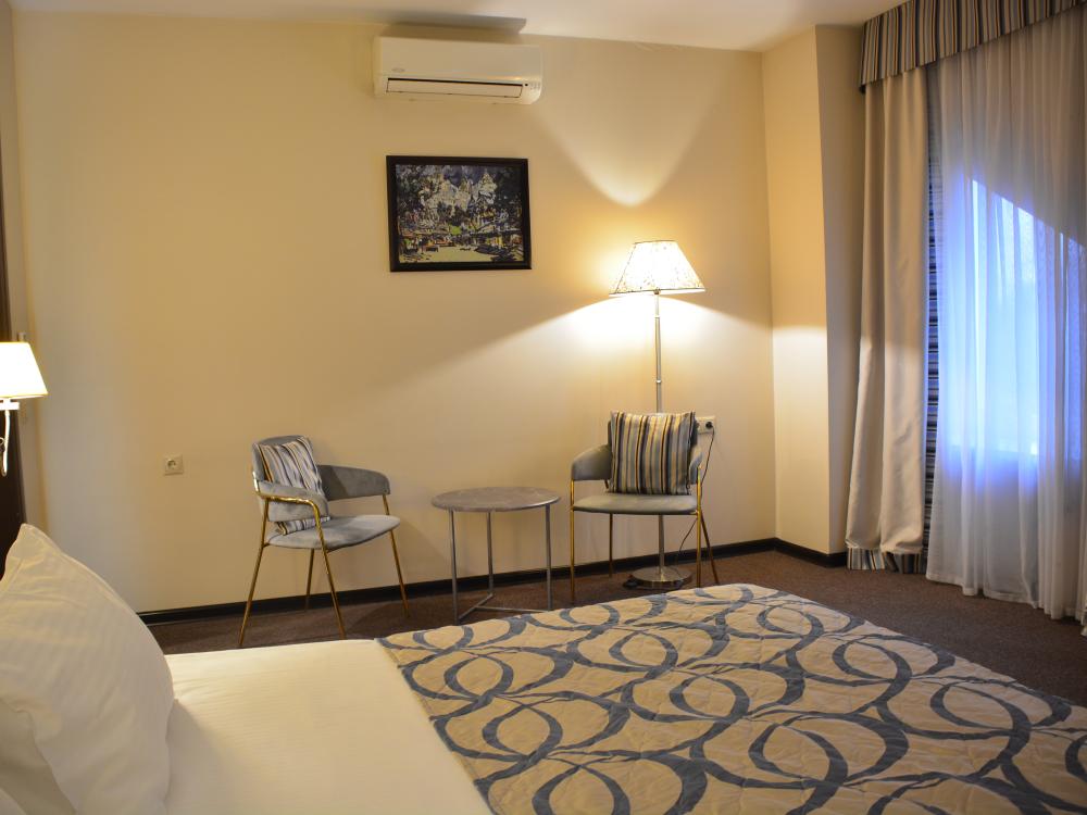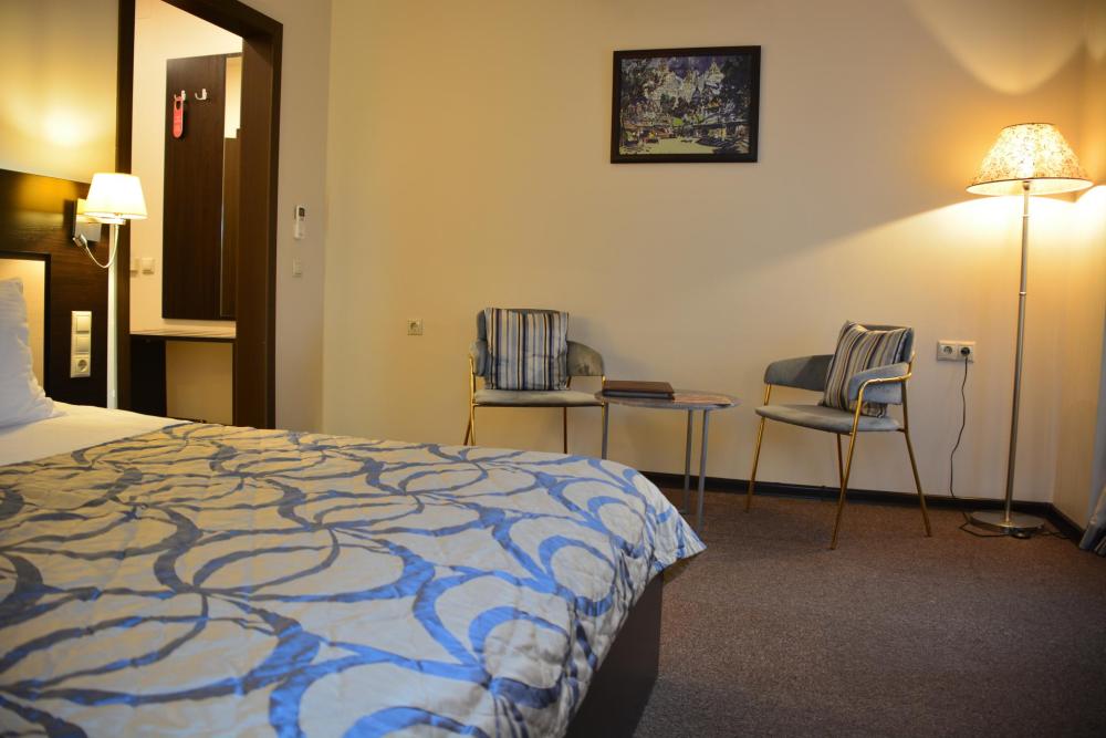 Однокомнатный номер с одной двуспальной кроватью. В номере: двуспальная кровать с ортопедическим матрасом, софа, шкаф-купе, Wi-Fi, телевизор-ЖК, телефон, сейф, чайный набор, мини-холодильник, кондиционер, расширенный набор косметических принадлежностей, тапочки, фен.