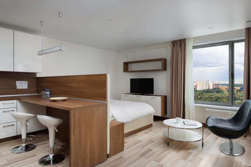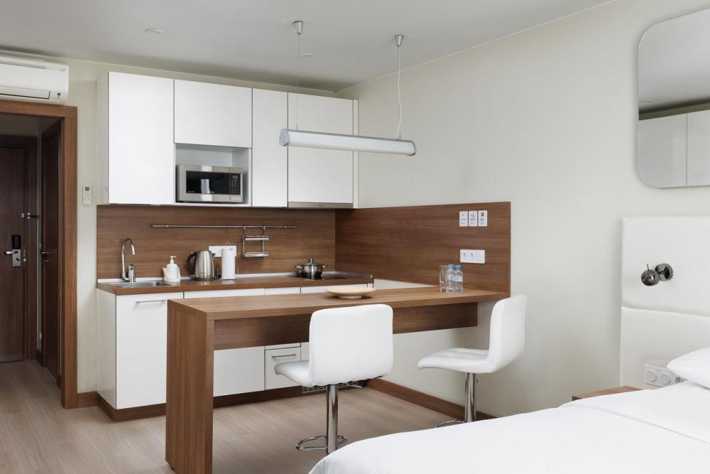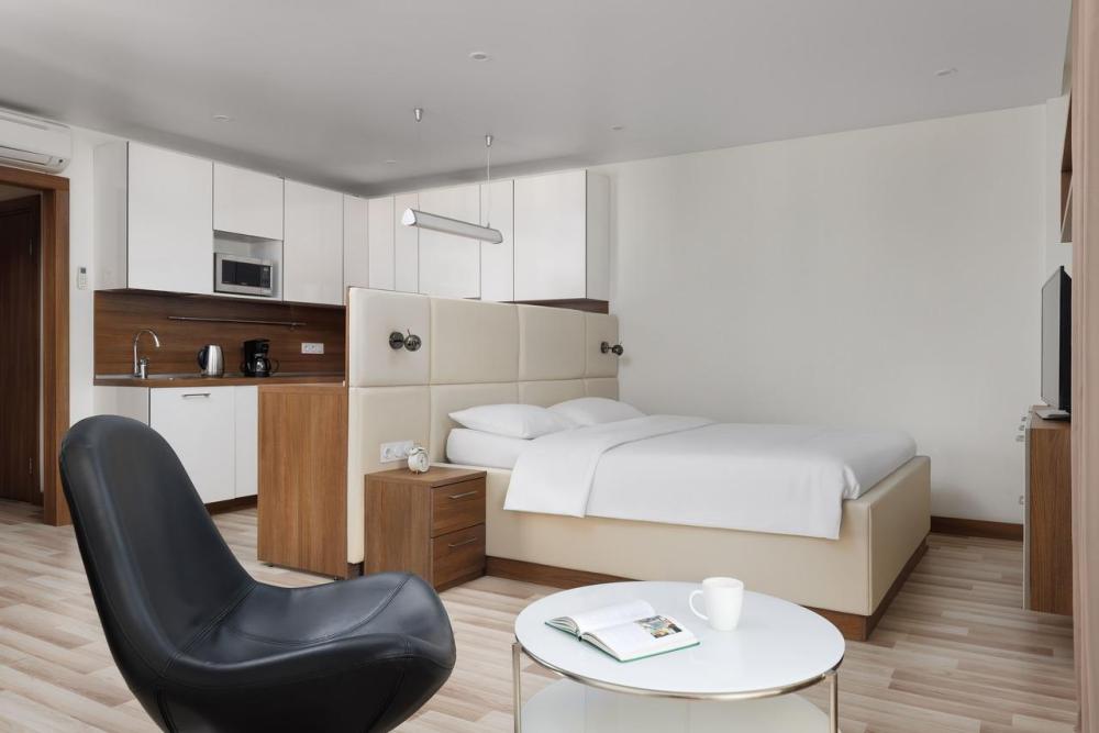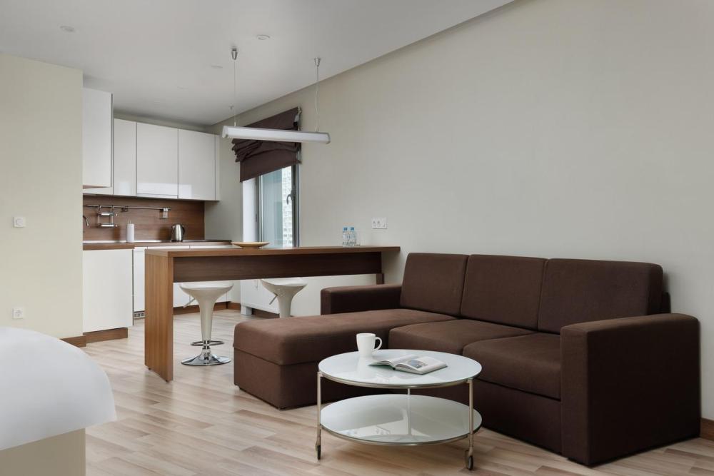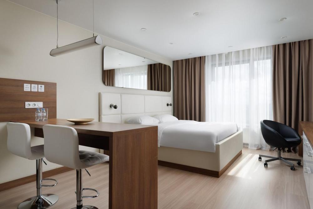 Апартаменты категории Superior идеально подойдут для проживания 1-2 человек. Интерьеры апартаментов выполнены в спокойных бежево-коричневых тонах. Кухня оснащена встроенной бытовой техникой от ведущих европейских производителей: микроволновая печь, холодильник, керамическая варочная панель, стиральная машина. В обеденной зоне располагается стол на несколько персон и комфортабельные смарт-стулья, которые легко подстраиваются под вас. В зоне гостиной располагается двуспальная кровать с ортопедическим матрасом и подъемным механизмом. Для работы оборудовано специальное место с рабочим столом и комфортабельным креслом.