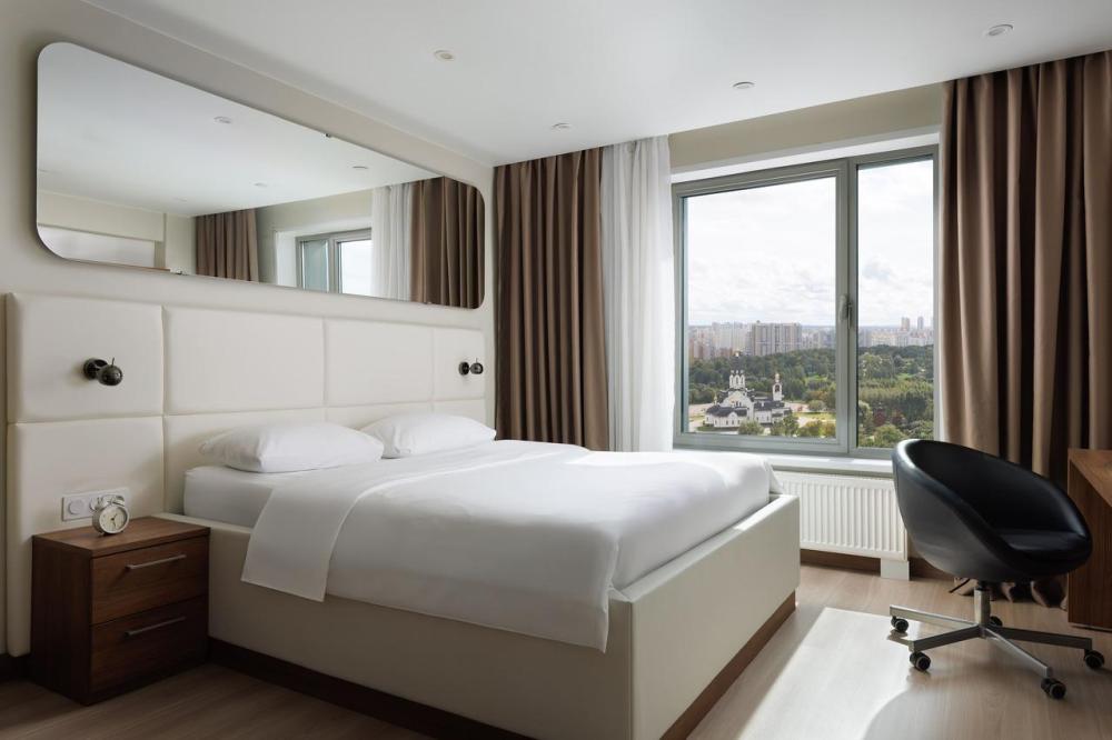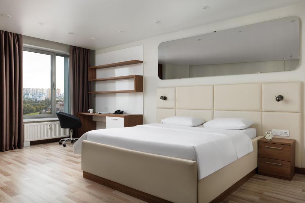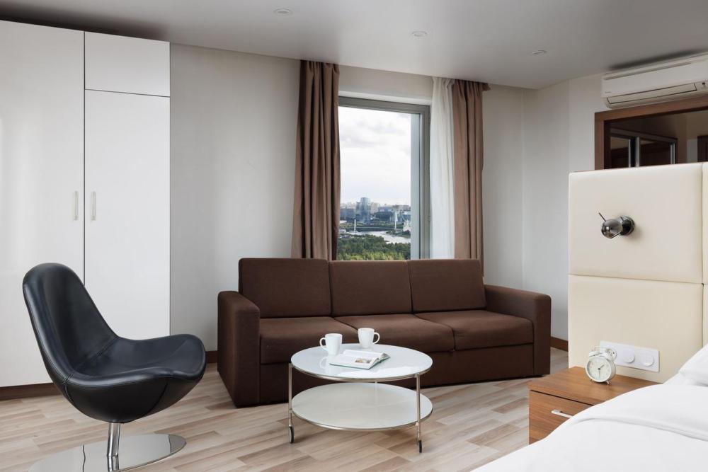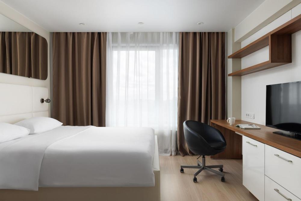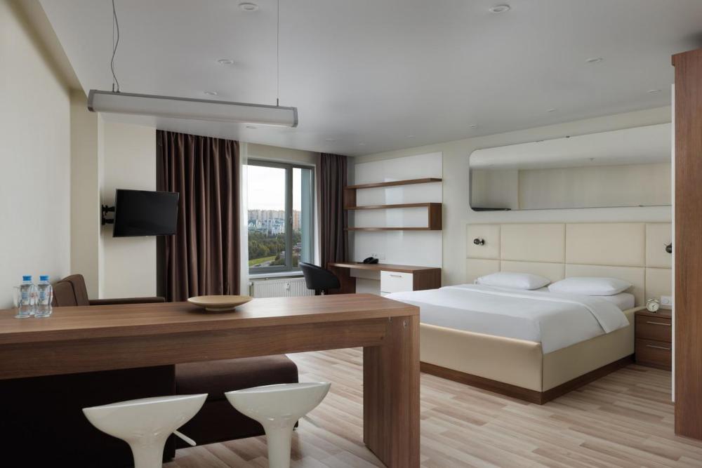 Апартаменты категории Superior идеально подойдут для проживания 1-2 человек. Интерьеры апартаментов выполнены в спокойных бежево-коричневых тонах. Кухня оснащена встроенной бытовой техникой от ведущих европейских производителей: микроволновая печь, холодильник, керамическая варочная панель, стиральная машина. В обеденной зоне располагается стол на несколько персон и комфортабельные смарт-стулья, которые легко подстраиваются под вас. В зоне гостиной располагается двуспальная кровать с ортопедическим матрасом и подъемным механизмом. Для работы оборудовано специальное место с рабочим столом и комфортабельным креслом.